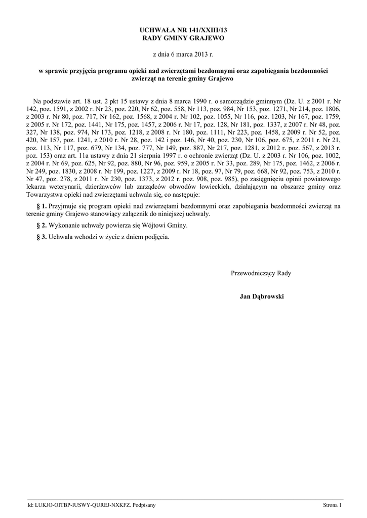 UCHWAŁA NR 141/XXIII/13 RADY GMINY GRAJEWO z dnia 6 marca 2013 r. w sprawie przyjęcia programu opieki nad zwierzętami bezdomnymi oraz zapobiegania bezdomności zwierząt na terenie gminy Grajewo Na podstawie art. 18 ust. 2 pkt 15 ustawy z dnia 8 marca 1990 r. o samorządzie gminnym (Dz. U. z 2001 r. Nr 142, poz. 1591, z 2002 r. Nr 23, poz. 220, Nr 62, poz. 558, Nr 113, poz. 984, Nr 153, poz. 1271, Nr 214, poz. 1806, z 2003 r. Nr 80, poz. 717, Nr 162, poz. 1568, z 2004 r. Nr 102, poz. 1055, Nr 116, poz. 1203, Nr 167, poz. 1759, z 2005 r. Nr 172, poz. 1441, Nr 175, poz. 1457, z 2006 r. Nr 17, poz. 128, Nr 181, poz. 1337, z 2007 r. Nr 48, poz. 327, Nr 138, poz. 974, Nr 173, poz. 1218, z 2008 r. Nr 180, poz. 1111, Nr 223, poz. 1458, z 2009 r. Nr 52, poz. 420, Nr 157, poz. 1241, z 2010 r. Nr 28, poz. 142 i poz. 146, Nr 40, poz. 230, Nr 106, poz. 675, z 2011 r. Nr 21, poz. 113, Nr 117, poz. 679, Nr 134, poz. 777, Nr 149, poz. 887, Nr 217, poz. 1281, z 2012 r. poz. 567, z 2013 r. poz. 153) oraz art. 11a ustawy z dnia 21 sierpnia 1997 r. o ochronie zwierząt (Dz. U. z 2003 r. Nr 106, poz. 1002, z 2004 r. Nr 69, poz. 625, Nr 92, poz. 880, Nr 96, poz. 959, z 2005 r. Nr 33, poz. 289, Nr 175, poz. 1462, z 2006 r. Nr 249, poz. 1830, z 2008 r. Nr 199, poz. 1227, z 2009 r. Nr 18, poz. 97, Nr 79, poz. 668, Nr 92, poz. 753, z 2010 r. Nr 47, poz. 278, z 2011 r. Nr 230, poz. 1373, z 2012 r. poz. 908, poz. 985), po zasięgnięciu opinii powiatowego lekarza weterynarii, dzierżawców lub zarządców obwodów łowieckich, działającym na obszarze gminy oraz Towarzystwa opieki nad zwierzętami uchwala się, co następuje: § 1. Przyjmuje się program opieki nad zwierzętami bezdomnymi oraz zapobiegania bezdomności zwierząt na terenie gminy Grajewo stanowiący załącznik do niniejszej uchwały. § 2. Wykonanie uchwały powierza się Wójtowi Gminy. § 3. Uchwała wchodzi w życie z dniem podjęcia. Przewodniczący Rady Jan Dąbrowski ————————————————————————————————————————————————————————— Id: LUKJO-OITBP-IUSWY-QUREJ-NXKFZ. Podpisany Strona 1 Załącznik do Uchwały Nr 141/XXIII/13 Rady Gminy Grajewo z dnia 6 marca 2013 r. Program opieki nad zwierzętami bezdomnymi oraz zapobiegania bezdomności zwierząt na terenie gminy Grajewo Rozdział 1. Cele Programu § 1. Celem programu jest zapewnienie opieki nad zwierzętami bezdomnymi oraz zapobiegania bezdomności zwierząt na terenie gminy Grajewo. § 2. Wykonawcami programu są: 1) Urząd Gminy Grajewo; 2) Straż Gminna. Rozdział 2. Zapewnienie bezdomnym zwierzętom miejsca w schronisku § 3. Zapewnienie opieki bezdomnym zwierzętom domowym pochodzącym z terenu gminy Grajewo polega na: 1) umieszczeniu wyłapywanych zwierząt w schronisku pod nazwą Hodowla Psów Rasowych Schonisko „Sianożęć” Bogdan Lauryn, ul. Sianożęć 3, 16-400 Suwałki, zwanym dalej Schroniskiem „Sianożęć”; 2) poszukiwaniu dla nich właścicieli. Rozdział 3. Zapewnienie opieki wolno żyjącym kotom, w tym ich dokarmianie § 4. Zapewnienie opieki wolno żyjącym kotom polega na: 1) rejestrowaniu miejsc przebywania kotów wolno żyjących; 2) zakupieniu karmy i przekazaniu jej społecznym opiekunom mieszkającym w miejscu bytowania kotów wolno żyjących, celem ich dokarmiania; 3) ich dokarmianiu, szczególnie w okresie zimowym; 4) sprawowaniu opieki weterynaryjnej nad kotami wolno żyjącymi w miejscu ich bytowania poprzez ich leczenie, kastrację i sterylizację przez lekarza weterynarii w ramach zawartej umowy. Rozdział 4. Odławianie bezdomnych zwierząt § 5. Bezdomne zwierzęta przebywające w granicach administracyjnych gminy Grajewo podlegają stałemu odławianiu. § 6. Odławianie bezdomnych psów na terenie gminy Grajewo przeprowadzane jest przez pracowników Schroniska „Sianożęć”. § 7. Odłowione psy są umieszczane w Schronisku „Sianożęć” i poddawane są następującym zabiegom: 1) ocenie stanu zdrowia przez lekarza weterynarii; 2) udzieleniu pomocy lekarsko – weterynaryjnej; 3) umieszczeniu w pomieszczeniu przeznaczonym na kwarantannę; 4) oznakowaniu po opuszczeniu kwarantanny, w sposób zgodny z obowiązującymi przepisami prawa oraz niezbędnym szczepieniom profilaktycznym; ————————————————————————————————————————————————————————— Id: LUKJO-OITBP-IUSWY-QUREJ-NXKFZ. Podpisany Strona 1 Rozdział 5. Obligatoryjna sterylizacja albo kastracja bezdomnych zwierząt w schronisku dla zwierząt § 8. 1. Odłowione z terenu gminy Grajewo i umieszczone w Schronisku „Sianożęć” bezdomne psy poddawane są obowiązkowej sterylizacji albo kastracji. 2. Zabiegi sterylizacji lub kastracji przeprowadzane są w Schronisku „Sianożęć” przez lekarza weterynarii. 3. Zabiegom, o których mowa w ust. 1 nie podlegają: 1) zwierzęta w okresie 14-dniowej kwarantanny; 2) zwierzęta, u których istnieją przeciwwskazania do wykonania zabiegów z uwagi na stan zdrowia lub wiek; 3) szczenięta przed ukończeniem 4 miesiąca życia. Rozdział 6. Poszukiwanie właścicieli dla bezdomnych zwierząt § 9. 1. Poszukiwanie właścicieli dla bezdomnych zwierząt realizowane jest przez Schronisko w sposób stały, poprzez przekazywanie zwierząt przebywających w Schronisku do adopcji, prowadzenie galerii zwierząt przeznaczonych do adopcji na stronie internetowej Schroniska, organizowanie imprez promujących adopcję zwierząt oraz współpracę w zakresie znajdowania nowych opiekunów z organizacjami pozarządowymi statutowo zajmującymi się ochroną zwierząt. 2. Zwierzęta przebywające w Schronisku „Sianożęć” mogą być przekazywane do adopcji po odbyciu 14-to dniowej kwarantanny i po przeprowadzeniu zabiegów weterynaryjnych. 3. Adoptować zwierzę ze Schroniska może tylko osoba pełnoletnia po podpisaniu umowy adopcyjnej. 