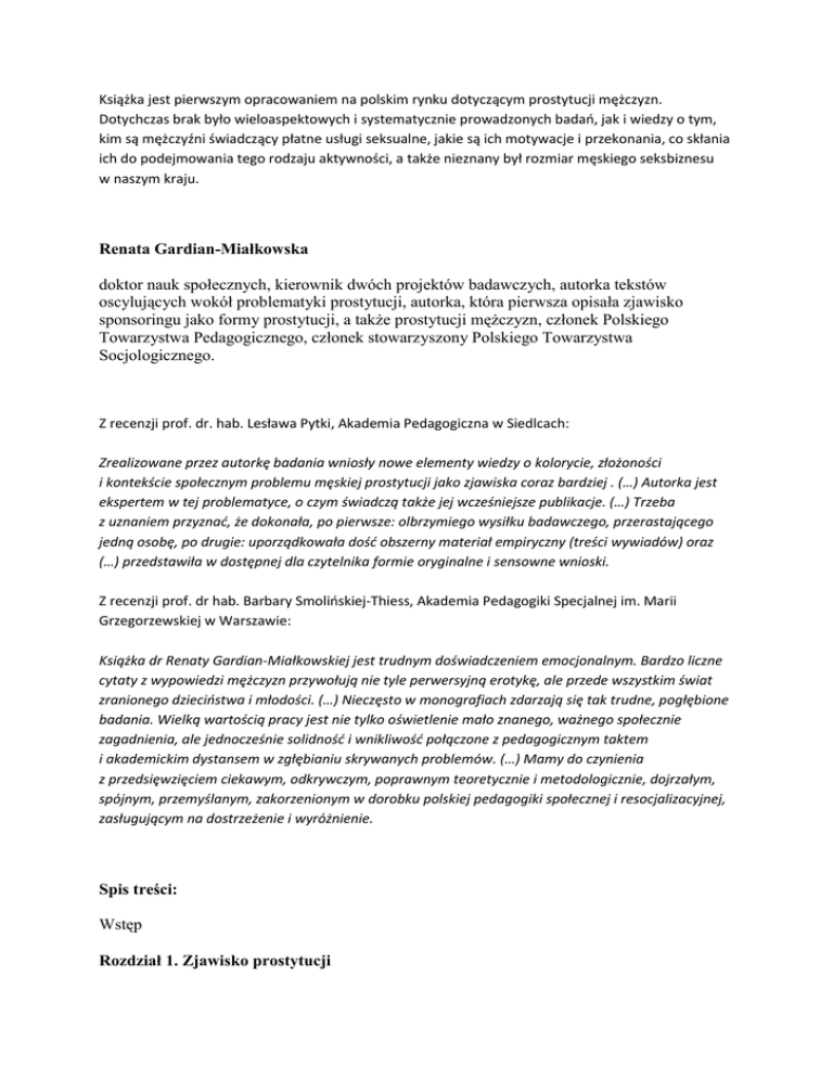 Książka jest pierwszym opracowaniem na polskim rynku dotyczącym prostytucji mężczyzn. Dotychczas brak było wieloaspektowych i systematycznie prowadzonych badań, jak i wiedzy o tym, kim są mężczyźni świadczący płatne usługi seksualne, jakie są ich motywacje i przekonania, co skłania ich do podejmowania tego rodzaju aktywności, a także nieznany był rozmiar męskiego seksbiznesu w naszym kraju. Renata Gardian-Miałkowska doktor nauk społecznych, kierownik dwóch projektów badawczych, autorka tekstów oscylujących wokół problematyki prostytucji, autorka, która pierwsza opisała zjawisko sponsoringu jako formy prostytucji, a także prostytucji mężczyzn, członek Polskiego Towarzystwa Pedagogicznego, członek stowarzyszony Polskiego Towarzystwa Socjologicznego. Z recenzji prof. dr. hab. Lesława Pytki, Akademia Pedagogiczna w Siedlcach: Zrealizowane przez autorkę badania wniosły nowe elementy wiedzy o kolorycie, złożoności i kontekście społecznym problemu męskiej prostytucji jako zjawiska coraz bardziej . (…) Autorka jest ekspertem w tej problematyce, o czym świadczą także jej wcześniejsze publikacje. (…) Trzeba z uznaniem przyznać, że dokonała, po pierwsze: olbrzymiego wysiłku badawczego, przerastającego jedną osobę, po drugie: uporządkowała dość obszerny materiał empiryczny (treści wywiadów) oraz (…) przedstawiła w dostępnej dla czytelnika formie oryginalne i sensowne wnioski. Z recenzji prof. dr hab. Barbary Smolińskiej-Thiess, Akademia Pedagogiki Specjalnej im. Marii Grzegorzewskiej w Warszawie: Książka dr Renaty Gardian-Miałkowskiej jest trudnym doświadczeniem emocjonalnym. Bardzo liczne cytaty z wypowiedzi mężczyzn przywołują nie tyle perwersyjną erotykę, ale przede wszystkim świat zranionego dzieciństwa i młodości. (…) Nieczęsto w monografiach zdarzają się tak trudne, pogłębione badania. Wielką wartością pracy jest nie tylko oświetlenie mało znanego, ważnego społecznie zagadnienia, ale jednocześnie solidność i wnikliwość połączone z pedagogicznym taktem i akademickim dystansem w zgłębianiu skrywanych problemów. (…) Mamy do czynienia z przedsięwzięciem ciekawym, odkrywczym, poprawnym teoretycznie i metodologicznie, dojrzałym, spójnym, przemyślanym, zakorzenionym w dorobku polskiej pedagogiki społecznej i resocjalizacyjnej, zasługującym na dostrzeżenie i wyróżnienie. Spis treści: Wstęp Rozdział 1. Zjawisko prostytucji Pojęcie prostytucji Prostytucja w świetle przepisów prawnych Rys historyczny prostytucji męskiej Typologia męskiej prostytucji Prostytucja męska w świetle wyników badań Klienci i klientki płatnych usług seksualnych Uwarunkowania prostytucji męskiej Koncepcja wykolejenia społecznego Czesława Czapówa Podsumowanie Rozdział 2. Założenia metodologiczne moich badań prostytucji męskiej Przedmiot i cele badań Pytania badawcze Zastosowane metody i techniki badawcze Organizacja i przebieg badań Kwestie etyczne Rozdział 3. Prezentacja, analiza, dyskusja i interpretacja wyników badań własnych Mężczyźni świadczący usługi seksualne w świetle analizy ich ogłoszeń internetowych Wyniki wywiadów swobodnych Charakterystyka mężczyzn objętych wywiadami swobodnymi Samoocena badanych mężczyzn Inicjacja seksualna Związki partnerskie Relacje z rodziną i znajomymi Religijność O seksspotkaniach i o osobach korzystających z płatnych usług seksualnych Wyniki analizy danych ilościowych badania kwestionariuszowego Charakterystyka mężczyzn objętych ankietą internetową Powody decyzji o zaangażowaniu się w prostytucję Relacje rozinne przeszłe i teraźniejsze Inicjacja seksualna i związki partnerskie Usługi seksualne Zachowania prozdrowotne Osoby korzytające z usług seksualnych w opiniach badanych mężczyzn Wynagrodzenie Analiza segmentacyjna mężczyzn świadczących usługi seksualne Dyskusja wyników badań; socjalizacyjne uwarunkowania prostytucji męskiej – próba odpowiedzi na pytania badawcze Wskazówki dla działań profilaktycznych i resocjalizacyjnych Bibliografia Spis rysunków i tabel Aneks