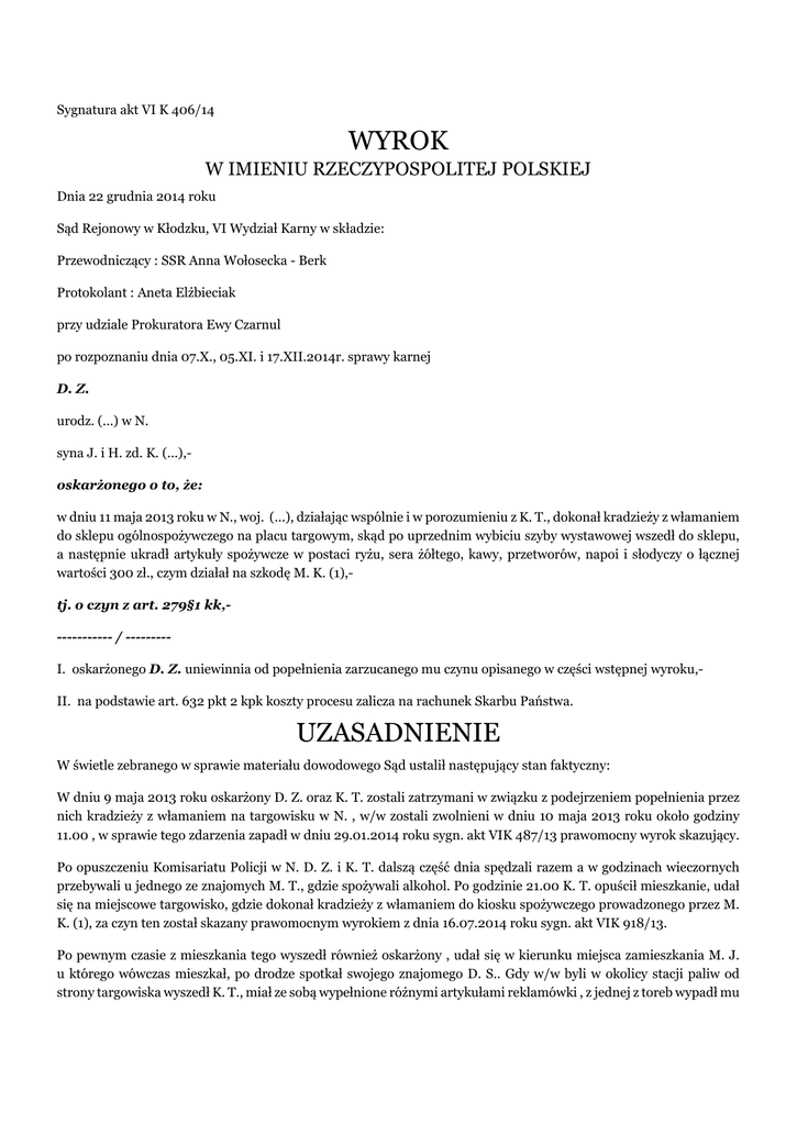Sygnatura akt VI K 406/14 WYROK W IMIENIU RZECZYPOSPOLITEJ POLSKIEJ Dnia 22 grudnia 2014 roku Sąd Rejonowy w Kłodzku, VI Wydział Karny w składzie: Przewodniczący : SSR Anna Wołosecka - Berk Protokolant : Aneta Elżbieciak przy udziale Prokuratora Ewy Czarnul po rozpoznaniu dnia 07.X., 05.XI. i 17.XII.2014r. sprawy karnej D. Z. urodz. (...) w N. syna J. i H. zd. K. (...),oskarżonego o to, że: w dniu 11 maja 2013 roku w N., woj. (...), działając wspólnie i w porozumieniu z K. T., dokonał kradzieży z włamaniem do sklepu ogólnospożywczego na placu targowym, skąd po uprzednim wybiciu szyby wystawowej wszedł do sklepu, a następnie ukradł artykuły spożywcze w postaci ryżu, sera żółtego, kawy, przetworów, napoi i słodyczy o łącznej wartości 300 zł., czym działał na szkodę M. K. (1),tj. o czyn z art. 279§1 kk,----------- / --------I. oskarżonego D. Z. uniewinnia od popełnienia zarzucanego mu czynu opisanego w części wstępnej wyroku,II. na podstawie art. 632 pkt 2 kpk koszty procesu zalicza na rachunek Skarbu Państwa. UZASADNIENIE W świetle zebranego w sprawie materiału dowodowego Sąd ustalił następujący stan faktyczny: W dniu 9 maja 2013 roku oskarżony D. Z. oraz K. T. zostali zatrzymani w związku z podejrzeniem popełnienia przez nich kradzieży z włamaniem na targowisku w N. , w/w zostali zwolnieni w dniu 10 maja 2013 roku około godziny 11.00 , w sprawie tego zdarzenia zapadł w dniu 29.01.2014 roku sygn. akt VIK 487/13 prawomocny wyrok skazujący. Po opuszczeniu Komisariatu Policji w N. D. Z. i K. T. dalszą część dnia spędzali razem a w godzinach wieczornych przebywali u jednego ze znajomych M. T., gdzie spożywali alkohol. Po godzinie 21.00 K. T. opuścił mieszkanie, udał się na miejscowe targowisko, gdzie dokonał kradzieży z włamaniem do kiosku spożywczego prowadzonego przez M. K. (1), za czyn ten został skazany prawomocnym wyrokiem z dnia 16.07.2014 roku sygn. akt VIK 918/13. Po pewnym czasie z mieszkania tego wyszedł również oskarżony , udał się w kierunku miejsca zamieszkania M. J. u którego wówczas mieszkał, po drodze spotkał swojego znajomego D. S.. Gdy w/w byli w okolicy stacji paliw od strony targowiska wyszedł K. T., miał ze sobą wypełnione różnymi artykułami reklamówki , z jednej z toreb wypadł mu słoik z majonezem , którym rzucił w tablice reklamową pobliskiej stacji benzynowej. D. S. poszedł do swojego miejsca zamieszkania, natomiast D. Z. i K. T. udali się do M. J. , gdzie K. T. pozostawił zabrane artykuły żywnościowe. / dowód: wyjaśnienia oskarżonego D. Z. zeznania świadków: M. K., M. J., D. S. odpis wyroku z dnia 29.01.2014 roku sygn. akt VIK 487/13 k 131-132; wyrok z dnia 16.07.2014 roku sygn. akt VIK 918/13 k.134 protokoły zatrzymania k 163,164 / Oskarżony D. Z. stojący pod zarzutem popełnienia czynu z art. 279 §1 kk nie przyznał się do winy i w złożonych wyjaśnieniach podał, że krytycznej nocy nie uczestniczył w kradzieży z włamaniem do kiosku spożywczego na targowisku w N.. W tak ustalonym stanie faktycznym Sąd zważył, co następuje: W świetle zebranego w sprawie materiału dowodowego Sąd nie znalazł podstaw do przypisania oskarżonemu sprawstwa odnośnie popełnienia zarzucanego mu czynu. Wskazać należy, iż jedynym dowodem wskazującym na sprawstwo oskarżonego są wyjaśnienia złożone w toku postępowania przygotowawczego w charakterze podejrzanego przez K. T., kiedy to wskazał, iż dokonał kradzieży z włamaniem wspólnie z oskarżonym D. Z.. Opisując przebieg zdarzenia K. T. podał, iż 11 maja 2013 roku w godzinach nocnych wraz z D. Z. poszli na targowisko w N. , przeskoczyli przez główną bramę , z uwagi na to , iż wcześniej włamywali się do tego sklepu wiedzieli, że jest tam jedzenie, K. T. otworzył okiennicę , wybił szybę , D. Z. stał na zewnątrz, po zabraniu artykułów żywnościowych udali się do M. J.. W toku rozprawy głównej K. T. przesłuchiwany w charakterze świadka nie potwierdził tych wyjaśnień i zeznał, iż przedmiotowego czynu dokonał sam, zeznał, iż krytycznego dnia przebywał wraz z D. Z. u jednego ze znajomych , w godzinach wieczornych opuścili mieszkania , gdy szli w kierunku miejsca zamieszkania na chwilę odszedł , oskarżony na niego zaczekał, w tym czasie K. T. miał dokonać kradzieży z włamaniem na targowisku, po czym w/w udali się do M. J.. Na pytania dotyczące przyczyny zmiany treści relacji odnośnie przebiegu zdarzenia na poszczególnych etapach postępowania K. T. zeznał, iż nie wie dlaczego złożył wyjaśnienia obciążające D. Z., podawał, iż być może źle go zrozumiano. Wskazać należy, iż wersja zdarzenia podana przez K. T. na rozprawie częściowo nie jest zgodna z relacjami D. Z. i D. S., którzy podali , iż K. T. spotkali w okolicy targowiska , miał on ze sobą torby z różnymi artykułami. Niewątpliwie wyjaśnienia K. T. co do zakwestionowania treści wyjaśnień nie są logiczne albowiem zapisy w protokole przesłuchania są jednoznaczne , przy czym wskazać trzeba, iż niezgodny ze stanem faktycznym jest zapis „ w dniu 11 maja 2013 roku w godzinach nocnych” albowiem sugerowałoby to, że czynu dokonano w nocy z 11/12 maja podczas gdy zderzenie miało miejsce w nocy z 10/11 maja 2013 roku. Relacje składane przez K. T. należy ocenić jako niespójne, dowolne, wskazują one , iż w istocie nie przywiązuje on wagi do treści swoich wypowiedzi , konsekwencji jakie ze sobą niosą, czy też zgodności z zasadami logiki. Oskarżony od początku postępowania nie przyznawał się do winy, w toku postępowania przygotowawczego wskazał świadka , który miał potwierdzać jego wersję wydarzeń a mianowicie D. S.. Świadek ten zarówno w toku śledztwa jak i rozprawy głównej zeznał, iż krytycznej nocy gdy szedł z D. Z. w pewnej chwili dołączył do nich K. T. , miał ze sobą reklamówki, świadek opisał też zachowanie K. T. polegające na rzuceniu s