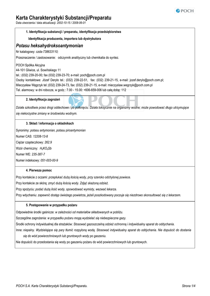 Karta Charakterystyki Substancji/Preparatu Data utworzenia / data aktualizacji: 2002-10-15 / 2008-06-01 1. Identyfikacja substancji / preparatu, identyfikacja przedsiębiorstwa Identyfikacja producenta, importera lub dystrybutora Potasu heksahydroksoantymonian Nr katalogowy: czda-738633110; Przeznaczenie / zastosowanie: odczynnik analityczny lub chemikalia do syntez. POCH Spółka Akcyjna 44-101 Gliwice, ul. Sowińskiego 11 tel.: (032) 239-20-00; fax (032) 239-23-70; e-mail: [email protected] Osoby kontaktowe: Józef Deryło tel.: (032) 239-22-51, fax: (032) 239-21-15, e-mail: [email protected]; Mieczysław Węgrzyk tel.:(032) 239-24-73, fax: (032) 239-21-15, e-mail: [email protected] Tel. alarmowy: w dni robocze, w godz.: 7.00 - 15.00: +606-659-006 lub całą dobę: 112 2. Identyfikacja zagrożeń Działa szkodliwie przez drogi oddechowe i po połknięciu. Działa toksycznie na organizmy wodne; może powodować długo utrzymujące się niekorzystne zmiany w środowisku wodnym. 3. Skład / informacja o składnikach Synonimy: potasu antymonian, potasu piroantymonian Numer CAS: 12208-13-8 Ciężar cząsteczkowy: 262.9 Wzór chemiczny: H6KO6Sb Numer WE: 235-387-7 Numer indeksowy: 051-003-00-9 4. Pierwsza pomoc Przy kontakcie z oczami: przepłukać dużą ilością wody, przy szeroko odchylonej powiece. Przy kontakcie ze skórą: zmyć dużą ilością wody. Zdjąć skażoną odzież. Przy spożyciu: podać dużą ilość wody, spowodować wymioty, wezwać lekarza. Przy wdychaniu: zapewnić dostęp świeżego powietrza, jeżeli poszkodowany poczuje się niezdrowo skonsultować się z lekarzem. 5. Postępowanie w przypadku pożaru Odpowiednie środki gaśnicze: w zależności od materiałów składowanych w pobliżu. Szczególne zagrożenia: w przypadku pożaru mogą wydzielać się niebezpieczne gazy. Środki ochrony indywidualnej dla strażaków: Stosować gazoszczelną odzież ochronną i indywidualny aparat do oddychania. Inne: niepalny. Wydzielające się pary tłumić rozpyloną wodą. Stosować indywidualny aparat do oddychania. Nie dopuścić do dostania się do wód powierzchniowych lub gruntowych wody po gaszeniu. Nie dopuścić do przedostania się wody po gaszeniu pożaru do wód powierzchniowych lub gruntowych. POCH S.A. Karta Charakterystyki Substancji/Preparatu. Strona 1/4 Potasu heksahydroksoantymonian 6. Postępowanie w przypadku niezamierzonego uwolnienia do środowiska "Unikać tworzenia pyłów; nie wdychać pyłów. Zapewnić dopływ świeżego powietrza do pomieszczeń zamkniętych. Nie dopuścić do dostania się do kanalizacji. Zebrać na sucho, przekazać do likwidacji. Oczyścić skażony teren." Nie dopuścić do dostania się do wód, ścieków i gleby. 7. Postępowanie z substancją / preparatem i jej / jego magazynowanie Obchodzenie się z substancją: Zapewnić skuteczną wymianę powietrza (wentylacja). Postępować zgodnie z zasadami dobrej praktyki przemysłowej oraz ogólnymi zasadami bezpieczeństwa i higieny pracy z substancjami chemicznymi. Stosować środki ochrony osobistej zgodnie z pkt.8. Nie opróżniać do kanalizacji. Przy manipulowaniu unikać tworzenia się pyłu/aerozolu. Magazynowanie: szczelne opakowania, suche pomieszczenie. Chronić przed światłem. Rozporządzenie Ministra Zdrowia z dnia 14 marca 2003 r. w sprawie sposobu oznakowania miejsc, rurociągów oraz pojemników i zbiorników służących do przechowywania lub zawierających substancje niebezpieczne lub preparaty niebezpieczne (Dz.U.03.61.552) 8. Kontrola narażenia i środki ochrony indywidualnej Paramerty kontroli (NDS, NDSCh, NDSP): antymon i jego związki nieorganiczne: NDS: 0,5 mg/m3, NDSCh: 20 mg/m3. Stosować odpowiednią wentylację wywiewną, miejscową i ogólną zapewniającą utrzymanie stężenia produktu w powietrzu poniżej określonych limitów. Zaleca się wyposażenie miejsca pracy w wodny natrysk do płukania oczu oraz prysznic. Środki ochrony indywidualnej powinny być tak zaprojektowane i wykonane aby wykluczały zagrożenie i inne niedogodności w przewidywanych warunkach użytkowania, chroniące przed chemikaliami. Środki ochrony indywidualnej: ochrona dróg oddechowych: konieczna w przypadku pylenia - respirator ochrona oczu: konieczna - okulary ochronne typu gogle ochrona rąk: konieczna - rękawice ochronne odporne na działanie chemikaliów wykonane z gumy nitrylowej lub inne dopuszczone przez producenta rękawic do kontaktu z tym produktem. Czas wytrzymałości materiału określa producent rękawic. ochrona ciała: konieczna - ubranie ochronne środki ochronne i higieny: zmienić skażoną odzież, wymyć ręce po pracy z tą substancją Rozporządzenie Ministra Zdrowia z dnia 30 grudnia 2004 r. w sprawie bezpieczeństwa i higieny pracy związanej z występowaniem w miejscu pracy czynników chemicznych (Dz.U.05.11.86). Rozporządzenie Ministra Pracy i Polityki Społecznej z dnia 30 sierpnia 2007 (Dz. U. nr 161, poz. 1142) 9. Właściwości fizyczne i chemiczne Forma: ciało stałe lepkość dynamiczna: Kolor: biały lepkość kinematyczna: Zapach: bez zapachu Ciśnienie par: brak danych pH: 7,5 - 9,0 (20 g/l H2O w 20°C) Gęstość: brak danych Temperatura topnienia: brak danych Ciężar nasypowy: około 1200 kg/m3 Temperatura wrzenia: brak danych Rozpuszczalność: Temperatura samozapłonu: nie dotyczy w wodzie: 20 g/l (20°C), 110 g/l (100°C) Temperatura zapłonu: nie dotyczy w rozpuszczalnikach organicznych: etanol - prawie nie rozpuszczalny (20°C) Granice wybuchowości: nie dotyczy log P(w/o): dolna: górna: POCH S.A. Karta Charakterystyki Substancji/Preparatu. Strona 2/4 Potasu heksahydroksoantymonian 10. Stabilność i reaktywność Warunki których należy unikać: ogrzewanie. Materiały których należy unikać: brak. Niebezpieczne produkty rozkładu: brak. Następne dane: brak. 11. Informacje toksykologiczne Informacje toksykologiczne: brak danych ilościowych. Pozostałe dane: właściwości których nie można wykluczyć przez analogie -
