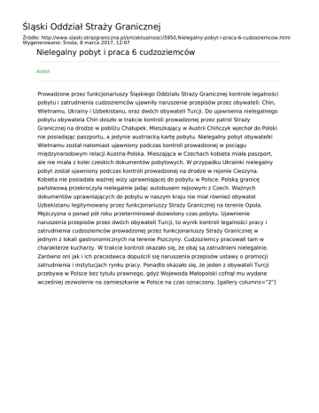 Śląski Oddział Straży Granicznej Źródło: http://www.slaski.strazgraniczna.pl/sm/aktualnosci/5950,Nielegalny-pobyt-i-praca-6-cudzoziemcow.html Wygenerowano: Środa, 8 marca 2017, 12:07 Nielegalny pobyt i praca 6 cudzoziemców Autor: Prowadzone przez funkcjonariuszy Śląskiego Oddziału Straży Granicznej kontrole legalności pobytu i zatrudnienia cudzoziemców ujawniły naruszenie przepisów przez obywateli: Chin, Wietnamu, Ukrainy i Uzbekistanu, oraz dwóch obywateli Turcji. Do ujawnienia nielegalnego pobytu obywatela Chin doszło w trakcie kontroli prowadzonej przez patrol Straży Granicznej na drodze w pobliżu Chałupek. Mieszkający w Austrii Chińczyk wjechał do Polski nie posiadając paszportu, a jedynie austriacką kartę pobytu. Nielegalny pobyt obywatelki Wietnamu został natomiast ujawniony podczas kontroli prowadzonej w pociągu międzynarodowym relacji Austria-Polska. Mieszająca w Czechach kobieta miała paszport, ale nie miała z kolei czeskich dokumentów pobytowych. W przypadku Ukrainki nielegalny pobyt został ujawniony podczas kontroli prowadzonej na drodze w rejonie Cieszyna. Kobieta nie posiadała ważnej wizy uprawniającej do pobytu w Polsce. Polską granicę państwową przekroczyła nielegalnie jadąc autobusem rejsowym z Czech. Ważnych dokumentów uprawniających do pobytu w naszym kraju nie miał również obywatel Uzbekistanu legitymowany przez funkcjonariuszy Straży Granicznej na terenie Opola. Mężczyzna o ponad pół roku przeterminował dozwolony czas pobytu. Ujawnienie naruszenia przepisów przez dwóch obywateli Turcji, to wynik kontroli legalności pracy i zatrudnienia cudzoziemców prowadzonej przez funkcjonariuszy Straży Granicznej w jednym z lokali gastronomicznych na terenie Pszczyny. Cudzoziemcy pracowali tam w charakterze kucharzy. W trakcie kontroli okazało się, że obaj są zatrudnieni nielegalnie. Zarówno oni jak i ich pracodawca dopuścili się naruszenia przepisów ustawy o promocji zatrudnienia i instytucjach rynku pracy. Ponadto okazało się, że jeden z obywateli Turcji przebywa w Polsce bez tytułu prawnego, gdyż Wojewoda Małopolski cofnął mu wydane wcześniej zezwolenie na zamieszkanie w Polsce na czas oznaczony. [gallery columns="2"]