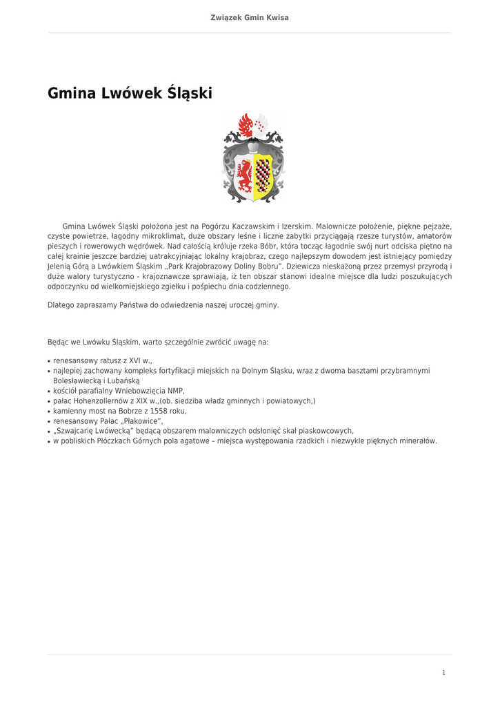 Związek Gmin Kwisa Gmina Lwówek Śląski Gmina Lwówek Śląski położona jest na Pogórzu Kaczawskim i Izerskim. Malownicze położenie, piękne pejzaże, czyste powietrze, łagodny mikroklimat, duże obszary leśne i liczne zabytki przyciągają rzesze turystów, amatorów pieszych i rowerowych wędrówek. Nad całością króluje rzeka Bóbr, która tocząc łagodnie swój nurt odciska piętno na całej krainie jeszcze bardziej uatrakcyjniając lokalny krajobraz, czego najlepszym dowodem jest istniejący pomiędzy Jelenią Górą a Lwówkiem Śląskim „Park Krajobrazowy Doliny Bobru”. Dziewicza nieskażoną przez przemysł przyrodą i duże walory turystyczno - krajoznawcze sprawiają, iż ten obszar stanowi idealne miejsce dla ludzi poszukujących odpoczynku od wielkomiejskiego zgiełku i pośpiechu dnia codziennego. Dlatego zapraszamy Państwa do odwiedzenia naszej uroczej gminy. Będąc we Lwówku Śląskim, warto szczególnie zwrócić uwagę na: ● ● ● ● ● ● ● ● renesansowy ratusz z XVI w., najlepiej zachowany kompleks fortyfikacji miejskich na Dolnym Śląsku, wraz z dwoma basztami przybramnymi Bolesławiecką i Lubańską kościół parafialny Wniebowzięcia NMP, pałac Hohenzollernów z XIX w.,(ob. siedziba władz gminnych i powiatowych,) kamienny most na Bobrze z 1558 roku, renesansowy Pałac „Płakowice”, „Szwajcarię Lwówecką” będącą obszarem malowniczych odsłonięć skał piaskowcowych, w pobliskich Płóczkach Górnych pola agatowe – miejsca występowania rzadkich i niezwykle pięknych minerałów. 1
