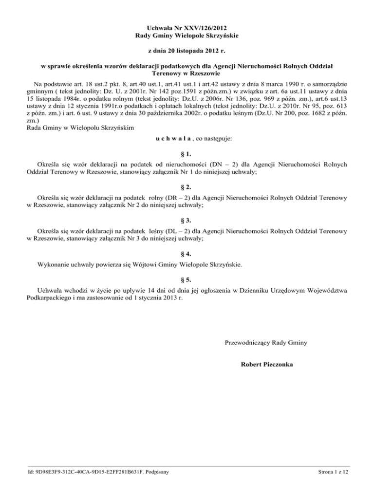 Uchwała Nr XXV/126/2012 Rady Gminy Wielopole Skrzyńskie z dnia 20 listopada 2012 r. w sprawie określenia wzorów deklaracji podatkowych dla Agencji Nieruchomości Rolnych Oddział Terenowy w Rzeszowie Na podstawie art. 18 ust.2 pkt. 8, art.40 ust.1, art.41 ust.1 i art.42 ustawy z dnia 8 marca 1990 r. o samorządzie gminnym ( tekst jednolity: Dz. U. z 2001r. Nr 142 poz.1591 z późn.zm.) w związku z art. 6a ust.11 ustawy z dnia 15 listopada 1984r. o podatku rolnym (tekst jednolity: Dz.U. z 2006r. Nr 136, poz. 969 z późn. zm.), art.6 ust.13 ustawy z dnia 12 stycznia 1991r.o podatkach i opłatach lokalnych (tekst jednolity: Dz.U. z 2010r. Nr 95, poz. 613 z późn. zm.) i art. 6 ust. 9 ustawy z dnia 30 października 2002r. o podatku leśnym (Dz.U. Nr 200, poz. 1682 z późn. zm.) Rada Gminy w Wielopolu Skrzyńskim u c h w a l a , co następuje: § 1. Określa się wzór deklaracji na podatek od nieruchomości (DN – 2) dla Agencji Nieruchomości Rolnych Oddział Terenowy w Rzeszowie, stanowiący załącznik Nr 1 do niniejszej uchwały; § 2. Określa się wzór deklaracji na podatek rolny (DR – 2) dla Agencji Nieruchomości Rolnych Oddział Terenowy w Rzeszowie, stanowiący załącznik Nr 2 do niniejszej uchwały; § 3. Określa się wzór deklaracji na podatek leśny (DL – 2) dla Agencji Nieruchomości Rolnych Oddział Terenowy w Rzeszowie, stanowiący załącznik Nr 3 do niniejszej uchwały; § 4. Wykonanie uchwały powierza się Wójtowi Gminy Wielopole Skrzyńskie. § 5. Uchwała wchodzi w życie po upływie 14 dni od dnia jej ogłoszenia w Dzienniku Urzędowym Województwa Podkarpackiego i ma zastosowanie od 1 stycznia 2013 r. Przewodniczący Rady Gminy Robert Pieczonka ————————————————————————————————————————————————————————— Id: 9D98E3F9-312C-40CA-9D15-E2FF281B631F. Podpisany Strona 1 z 12 1. Numer Identyfikacji Podatkowej składającego deklarację Załącznik Nr 1 do Uchwały Nr XXV/126/2012 Rady Gminy w Wielopolu Skrzyńskim z dnia 20 listopada 2012r. DN - 2 DEKLARACJA NA PODATEK OD NIERUCHOMOŚCI (grunty) 2. na Rok Podstawa prawna: Art.6 ust.9 pkt.1 ust. z dnia 12 stycznia 1991r.o podatkach i opłatach lokalnych(tekst jedn.Dz.U. z 2010r.Nr 95, poz. 613 z późn.zm) Składający: Formularz przeznaczony dla Agencji Nieruchomości Rolnych. Termin składania: Do 31 stycznia każdego roku podatkowego; w terminie 14 dni od dnia zaistnienia okoliczności uzasadniających powstanie albo wygaśnięcie obowiązku podatkowego, lub zaistnienie zmian. Miejsce składania: Organ podatkowy (siedziba) organu podatkowego - urzędu miasta/gminy) właściwego według miejsca położenia gospodarstwa rolnego. A. MIEJSCE SKŁADANIA DEKLARACJI 3. Urząd Miasta / Gminy B. DANE SKŁADAJĄCEGO DEKLARACJĘ - dotyczy składającego deklarację nie będącego osobą fizyczną B.1 DANE IDENTYFIKACYJNE 4. Rodzaj składającego deklarację (zaznaczyć właściwą kratkę) 1. osoba fizyczna 2. osoba prawna 3. jednostka organizacyjna 4. spółka nie mająca osobowości prawnej 5. Rodzaj własności, posiadania 1. właściciel 2. współwłaściciel 3. posiadacz samoistny 6. współużytkownik wieczysty 7. posiadacz 4. współwłaściciel samoistny 5. użytkownik wieczysty 8. współposiadacz 6. Miejsce/a (adres/y) położenia przedmiotów opodatkowania oraz numer/y działek 7. Numer/y księgi wieczystej lub zbioru/ów dokumentów 8. Nazwa pełna 9. Nazwa skrócona 10. Numer identyfikacji REGON B.2 ADRES SIEDZIBY 11. Kraj 12. Województwo 13. Powiat 14. Gmina 15. Ulica 16. Numer domu / Numer lokalu 17. Miejscowość 18. Kod pocztowy 19. Poczta B.3 ORGAN REJESTROWY 20. Nazwa organu rejestrowego 21. Nazwa rejestru 22. Data rejestracji - 23. Numer w rejestrze. - 24. Klasa rodzaju działalności (PKD) zgodnie z rozporządzeniem Rady Ministrów z dnia 24 grudnia 2007r. W sprawie Polskiej Klasyfikacji Działalności (PKD) - (tekst jedn.Dz.U.Nr 251, poz. 1885 z 2007r. z późn. zm.) 25. Forma prawna przedsiębiorstwa 26. Wielkość przedsiębiorcy - podać wg. Ustawy z dnia 2 lipca 2004r. o swobodzie działalności gospodarczej (tekst jedn. Dz.U.Nr 155, poz. 1095 z 2007r. z późn.zm) ————————————————————————————————————————————————————————— Id: 9D98E3F9-312C-40CA-9D15-E2FF281B631F. Podpisany Strona 2 z 12 C. OKOLICZNOŚCI POWODUJĄCE KONIECZNOŚĆ ZŁOŻENIA DEKLARACJI 27. Okoliczności 1. deklaracja roczna 2. korekta deklaracji rocznej od dnia D. DANE DOTYCZĄCE PRZEDMIOTU OPODATKOWANIA Wyszczególnienie Podstawa opodatkowania Stawka podatku Kwota podatku w zł, gr D.1 POWIERZCHNIA GRUNTÓW 1. Związane z prowadzeniem działalności gospodarczej, bez względu na sposób zakwalifikowania w ewidencji gruntów i budynków w [m2] 2. Pod jeziorami, zajętych na zbiorniki wodne retencyjne lub elektrowni wodnych w [ha] 3. drogi dojazdowe do pól i posesji [m2] 4. Pozostałe grunty w [m2], (w tym zajęte na prowadzenie odpłatnej stat. działal.pożyt.publicz. przez org.pożyt.publ.) D.2 POWIERZCHNIA UŻYTKOWA BUDYNKÓW LUB ICH CZĘŚCI (*) 1. Mieszkalnych w [m2] 2. Związanych z prowadzeniem działalności gospodarczej oraz od budynków mieszkalnych lub ich części zajętych na prowadzenie działalności gospodarczej w [m2] 3. Zajęte na prowadzenie działalności gospodarczej w zakresie obrotu kwalifikowanym materiałem siewnym w [m2] 4. Związanych z udzielaniem świadczeń zdrowotnych w rozumieniu przepisów o dział. leczniczej zajętych przez podmioty udzielające tych świadczeń 5. Pozostałe budynki w [m2], (w tym zajęte na prowadzenie odpłatnej stat. działal.pożyt.publicz. przez org.pożyt.publ.) D.3 BUDOWLE 1. Budowle (wartość, o której mowa w przepisach o podatkach dochodowych) D.4 KWOTA PODATKU razem bez zwolnień Kwota podatku bez zwolnień Suma kwoty D.1, D.2, D.3 E. GRU