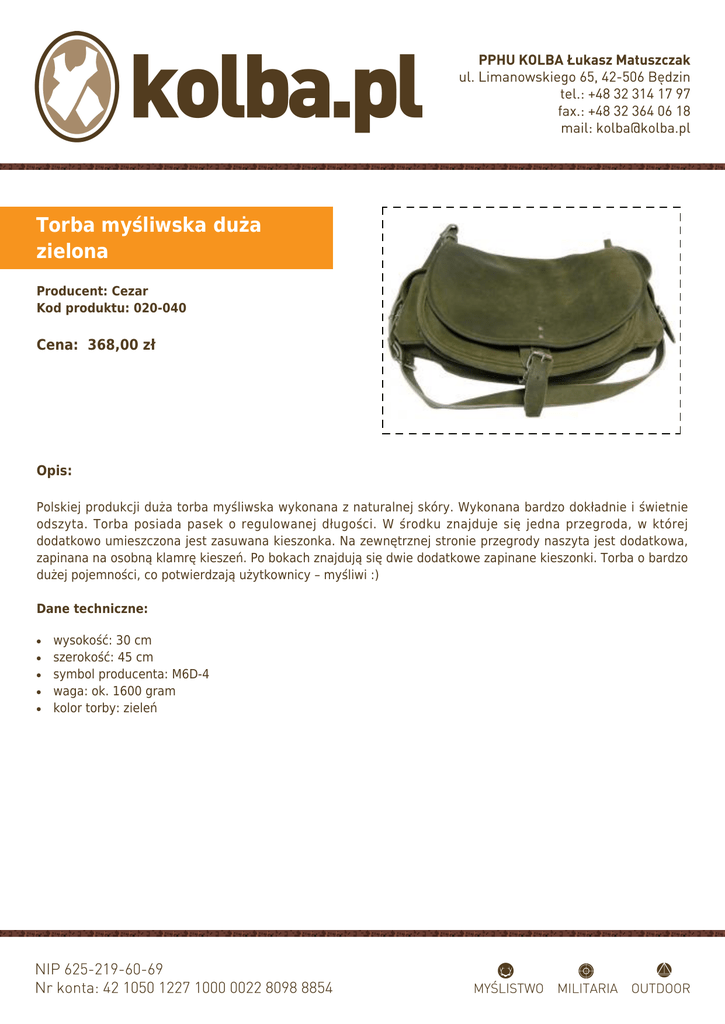 Torba myśliwska duża zielona Producent: Cezar Kod produktu: 020-040 Cena: 368,00 zł Opis: Polskiej produkcji duża torba myśliwska wykonana z naturalnej skóry. Wykonana bardzo dokładnie i świetnie odszyta. Torba posiada pasek o regulowanej długości. W środku znajduje się jedna przegroda, w której dodatkowo umieszczona jest zasuwana kieszonka. Na zewnętrznej stronie przegrody naszyta jest dodatkowa, zapinana na osobną klamrę kieszeń. Po bokach znajdują się dwie dodatkowe zapinane kieszonki. Torba o bardzo dużej pojemności, co potwierdzają użytkownicy – myśliwi :) Dane techniczne: ● ● ● ● ● wysokość: 30 cm szerokość: 45 cm symbol producenta: M6D-4 waga: ok. 1600 gram kolor torby: zieleń