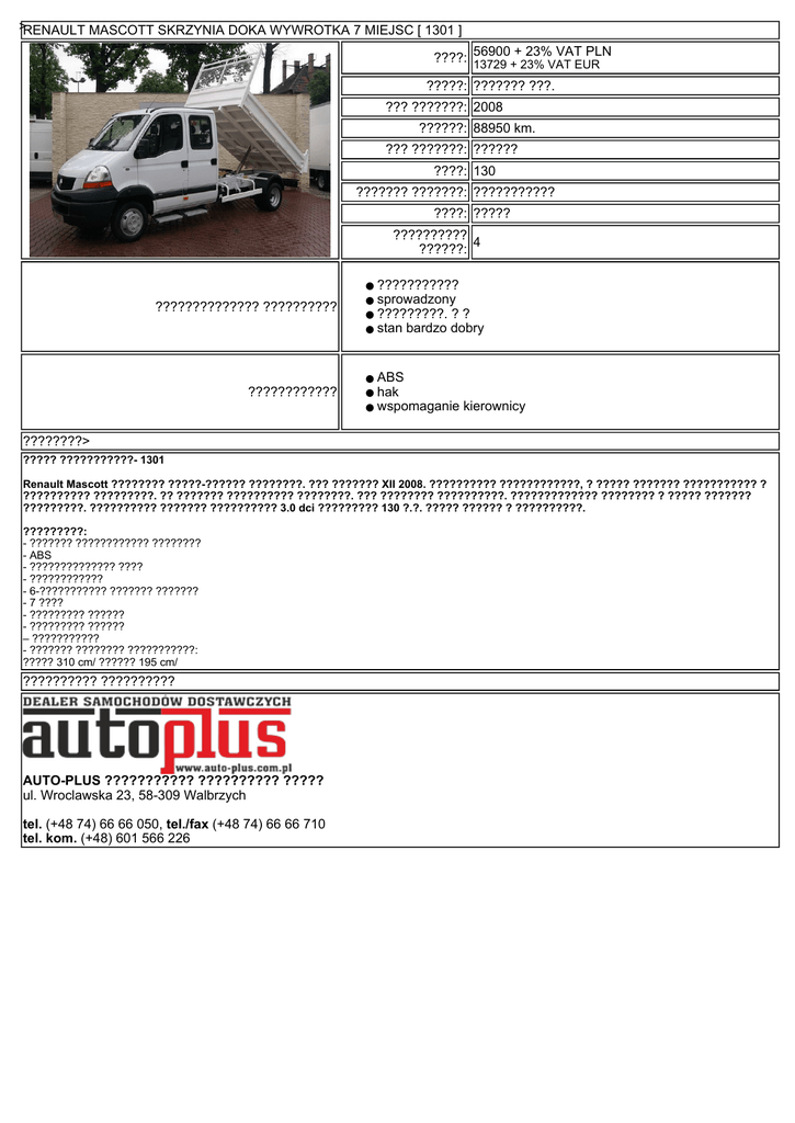 >RENAULT MASCOTT SKRZYNIA DOKA WYWROTKA 7 MIEJSC [ 1301 ] ????: 56900 + 23% VAT PLN 13729 + 23% VAT EUR ?????: ??????? ???. ??? ???????: 2008 ??????: 88950 km. ??? ???????: ?????? ????: 130 ??????? ???????: ??????????? ????: ????? ?????????? 4 ??????: ?????????????? ?????????? ● ● ● ● ??????????? sprowadzony ?????????. ? ? stan bardzo dobry ???????????? ● ● ● ABS hak wspomaganie kierownicy ????????> ????? ???????????- 1301 Renault Mascott ???????? ?????-?????? ????????. ??? ??????? XII 2008. ?????????? ????????????, ? ????? ??????? ??????????? ? ?????????? ?????????. ?? ??????? ?????????? ????????. ??? ???????? ??????????. ????????????? ???????? ? ????? ??????? ?????????. ?????????? ??????? ?????????? 3.0 dci ????????? 130 ?.?. ????? ?????? ? ??????????. ?????????: - ??????? ???????????? ???????? - ABS - ?????????????? ???? - ???????????? - 6-??????????? ??????? ??????? - 7 ???? - ????????? ?????? - ????????? ?????? – ??????????? - ??????? ???????? ???????????: ????? 310 cm/ ?????? 195 cm/ ?????????? ?????????? AUTO-PLUS ??????????? ?????????? ????? ul. Wroclawska 23, 58-309 Walbrzych tel. (+48 74) 66 66 050, tel./fax (+48 74) 66 66 710 tel. kom. (+48) 601 566 226