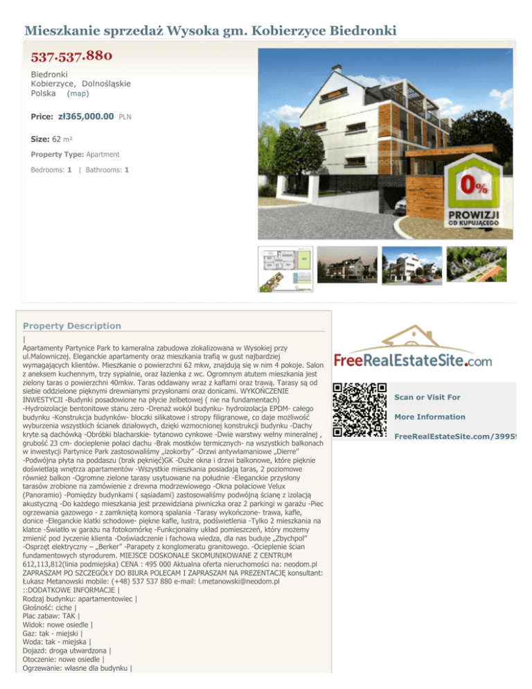 Mieszkanie sprzedaż Wysoka gm. Kobierzyce Biedronki 537.537.880 Biedronki Kobierzyce, Dolnośląskie Polska (map) Price: zł365,000.00 PLN Size: 62 m² Property Type: Apartment Bedrooms: 1 | Bathrooms: 1 Property Description | Apartamenty Partynice Park to kameralna zabudowa zlokalizowana w Wysokiej przy ul.Malowniczej. Eleganckie apartamenty oraz mieszkania trafią w gust najbardziej wymagających klientów. Mieszkanie o powierzchni 62 mkw, znajdują się w nim 4 pokoje. Salon z aneksem kuchennym, trzy sypialnie, oraz łazienka z wc. Ogromnym atutem mieszkania jest zielony taras o powierzchni 40mkw. Taras oddawany wraz z kaflami oraz trawą. Tarasy są od siebie oddzielone pięknymi drewnianymi przysłonami oraz donicami. WYKOŃCZENIE INWESTYCJI -Budynki posadowione na płycie żelbetowej ( nie na fundamentach) -Hydroizolacje bentonitowe stanu zero -Drenaż wokół budynku- hydroizolacja EPDM- całego budynku -Konstrukcja budynków- bloczki silikatowe i stropy filigranowe, co daje możliwość wyburzenia wszystkich ścianek działowych, dzięki wzmocnionej konstrukcji budynku -Dachy kryte są dachówką -Obróbki blacharskie- tytanowo cynkowe -Dwie warstwy wełny mineralnej , grubość 23 cm- docieplenie połaci dachu -Brak mostków termicznych- na wszystkich balkonach w inwestycji Partynice Park zastosowaliśmy „izokorby” -Drzwi antywłamaniowe „Dierre” -Podwójna płyta na poddaszu (brak pęknięć)GK -Duże okna i drzwi balkonowe, które pięknie doświetlają wnętrza apartamentów -Wszystkie mieszkania posiadają taras, 2 poziomowe również balkon -Ogromne zielone tarasy usytuowane na południe -Eleganckie przysłony tarasów zrobione na zamówienie z drewna modrzewiowego -Okna połaciowe Velux (Panoramio) -Pomiędzy budynkami ( sąsiadami) zastosowaliśmy podwójną ścianę z izolacją akustyczną -Do każdego mieszkania jest przewidziana piwniczka oraz 2 parkingi w garażu -Piec ogrzewania gazowego - z zamkniętą komorą spalania -Tarasy wykończone- trawa, kafle, donice -Eleganckie klatki schodowe- piękne kafle, lustra, podświetlenia -Tylko 2 mieszkania na klatce -Światło w garażu na fotokomórkę -Funkcjonalny układ pomieszczeń, który możemy zmienić pod życzenie klienta -Doświadczenie i fachowa wiedza, dla nas buduje „Zbychpol” -Osprzęt elektryczny – „Berker” -Parapety z konglomeratu granitowego. -Ocieplenie ścian fundamentowych styrodurem. MIEJSCE DOSKONALE SKOMUNIKOWANE Z CENTRUM 612,113,812(linia podmiejska) CENA : 495 000 Aktualna oferta nieruchomości na: neodom.pl ZAPRASZAM PO SZCZEGÓŁY DO BIURA POLECAM I ZAPRASZAM NA PREZENTACJĘ konsultant: Łukasz Metanowski mobile: (+48) 537 537 880 e-mail: [email protected] ::DODATKOWE INFORMACJE | Rodzaj budynku: apartamentowiec | Głośność: ciche | Plac zabaw: TAK | Widok: nowe osiedle | Gaz: tak - miejski | Woda: tak - miejska | Dojazd: droga utwardzona | Otoczenie: nowe osiedle | Ogrzewanie: własne dla budynku | Scan or Visit For More Information FreeRealEstateSite.com/399594 Linie telefoniczne: TAK | Internet: TAK | Telewizja kablowa: TAK | Nadaje się na biuro: TAK | Komunikacja publ.: autobus | Rozkład: dwustronne przejściowe | Usytuowanie: środkowe | Drzwi antywłamaniowe: TAK | Rolety antywłamaniowe: TAK | Teren ogrodzony: TAK | Rodzaj mieszkania: jednopoziomowe | Garaż: garaż | Piwnica: TAK | Stan lokalu: deweloperski | Okna: nowe drewniane | Tarasy: taras duży | Ilość tarasów: 1 | Powierzchnia ogródka [m2]: 40,00 | Powierzchnia użytkowa [m2]: 62,00 | Rok budowy: 2013 | Ilość pokoi: 4 | ::LINK DO STRONY | http://www.wroclaw.neodom.pl/oferta.aspx?id=27768 ::KONTAKT DO AGENTA | Łukasz Metanowski | 537.537.880 | [email protected] ::DANE BIURA | NEODOM Agencja Nieruchomości Oddział - Wrocław | Gabrieli Zapolskiej 1 (III piętro) | 50-032 Wrocław | 793.56.81.82 | www.wroclaw.neodom.pl | Oferta wysłana z systemu Galactica Virgo Security: break-prooven doors Year Built: 2013 Floors: 2
