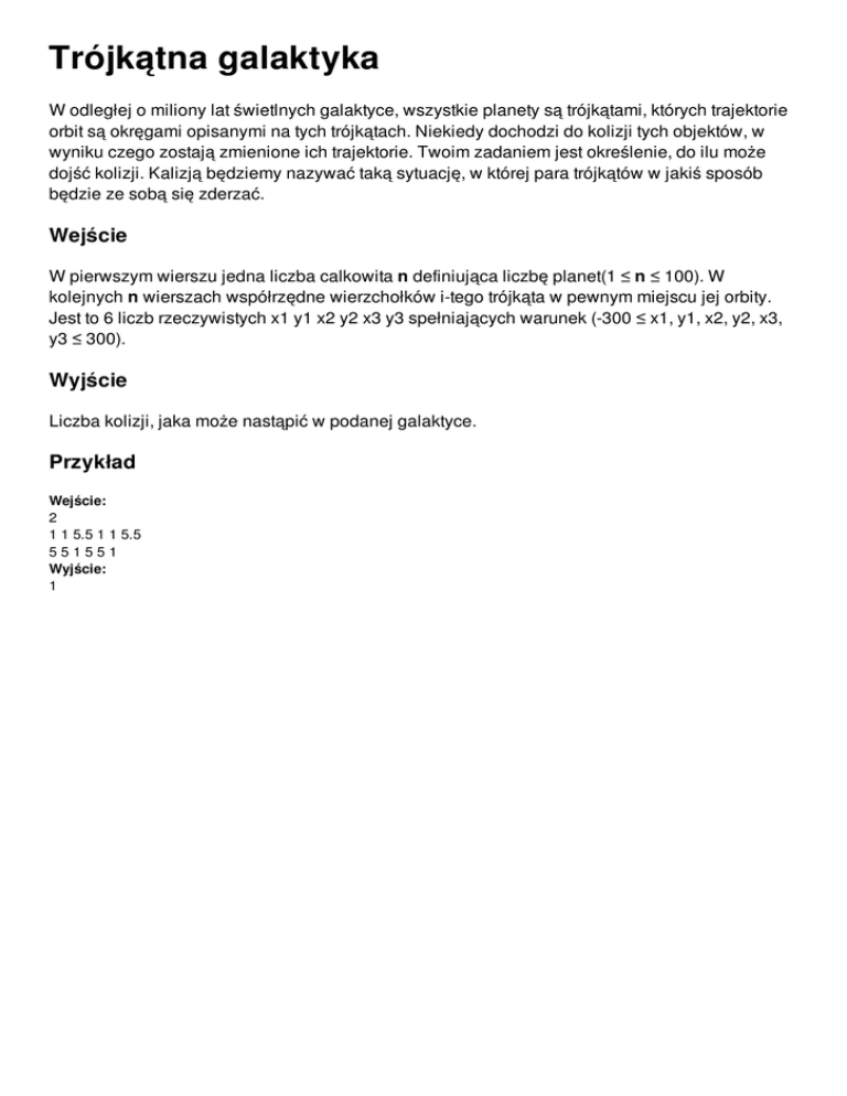 Trójkątna galaktyka W odległej o miliony lat świetlnych galaktyce, wszystkie planety są trójkątami, których trajektorie orbit są okręgami opisanymi na tych trójkątach. Niekiedy dochodzi do kolizji tych objektów, w wyniku czego zostają zmienione ich trajektorie. Twoim zadaniem jest określenie, do ilu może dojść kolizji. Kalizją będziemy nazywać taką sytuację, w której para trójkątów w jakiś sposób będzie ze sobą się zderzać. Wejście W pierwszym wierszu jedna liczba calkowita n definiująca liczbę planet(1 ≤ n ≤ 100). W kolejnych n wierszach współrzędne wierzchołków i-tego trójkąta w pewnym miejscu jej orbity. Jest to 6 liczb rzeczywistych x1 y1 x2 y2 x3 y3 spełniających warunek (-300 ≤ x1, y1, x2, y2, x3, y3 ≤ 300). Wyjście Liczba kolizji, jaka może nastąpić w podanej galaktyce. Przykład Wejście: 2 1 1 5.5 1 1 5.5 551551 Wyjście: 1