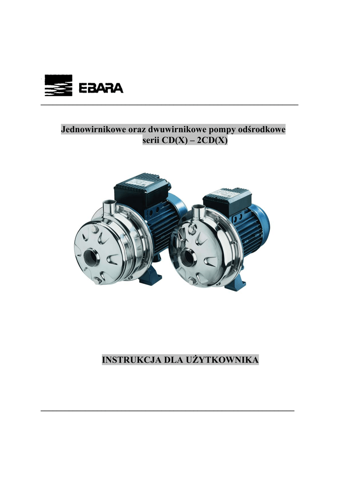 ________________________________________________________________ Jednowirnikowe oraz dwuwirnikowe pompy odśrodkowe serii CD(X) – 2CD(X) INSTRUKCJA DLA UŻYTKOWNIKA _______________________________________________________________ 1. DANE DOTYCZĄCE PRODUCENTA POMPY 1.1 DANE PRODUCENTA EBARA PUMPS EUROPE S.p.A. Adres głównego biura i fabryki: Via Pacinotti, 32 36040 BRENDOLA (VI) WŁOCHY Tel.: +39/0444/401145 Fax.: +39/0444/400018 Adres siedziby głównej: Via Campo Sportivo, 30 38023 CLES (TN) WŁOCHY Tel.: +39/0463/24500 Fax.: +39/0463/22782 Importer: Ebara Pompy Polska Sp.zo.o. ul.Mińska 63 03-828 Warszawa tel. 22/3308118 Fax. 22/3308119 1.2. DANE POMPY Opis: JEDNO I DWUWIRNIKOWE POMPY WIROWE, NORMALNIESSĄCE Model: CD(X)-2CD(X) Data produkcji: PATRZ TABLICZKA ZNAMIONOWA POMPY 2. INFORMACJE DOTYCZĄCE POMOCY TECHNICZNEJ Jeżeli pompa działa wadliwie, w sposób nie przedstawiony w niniejszej instrukcji, należy niezwłocznie skontaktować się z Autoryzowanym Punktem Serwisowym EBARA. 3. WPROWADZENIE Niniejsza instrukcja zawiera wszystkie niezbędne informacje dotyczące użytkowania i konserwacji pomp serii CD(X)-2CD(X). Dla zapewnienia optymalnych warunków pracy pompy należy bezwzględnie zastosować się do wskazówek w niej zawartych. W celu uzyskania dodatkowych informacji dotyczących pompy, należy skontaktować się z dystrybutorem lub z przedstawicielem handlowym EBARA. ZABRANIA SIĘ KOPIOWANIA ILUSTRACJI I TEKSTU ZAWARTEGO W NINIEJSZEJ INSTRUKCJI, BEZ POROZUMIENIA Z AUTOREM. 4. SPIS TREŚCI 1. DANE DOTYCZĄCE PRODUCENTA POMPY 1.1. Dane producenta 1.2. Dane pompy 2. INFORMACJE DOTYCZĄCE POMOCY TECHNICZNEJ 3. WPROWADZENIE 4. SPIS TREŚCI 5. OGÓLNE ZASADY BEZPIECZEŃSTWA 5.1. Środki zapobiegawcze 5.2. Ochrona i środki ostrożności 6. OPIS 6.1. Opis ogólny 6.2. Właściwości techniczne 7. DANE TECHNICZNE POMPY 7.1. Dane techniczne pompy 7.2. Dane techniczne silnika 7.3. Dane eksploatacyjne 8. WSKAZANIA ORAZ PRZECIWWSKAZANIA W UŻYTKOWANIU POMPY 8.1. Wskazania 8.2. Przeciwwskazania 9. OBSŁUGA I TRANSPORT 9.1. Rozpakowywanie 9.2. Obsługa i demontaż 9.3. Transport 10. INSTALACJA 10.1. Ogólne uwagi dotyczące środków ostrożności 10.2. Instalacja 11. MONTAŻ I DEMONTAŻ 12. PRZYGOTOWANIE DO PRACY 12.1. Podłączenie elektryczne 12.2. Wersja jednofazowa 12.3. Wersja trójfazowa 12.4. Napełnianie pompy 12.5. Ustawianie i regulacja 13. URUCHOMIENIE I UŻYTKOWANIE 13.1. Uwagi ogólne 13.2. Uruchomienie 13.3. Zatrzymanie 14. KONSERWACJA I NAPRAWY 14.1. Postępowanie w razie kłopotów 15. INFORMACJE TECHNICZNE 15.1.Informacja dotycząca wymiarów, masy i opakowania pompy 15.2.Instalacja pompy przy minimalnej przestrzeni zabudowy 15.3.Instalacja elektryczna dla wersji jednofazowej 15.4.Instalacja elektryczna dla ersji trójfazowej 16. INFORMACJA DOTYCZĄCA HAŁAŚLIWOŚCI POMPY 5. OGÓLNE ZASADY BEZPIECZEŃSTWA NIEPRZESTRZEGANIE PRZEPISÓW MAJĄCYCH NA CELU ZAPOBIEGANIE BŁĘDOM TECHNICZNYM LUB ZANIEDBANIOM BEZPIECZEŃSTWA OSOBISTEGO ZWALNIA PRODUCENTA OD ODPOWIEDZIALNOŚCI ZA WYPADEK, SZKODY OSOBISTE I USZKODZENIE POMPY ORAZ GROZI UTRATĄ GWARANCJI! Niezbędne jest przed uruchomieniem pompy zapoznanie się z niniejszą instrukcją obsługi oraz stosowanie się do jej wskazówek przez cały okres użytkowania pompy. Pompy serii CD(X)-2CD(X) są całkowicie bezpieczne. Używanie pompy serii CD(X)-2CD(X) nie wymaga posiadania szczególnych kwalifikacji technicznych. 5.1. ŚRODKI ZAPOBIEGAWCZE a) Użytkownik pompy musi bezwzględnie zastosować się do ogólnych przepisów bezpieczeństwa obowiązujących w kraju, w którym jest używana pompa. b) W celu konserwacji lub naprawy pompy należy uprzednio odłączyć pompę od źródła jej zasilania. c) Wszystkie czynności konserwujące i instalacyjne oraz przemieszczanie pompy przy włączonym systemie elektrycznym mogą spowodować wypadki śmiertelne. d) Zabrania się używania pompy do celów innych niż wskazane w niniejszej instrukcji. 5.2. OCHRONA I ŚRODKI BEZPIECZEŃSTWA Pompy serii CD(X)-2CD(X) są tak zaprojektowane, że wszystkie części ruchome wraz z obudową stwarzają bezpieczne warunki użytkowania. Za szkody wynikłe z próby przerabiania i zmiany urządzenia przez osoby niepowołane producent nie ponosi odpowiedzialności. Wszystkie zasadnicze części pompy są izolowane elektrycznie, dzięki czemu nie stanowią zagrożenia nawet w przypadku uszkodzenia izolacji elektrycznej. 6. OPIS 6.1. OPIS OGÓLNY Wszystkie pompy serii CD(X)-2CD(X) są podobne z funkcjonalnego punktu widzenia, mogą jedynie różnić się: - mocą elektryczną - wydajnością - wysokością podnoszenia zasilaniem (jedno lub trójfazowym) masą wymiarami Pompy serii CD(X)-2CD(X) są przeznaczone do pompowania i dystrybucj czysteji wody oraz mediów dopuszczonych do kontaktu ze stalą AISI 304 zarówno do celów domowych, jak i przemysłowych. Ich zwarta struktura oraz użycie wyselekcjonowanych materiałów powoduje, że są one łatwe w użyciu. 6.2. WŁAŚCIWOŚCI TECHNICZNE Pompy serii CD(X)-2CD(X) skonstruowane są zgodnie z następującymi normami i standardami: Stopień zagrożenia mechanicznego: EN 292-1 oraz EN 292-2 Stopień zagrożenia elektrycznego: EN 292-1 EN 292-2, CEI 61-69 (EN 60 335-2-41) Stopień zagrożenia z innych przyczyn: CEI 89/392 Podzespoły elektryczne pompy oraz obwody odpowiadają standardom CEI 44-5. 7. DANE TECHNICZNE POMPY 7.1. DANE TECHNICZNE POMPY jedn. Maksymalna temperatura pompowanego medium °C Maksymalne ciśnienie robocze Typ wirnika Rodzaj uszczelnienia wału Typ łożysk Króciec tłoczny Króciec ssawny bar cal cal Materiał wirnika Materiał wału pompy Materiał obudowy pompy Materiał łoża silnika 7.2. DANE TECHNICZNE SILNIKA jedn. Moc Typ kW Liczba biegunów Klasa izolacji Stopień osłony Rodzaj pracy Liczba faz – częstotliwość – napięcie Kondensator rozruchowy Zabezpieczenie przeciążeniowe Materiał obudowy silnika 90 dla CD-2CD(X) 110 dla CDH-2CDH(X) 8 zamknięty odśrodko