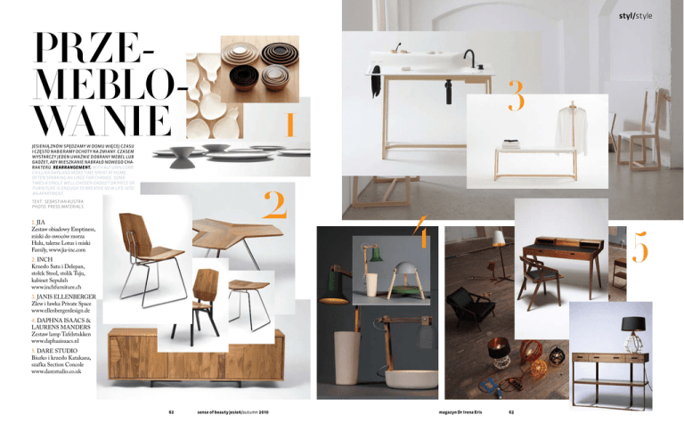 styl/style PRZEMEBLOWANIE JESIENIĄ ZNÓW SPĘDZAMY W DOMU WIĘCEJ CZASU I CZĘSTO NABIERAMY OCHOTY NA ZMIANY. CZASEM WYSTARCZY JEDEN UWAŻNIE DOBRANY MEBEL LUB GADŻET, ABY MIESZKANIE NABRAŁO NOWEGO CHARAKTERU. REARRANGEMENT. WITH AUTUMN COME CHILLIER DAYS AND MORE TIME SPENT AT HOME, OFTEN SPARKING AN URGE FOR CHANGE. SOMETIMES A SINGLE WELL-CHOSEN GADGET OR PIECE OF FURNITURE IS ENOUGH TO BREATHE NEW LIFE INTO AN APARTMENT. 1 2 TEXT : SEBASTIAN KUSTRA PHOTO: PRESS MATERIALS 1. JIA Zestaw obiadowy Emptiness, miski do owoców morza Hulu, talerze Lotus i miski Family, www.jia-inc.com 3 4 5 2. INCH Krzesło Satu i Delepan, stołek Stool, stolik Tuju, kabinet Sepuluh www.inchfurniture.ch 3. JANIS ELLENBERGER Zlew i ławka Private Space www.ellenbergerdesign.de 4. DAPHNA ISAACS & LAURENS MANDERS Zestaw lamp Tafelstukken www.daphaaisaacs.nl 5. DARE STUDIO Biurko i krzesło Katakana, szafka Section Concole www.darestudio.co.uk 62 sense of beauty jesien/autumn 2010 magazyn Dr Irena Eris 63 6. ATELIER NL Holenderska ceramika www.ateliernl.com 7. KEVIN KRUMNIKL Szafka audio Disko, łóżko Hotel, wazon Flowertower www.krumnikl.com styl/style 6 7 8. NOON STUDIO Sofa Cut, lampa Compas, stolik Tripod www.noonstudio.co.uk 9. JONAS WAGELL Lampy Odd i Pedant, zestaw mebli Circus, doniczki Block www.jonaswagell.se Materiał powstał przy współpracy z serią przewodników Futu Ideas. Tom pierwszy: Futu Ideas Home do nabycia w salonach prasowych i najlepszych concept stores w Polsce. www.futu.pl Written in cooperation with the Futu Ideas series of guides. The first volume, Futu Ideas Home, is now available at newsstands and select concept stores in Poland. 8 9