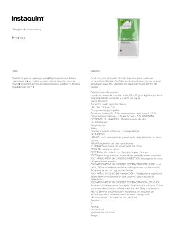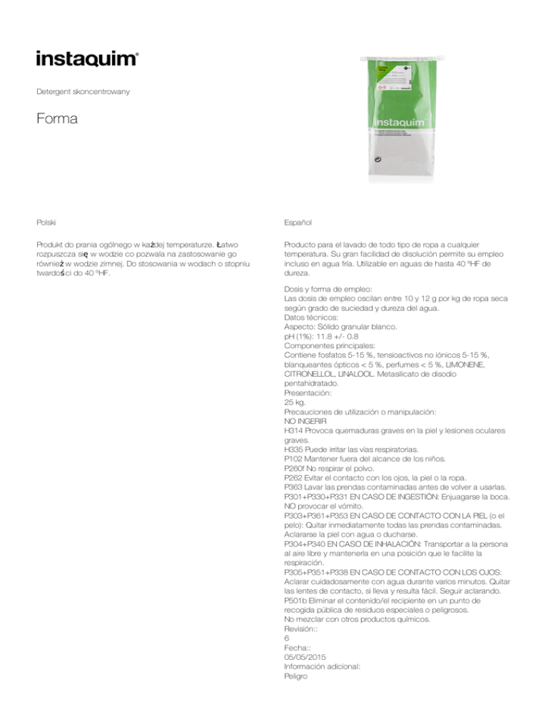 Detergentskoncentrowany Forma Polski Español Produktdopraniaogólnegowkażdejtemperaturze.Łatwo rozpuszczasięwwodziecopozwalanazastosowaniego równieżwwodziezimnej.Dostosowaniawwodachostopniu twardoś cido40ºHF. Productoparaellavadodetodotipoderopaacualquier temperatura.Sugranfacilidaddedisoluciónpermitesuempleo inclusoenaguafría.Utilizableenaguasdehasta40ºHFde dureza. Dosisyformadeempleo: Lasdosisdeempleooscilanentre10y12gporkgderopaseca segúngradodesuciedadydurezadelagua. Datostécnicos: Aspecto:Sólidogranularblanco. pH(1%):11.8+/-0.8 Componentesprincipales: Contienefosfatos5-15%,tensioactivosnoiónicos5-15%, blanqueantesópticos<5%,perfumes<5%,LIMONENE, CITRONELLOL,LINALOOL.Metasilicatodedisodio pentahidratado. Presentación: 25kg. Precaucionesdeutilizaciónomanipulación: NOINGERIR H314Provocaquemadurasgravesenlapielylesionesoculares graves. H335Puedeirritarlasvíasrespiratorias. P102Mantenerfueradelalcancedelosniños. P260fNorespirarelpolvo. P262Evitarelcontactoconlosojos,lapielolaropa. P363Lavarlasprendascontaminadasantesdevolverausarlas. P301+P330+P331ENCASODEINGESTIÓN:Enjuagarselaboca. NOprovocarelvómito. P303+P361+P353ENCASODECONTACTOCONLAPIEL(oel pelo):Quitarinmediatamentetodaslasprendascontaminadas. Aclararselapielconaguaoducharse. P304+P340ENCASODEINHALACIÓN:Transportaralapersona alairelibreymantenerlaenunaposiciónquelefacilitela respiración. P305+P351+P338ENCASODECONTACTOCONLOSOJOS: Aclararcuidadosamenteconaguadurantevariosminutos.Quitar laslentesdecontacto,sillevayresultafácil.Seguiraclarando. P501bEliminarelcontenido/elrecipienteenunpuntode recogidapúblicaderesiduosespecialesopeligrosos. Nomezclarconotrosproductosquímicos. Revisión:: 6 Fecha:: 05/05/2015 Informaciónadicional: Peligro Informaciónadicional: UN3262 Atención!/Warning! DetervicS.A. PolígonIndustrialCan Malloles SantLlorençDesmunts,32 08500Vic Barcelona T938891344 F938891640 [email protected] instaquim.com