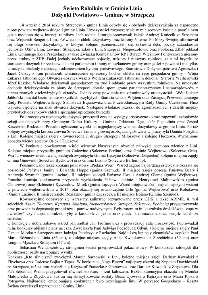 Święto Rolników w Gminie Linia Dożynki Powiatowo – Gminne w Strzepczu 14 września 2014 roku w Strzepczu - gmina Linia odbyły się - obchody dziękczynienia za tegoroczne plony powiatu wejherowskiego i gminy Linia. Uroczystości rozpoczęły się w miejscowym kościele parafialnym gdzie modlono się w intencji rolników i ich rodzin. Liturgię sprawowali księża Andrzej Kmiecik ze Strzepcza oraz Wojciech Senger z Lini. Poświęcono chleb dożynkowy oraz korony żniwne. Po Mszy Świętej uformował się długi korowód dożynkowy, w którym kolejno przemieszczali się: orkiestra dęta, poczty sztandarowe jednostek OSP z Lini, Lewina i Strzepcza, szkół z Lini, Strzepcza, Niepoczołowic oraz Pobłocia, ZK-P oddział Linia, Gminnego Koła Pszczelarzy a także Związku Kombatantów RP i Byłych Więźniów Politycznych niesiony przez druhny z ZHP. Dalej jechały udekorowane pojazdy, traktory i maszyny rolnicze, za nimi bryczki ze starostami dożynek i przedstawicielami parlamentu i tłumy mieszkańców gminy oraz gości z powiatu i nie tylko. Uroczyste obchody rozpoczęto odśpiewaniem hymnu państwowego. Starostowie Dożynek państwo Agnieszka i Jacek Garscy z Lini przekazali własnoręcznie upieczony bochen chleba na ręce gospodarza gminy - Wójta Łukasza Jabłońskiego. Otwarcia dożynek wraz z Wójtem Łukaszem Jabłońskim dokonał Starosta Wejherowski Józef Reszke. Włodarze dziękowali gospodarzom za trud i oddanie pracy wszystkim rolnikom. Na uroczyste obchody dziękczynienia za plony do Strzepcza dotarło spore grono parlamentarzystów i samorządowców z terenu znanych z telewizyjnych ekranów. Jednak żeby powitania nie zdominowały uroczystości - Wójt Łukasz Jabłoński powitał bezimiennie wszystkich przybyłych. Starosta wraz z Wójtem oraz Zastępcą Przewodniczącego Rady Powiatu Wejherowskiego Stanisławą Bujanowicz oraz Przewodniczącym Rady Gminy Czesławem Hinz wypuścili gołębie na znak otwarcia dożynek. Następnie włodarze przeszli do zgromadzonych i dzielili między przybyłych dożynkowy chleb i specjalnie upieczone bułeczki. Po uroczystym rozpoczęciu dożynek przyszedł czas na występy artystyczne - które zapewnili członkowie sekcji działających przy Gminnym Domu Kultury - Gminna Orkiestra Dęta, chór Pięciolinia oraz Zespół Kaszebsko Rodzezna. Ponadto ogłoszono wyniki na najpiękniejszy wieniec dożynkowy w gminie Linia. Po raz kolejny zwyciężyła korona żniwna Sołectwa Linia, a główną osobą zaangażowaną w pracę była Danuta Potrykus z Lini. Kolejne miejsca zajęły - równorzędne 2. drugie- Strzepcz i Miłoszewo a kolejne Tłuczewo. Wyróżniono ponadto wieńce sołectw Osiek i Tłuczewo. W konkursie powiatowym wśród wieńców klasycznych również najwyżej oceniono wieniec z Lini. Kolejne miejsca przypadły gminom Gniewino (Sołectwo Perlino) oraz Gminie Wejherowo (Sołectwo Orle). Wśród wieńców niekonwencjonalnych zwyciężyła Gmina Łęczyce (Sołectwo Dzięcielec) kolejne miejsca zajęły Gmina Gniewino (Sołectwo Bychowo) oraz Gmina Luzino (Sołectwo Barłomino). Podsumowano także konkurs powiatowy „Piękna Wieś". Wśród zagród najbardziej estetyczna okazała się posiadłość Państwa Janiny i Edwarda Hoppe (gmina Szemud), II miejsce zajęła posesja Państwa Beaty i Andrzeja Szymich (gmina Luzino), III miejsce zdobyli Państwo Ewa i Andrzej Glama (gmina Wejherow). Ponadto komisja konkursowa przyznała wyróżnienia Państwu Janinie i Henrykowi Malinowskim (gmina Choczewo) oraz Elżbiecie i Ryszardowi Miotk (gmina Łęczyce). Wśród miejscowości - najładniejszymi wsiami w powiecie wejherowskim w 2014 roku okazały się równorzędnie Orle (gmina Wejherowo) oraz Robakowo (Gmina Luzino), II miejsce zajęło Rozłazino (gmina Łęczyce), a III miejsce Bojano (Gmina Szemud). Równocześnie odbywały się warsztaty kulinarne przygotowane przez GDK a także ARiMR. 8. wsi sołeckich (Linia, Tłuczewo, Kętrzyno, Smażyno, Niepoczołowice, Strzepcz, Zakrzewo, Pobłocie) przygotowywało oraz prowadziło degustację produktów i potraw tradycyjnych. Były zatem m.in. kaszubska drożdżówka, zupa w „wreków" czyli zupa z brukwi, ryby z kaszubskich jezior oraz placki ziemniaczane oraz swojski chleb ze smalcem. O kondycję i dobrą zabawę wśród pań zadbał Jan Trofimowicz - prowadzący całą uroczystość. Poprowadził m.in. konkursy ubijania piany na czas. Zwyciężyła Pani Jadwiga Poczobut z Gdyni, a kolejne miejsca zajęły Pani Danuta Miotka z Strzepcza oraz Jadwiga Patelczyk z Rozłazina. Najdłuższą łupinę z ziemniaków uzyskała Pani Maria Różańska z Linia (86 cm), a kolejne miejsca zajęły Anna Kwiatkowska z Strzebielina (59 cm) oraz Longina Myszka z Strzepcza (47 cm). Sebastian Wenta czołowy strongmen świata przeprowadził pokaz siłowy. W konkursach siłowych dla publiczności padły następujące wyniki. Konkurs „Kto silniejszy” zwyciężył Marcin Sarnowski z Lini, kolejne miejsca zajęli Dariusz Kowalski z Zbychowa oraz Tadeusz Bojka z Tępcz. W konkursie „Noga Płaczu” najlepszy okazał się Krystian Dawidowski ze Strzepcza, tuż za nim znaleźli się Krzysztof Pranczke z Grabowsca oraz Dariusz Kowalski z Zbychowa. Dla Pań Sebastian Wenta przygotował również konkurs – rzut kaloszem. Bezkonkurencyjna okazała się Monika Małowiecka z Zbychowa, tuż za nią sklasyfikowane zostały Beata Ojowska z Kętrzyna oraz Maria Pipka z Potęgowa. Najbardziej emocjonującą konkurencją było przeciąganie liny. W potyczce Gospodarze – Reszta Świata zwyciężyli reprezentanci Gminy Linia. Wszyscy biorący udział w konkursach otrzymywali nagrody w postaci książek, sprzętu turystycznego oraz dyplomów i pucharów. Ponadto odbyły się także konkursy wiedzy w których najlepsi otrzymali tablety oraz MP4. Nagrody ufundowała Agencja Restrukturyzacji i Modernizacji Rolnictwa .Konkurs wiedzy ekologicznej w którym udział wzięli uczniowie szkół gimnazjalnych z terenu powia