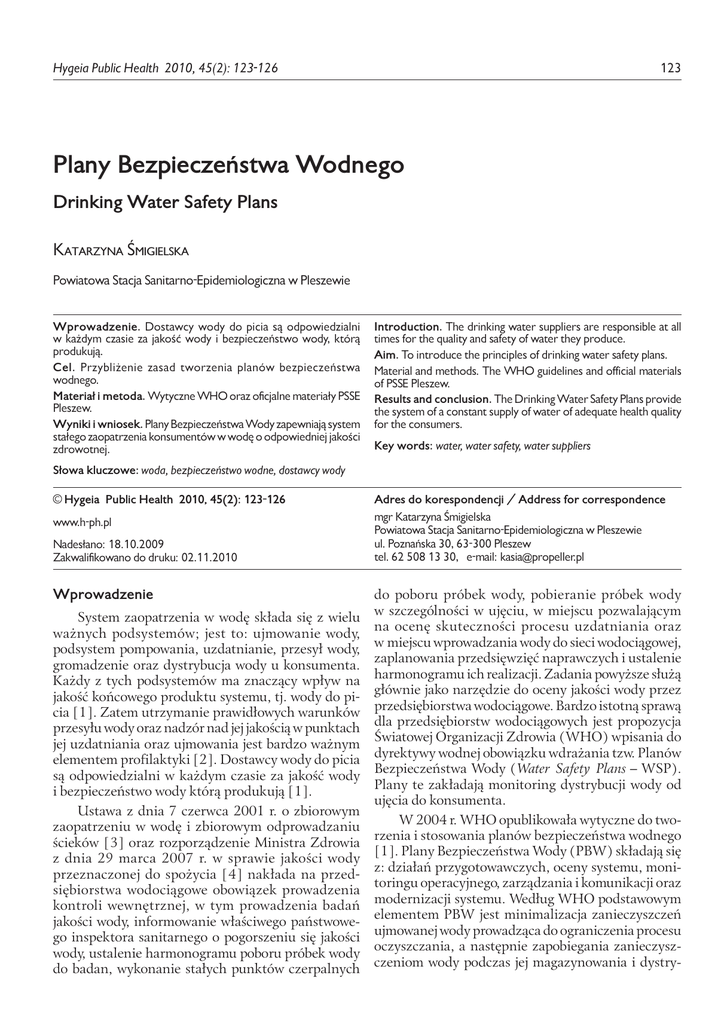 Śmigielska Hygeia Public K. Health Plany Bezpieczeństwa 2010, 45(2): 123-126 Wodnego 123 Plany Bezpieczeństwa Wodnego Drinking Water Safety Plans Katarzyna Śmigielska Powiatowa Stacja Sanitarno-Epidemiologiczna w Pleszewie Wprowadzenie. Dostawcy wody do picia są odpowiedzialni w każdym czasie za jakość wody i bezpieczeństwo wody, którą produkują. Cel. Przybliżenie zasad tworzenia planów bezpieczeństwa wodnego. Materiał i metoda. Wytyczne WHO oraz oficjalne materiały PSSE Pleszew. Wyniki i wniosek. Plany Bezpieczeństwa Wody zapewniają system stałego zaopatrzenia konsumentów w wodę o odpowiedniej jakości zdrowotnej. Introduction. The drinking water suppliers are responsible at all times for the quality and safety of water they produce. Aim. To introduce the principles of drinking water safety plans. Material and methods. The WHO guidelines and official materials of PSSE Pleszew. Results and conclusion. The Drinking Water Safety Plans provide the system of a constant supply of water of adequate health quality for the consumers. Key words: water, water safety, water suppliers Słowa kluczowe: woda, bezpieczeństwo wodne, dostawcy wody © Hygeia Public Health 2010, 45(2): 123-126 Adres do korespondencji / Address for correspondence www.h-ph.pl mgr Katarzyna Śmigielska Powiatowa Stacja Sanitarno-Epidemiologiczna w Pleszewie ul. Poznańska 30, 63-300 Pleszew tel. 62 508 13 30, e-mail: [email protected] Nadesłano: 18.10.2009 Zakwalifikowano do druku: 02.11.2010 Wprowadzenie System zaopatrzenia w wodę składa się z wielu ważnych podsystemów; jest to: ujmowanie wody, podsystem pompowania, uzdatnianie, przesył wody, gromadzenie oraz dystrybucja wody u konsumenta. Każdy z tych podsystemów ma znaczący wpływ na jakość końcowego produktu systemu, tj. wody do picia [1]. Zatem utrzymanie prawidłowych warunków przesyłu wody oraz nadzór nad jej jakością w punktach jej uzdatniania oraz ujmowania jest bardzo ważnym elementem profilaktyki [2]. Dostawcy wody do picia są odpowiedzialni w każdym czasie za jakość wody i bezpieczeństwo wody którą produkują [1]. Ustawa z dnia 7 czerwca 2001 r. o zbiorowym zaopatrzeniu w wodę i zbiorowym odprowadzaniu ścieków [3] oraz rozporządzenie Ministra Zdrowia z dnia 29 marca 2007 r. w sprawie jakości wody przeznaczonej do spożycia [4] nakłada na przedsiębiorstwa wodociągowe obowiązek prowadzenia kontroli wewnętrznej, w tym prowadzenia badań jakości wody, informowanie właściwego państwowego inspektora sanitarnego o pogorszeniu się jakości wody, ustalenie harmonogramu poboru próbek wody do badan, wykonanie stałych punktów czerpalnych do poboru próbek wody, pobieranie próbek wody w szczególności w ujęciu, w miejscu pozwalającym na ocenę skuteczności procesu uzdatniania oraz w miejscu wprowadzania wody do sieci wodociągowej, zaplanowania przedsięwzięć naprawczych i ustalenie harmonogramu ich realizacji. Zadania powyższe służą głównie jako narzędzie do oceny jakości wody przez przedsiębiorstwa wodociągowe. Bardzo istotną sprawą dla przedsiębiorstw wodociągowych jest propozycja Światowej Organizacji Zdrowia (WHO) wpisania do dyrektywy wodnej obowiązku wdrażania tzw. Planów Bezpieczeństwa Wody (Water Safety Plans – WSP). Plany te zakładają monitoring dystrybucji wody od ujęcia do konsumenta. W 2004 r. WHO opublikowała wytyczne do tworzenia i stosowania planów bezpieczeństwa wodnego [1]. Plany Bezpieczeństwa Wody (PBW) składają się z: działań przygotowawczych, oceny systemu, monitoringu operacyjnego, zarządzania i komunikacji oraz modernizacji systemu. Według WHO podstawowym elementem PBW jest minimalizacja zanieczyszczeń ujmowanej wody prowadząca do ograniczenia procesu oczyszczania, a następnie zapobiegania zanieczyszczeniom wody podczas jej magazynowania i dystry- Hygeia Public Health 2010, 45(2): 123-126 124 bucji. Według WHO plany te są najefektywniejszym sposobem zapewnienia bezpieczeństwa zaopatrzenia w wodę, spełniającą normy prawne [5]. Jedyna kontrowersyjna sprawa wprowadzenia obligatoryjnie PBW – to problem znacznego wzrostu kosztów eksploatacyjnych, głównie dla małych wiejskich przedsiębiorstw, czyli systemów składających się ze stacji uzdatniana oraz sieci przesyłowej i dystrybucji. A to one stanowią największe zabezpieczenie wody dla odbiorców. Materiał i metoda WHO opracowała w 2009 r. i opublikowała „Podręcznik opracowania planów bezpieczeństwa wodnego - Zarządzania ryzykiem krok po kroku – instrukcje dla dostawców wody do spożycia” [6]. Na podstawie tych wytycznych zostały przygotowane poniższe moduły PBW (ryc. 1-5). PBW to proces systematyczny, ciągły i dynamiczny. Plany PBW składają się z 11 modułów. Plan Bezpieczeństwa Wodnego Przygotowanie PBW Opis systemu zaopatrzenia w wodę dokumentacja PBW Istniejące środki zabezpieczające Dodatkowe lub ulepszone środki zabezpieczające Kontrolowanie zagrożeń Wdrożenie środków zabezp. zarządzanie nimi Monitoring środków zabezpieczających planowy przegląd okresowy Identyfikacja zagrożeń Lista priorytetowa ryzyk plan usprawnienia i modernizacji Ocena systemu Przygotowanie procedur zarządzania Weryfikacja i audyt PBW Ryc. 1. Ogólne założenia i sposób wdrażania planów bezpieczeństwa wodnego Fig. 1. General assumptions and introduction of water safety plans Jakie zagrożenia istnieją w moim systemie zaopatrzenia? zamknięty cykl Skąd wiem, że zagrożenia zlikwidowano? Ryc. 2. PBW w uproszczeniu Fig. 2. Water Safety Plans abbreviated Jak zlikwidować zagrożenia? Moduł 1 obejmuje powołanie zespołu ds. PBW i podjęcia decyzji na temat metodologii, według której opracowany zostanie PBW. Strategia PBW musi być prosta i napisana łatwym językiem. W skład zespołu powinny wchodzić osoby kompetentne, tj. inżynierowie, z działu operacyjnego, konserwacji i projektowego, dalej personel odpowiedzialny za kontrole jakości wody (mikrobio
