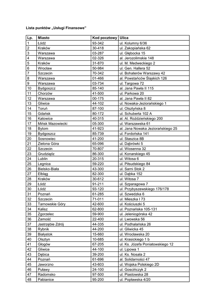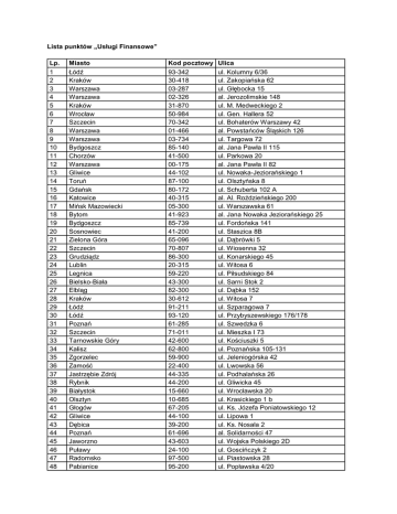 Lista punktów „Usługi Finansowe” Lp. 1 2 3 4 5 6 7 8 9 10 11 12 13 14 15 16 17 18 19 20 21 22 23 24 25 26 27 28 29 30 31 32 33 34 35 36 37 38 39 40 41 42 43 44 45 46 47 48 Miasto Łódź Kraków Warszawa Warszawa Kraków Wrocław Szczecin Warszawa Warszawa Bydgoszcz Chorzów Warszawa Gliwice Toruń Gdańsk Katowice Mińsk Mazowiecki Bytom Bydgoszcz Sosnowiec Zielona Góra Szczecin Grudziądz Lublin Legnica Bielsko-Biała Elbląg Kraków Łódź Łódź Poznań Szczecin Tarnowskie Góry Kalisz Zgorzelec Zamość Jastrzębie Zdrój Rybnik Białystok Olsztyn Głogów Gliwice Dębica Poznań Jaworzno Puławy Radomsko Pabianice Kod pocztowy 93-342 30-418 03-287 02-326 31-870 50-984 70-342 01-466 03-734 85-140 41-500 00-175 44-102 87-100 80-172 40-315 05-300 41-923 85-739 41-200 65-096 70-807 86-300 20-315 59-220 43-300 82-300 30-612 91-211 93-120 61-285 71-011 42-600 62-800 59-900 22-400 44-335 44-200 15-660 10-685 67-205 44-100 39-200 61-696 43-603 24-100 97-500 95-200 Ulica ul. Kolumny 6/36 ul. Zakopiańska 62 ul. Głębocka 15 al. Jerozolimskie 148 ul. M. Medweckiego 2 ul. Gen. Hallera 52 ul. Bohaterów Warszawy 42 al. Powstańców Śląskich 126 ul. Targowa 72 al. Jana Pawła II 115 ul. Parkowa 20 al. Jana Pawła II 82 ul. Nowaka-Jeziorańskiego 1 ul. Olsztyńska 8 ul. Schuberta 102 A al. Al. Roździeńskiego 200 ul. Warszawska 61 al. Jana Nowaka Jeziorańskiego 25 ul. Fordońska 141 ul. Staszica 8B ul. Dąbrówki 5 ul. Wiosenna 32 ul. Konarskiego 45 ul. Witosa 6 ul. Piłsudskiego 84 ul. Sarni Stok 2 ul. Dąbka 152 ul. Witosa 7 ul. Szparagowa 7 ul. Przybyszewskiego 176/178 ul. Szwedzka 6 ul. Mieszka I 73 ul. Kościuszki 5 ul. Poznańska 105-131 ul. Jeleniogórska 42 ul. Lwowska 56 ul. Podhalańska 26 ul. Gliwicka 45 ul. Wrocławska 20 ul. Krasickiego 1 b ul. Ks. Józefa Poniatowskiego 12 ul. Lipowa 1 ul. Ks. Nosala 2 al. Solidarności 47 ul. Wojska Polskiego 2D ul. Goscińczyk 2 ul. Piastowska 28 ul. Popławska 4/20 49 50 51 52 53 54 55 56 57 58 59 60 61 62 63 64 65 66 67 68 69 70 71 72 73 74 75 76 77 78 79 Łódź Inowrocław Kraków Mława Opole Wrocław Gdańsk Nowy Sącz Oświęcim Kłodzko Poznań Bydgoszcz Olkusz Kutno Bolesławiec Chojnice Konin Kędzierzyn-Koźle Starogard Gdański Sochaczew Bełchatów Gniezno Kwidzyn Tczew Kraków Warszawa Gdańsk Biała Podlaska Starachowice Tarnów Radom 94-020 88-109 31-564 06-500 46-022 54-610 80-174 33-300 32-600 57-300 60-201 85-791 32-300 99-300 59-700 89-604 62-510 47-220 83-200 96-500 97-400 62-200 82-500 83-110 31-154 02-675 80-264 21-500 27-200 33-100 26-611 ul. Bandurskiego 49 ul. Wojska Polskiego 10 al. Pokoju 44 ul. Targowa 13 ul. Dębowa 1 ul. Graniczna 2A ul. Przywidzka 6 ul. Węgierska 170 ul. Powstańców Śląskich 1 ul. Noworudzka 2 ul. Górecka 30 ul. Skarżyńskiego 2 ul. Rabsztyńska 2 ul. Oporowska 6A ul. 10-go Marca 1 ul. Bayeux 1 ul. Paderewskiego 8 ul. Kozielska 20 ul. Niepodległości 2a ul. Warszawska 119 ul. Kolejowa 4 ul. Pałucka 2 ul. 3 Maja 26 ul. Braci Grimm 4 ul. Pawia 5 ul. Wołoska 12 ul. Grunwaldzka 141 ul. Jana III Sobieskiego 9 ul. Krzosa 6 ul. Romanowicza 59 ul. Gagarina 9