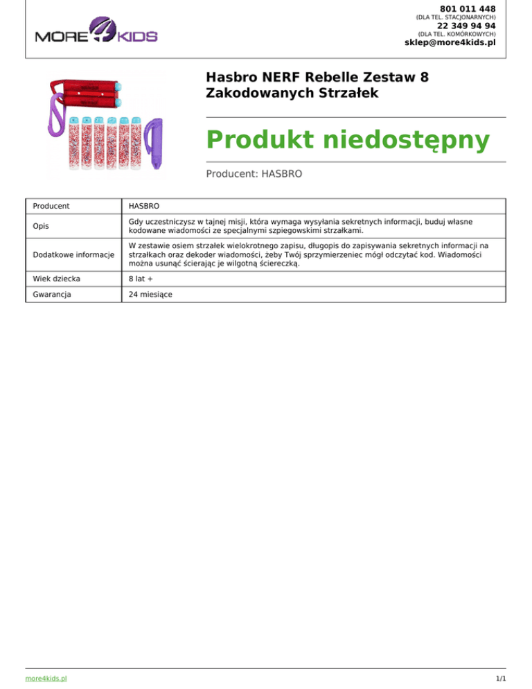 801 011 448 (DLA TEL. STACJONARNYCH) 22 349 94 94 (DLA TEL. KOMÓRKOWYCH) [email protected] Hasbro NERF Rebelle Zestaw 8 Zakodowanych Strzałek Produkt niedostępny Producent: HASBRO Producent HASBRO Opis Gdy uczestniczysz w tajnej misji, która wymaga wysyłania sekretnych informacji, buduj własne kodowane wiadomości ze specjalnymi szpiegowskimi strzałkami. Dodatkowe informacje W zestawie osiem strzałek wielokrotnego zapisu, długopis do zapisywania sekretnych informacji na strzałkach oraz dekoder wiadomości, żeby Twój sprzymierzeniec mógł odczytać kod. Wiadomości można usunąć ścierając je wilgotną ściereczką. Wiek dziecka 8 lat + Gwarancja 24 miesiące more4kids.pl 1/1