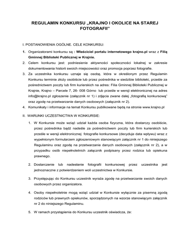 REGULAMIN KONKURSU „KRAJNO I OKOLICE NA STAREJ FOTOGRAFII” I. POSTANOWIENIA OGÓLNE. CELE KONKURSU: 1. Organizatorami konkursu są : Właściciel portalu internetowego krajno.pl wraz z Filią Gminnej Biblioteki Publicznej w Krajnie. 2. Celem konkursu jest: podniesienie aktywności społeczności lokalnej w zakresie dokumentowania historii swoich miejscowości oraz promocja poprzez fotografie. 3. Za uczestnika konkursu uznaje się osobę, która w określonym przez Regulamin Konkursu terminie złoży osobiście lub przez pośrednika w siedzibie biblioteki, prześle za pośrednictwem poczty lub firm kurierskich na adres: Filia Gminnej Biblioteki Publicznej w Krajnie, Krajno – Parcele 7, 26- 008 Górno lub prześle w wersji elektronicznej na adres [email protected] zgłoszenie (załącznik nr 1) i zdjęcia zwane dalej „fotografią konkursową” oraz zgodę na przetwarzanie danych osobowych (załącznik nr 2). 4. Komunikaty i informacje na temat Konkursu publikowane będą na stronie www.krajno.pl II. WARUNKI UCZESTNICTWA W KONKURSIE: 1. W Konkursie może wziąć udział każda osoba fizyczna, która dostarczy osobiście, przez pośrednika bądź nadeśle za pośrednictwem poczty lub firm kurierskich lub prześle w wersji elektronicznej fotografie konkursowe (decyduje data wpływu) wraz z wypełnionym formularzem zgłoszeniowym stanowiącym załącznik nr 1 do niniejszego Regulaminu oraz zgodę na przetwarzanie danych osobowych (załącznik nr 2), a w przypadku osób niepełnoletnich załącznik podpisany przez rodzica lub opiekuna prawnego. 2. Dostarczenie lub nadesłanie fotografii konkursowej przez uczestnika jest jednoznaczne z potwierdzeniem woli uczestnictwa w Konkursie. 3. Przystępując do Konkursu uczestnik wyraża zgodę na przetwarzanie swoich danych osobowych przez organizatora. 4. Osoby niepełnoletnie mogą wziąć udział w Konkursie wyłącznie za pisemną zgodą rodziców lub prawnych opiekunów, sporządzonych na wzorze stanowiącym załącznik nr 2 do niniejszego Regulaminu. 5. W ramach przystąpienia do Konkursu uczestnik oświadcza, że: zgłoszone do Konkursu fotografie konkursowe nie naruszają praw osób trzecich, w szczególności praw majątkowych i osobistych, a także praw autorskich innych podmiotów, udziela organizatorowi Konkursu bezterminowej i nieodpłatnej zgody na korzystanie z fotografii konkursowych w celu ich publikacji bez ograniczeń czasowych i terytorialnych, z zastrzeżeniem podania nazwiska uczestnika przy publikacji jego fotografii. 6. W przypadku pojawienia się ze strony osób trzecich ewentualnych roszczeń wynikających z tytułu naruszenia praw autorskich lub innych praw osobistych przez uczestnika, uczestnik zobowiązany będzie, jako osoba wyłącznie odpowiedzialna, do pokrycia wszelkich szkód oraz roszczeń odszkodowawczych. 7. Fotografie, do których nie zostaną załączone oświadczenia uczestnika lub opiekuna prawnego (w przypadku osób niepełnoletnich),co do zgody na przetwarzanie danych osobowych nie będą brały udziału w Konkursie. III. FOTOGRAFIE KONKURSOWE 1. Każdy z uczestników może zgłosić do konkursu maksymalnie dziesięć zdjęć. 2. Fotografie konkursowe muszą przedstawiać: wydarzenia kulturalne i społeczne, uroczystości kościelne, zwyczaje oraz codzienne życie mieszkańców, miejsca, budynki, walory przyrodnicze itp. wyłącznie z terenu Krajna i okolic, które terytorialnie należą do gminy Górno. Dopuszcza się do konkursu fotografie z sąsiadującej z Krajnem Świętej Katarzyny. 3. Do konkursu przyjmowane będą zdjęcia wykonane przed rokiem 1980 4. Na odwrocie fotografii lub na przypiętej do zdjęcia kartce, a w przypadku zdjęć przekazanych w wersji elektronicznej w dodatkowym opisie załączonym w elektronicznym dokumencie tekstowym należy umieścić metryczkę zawierającą dane: tytuł fotografii(co przedstawia), imię i nazwisko uczestnika, data urodzenia, imię i nazwisko opiekuna(w przypadku, gdy autor nie jest pełnoletni), adres zamieszkania i nr telefonu. 5. Organizator zastrzega sobie prawo do wykluczenia z udziału w Konkursie fotografii konkursowych sprzecznych z przepisami prawa, dobrymi obyczajami lub z innych względów powodujących, że nie nadają się one do publicznej prezentacji i rozpowszechniania. 6. O wykluczeniu fotografii konkursowych decyduje organizator. Decyzja organizatora jest ostateczna i nie ma od niej odwołania. 7. Ze względu na fakt, że dostarczone na Konkurs fotografie w wielu przypadkach stanowią cenne pamiątki rodzinne organizator zwróci je uczestnikom po uprzednim zeskanowaniu i zakończeniu wystaw związanych z Konkursem. IV. ODPOWIEDZIALNOŚĆ ORGANIZATORA 1. Organizator nie ponosi odpowiedzialności za ewentualne roszczenia osób trzecich z tytułu naruszenia praw autorskich lub innych praw osobistych przez uczestnika Konkursu. 2. Organizator nie ponosi odpowiedzialności za nie odebranie nagród przez laureatów Konkursu, w przypadku gdy brak odbioru wynikł z przyczyn niezależnych od organizatora. 3. Organizator nie ponosi odpowiedzialności za ewentualne problemy techniczne, w szczególności związane ze zgłaszanymi pracami, które mogłyby mieć wpływ na wypełnienie warunków uczestnictwa w Konkursie. V. POSTANOWIENIA KOŃCOWE: 1. Termin zgłaszania fotografii konkursowych upływa 31 stycznia 2014 roku. 2. Organizator zastrzega sobie prawo do dokonania zmian w Regulaminie Konkursu. Wszelkie zmiany dokonane przez organizatora będą publikowane na stronie Organizatora. 3. Prace konkursowe oceni Jury powołane przez organizatora. 4. Decyzje Jury są ostateczne i nie przysługuje od nich odwołanie. 5. Organizator Konkursu kontaktować będzie się z laureatami Konkursu osobiście, telefonicznie lub za pośrednictwem poczty elektronicznej. 6. Wyniki konkursu zostaną opublikowane na stronie krajno.pl oraz na tablicy ogłoszeniowej w Bibliotece Publicznej w Krajnie. 7. Organizator przewiduje nagrody i wyróżnienia indywidualne w kate