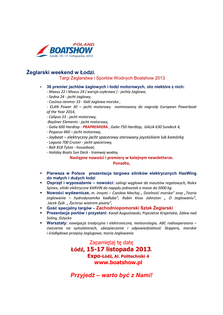 Żeglarski weekend w Łodzi. Targi Żeglarstwa i Sportów Wodnych Boatshow 2013 36 premier jachtów żaglowych i łodzi motorowych, oto niektóre z nich: - Maxus 22 i Maxus 24 ( wersja szybrowa ) - jachty żaglowe, - Sedna 24 - jacht żaglowy, - Cosinus-Janmor 33 - łódź żaglowa morska , - ELAN Power 30 – jacht motorowy nominowany do nagrody European Powerboat of the Year 2014, - Calipso 23 - jacht motorowy, -Bayliner Elements - jacht motorowy, - Galia 600 Hardtop - PRAPREMIERA , Galia 750 Hardtop, GALIA 630 Sundeck 4, - Pegazus 460 – jacht motorowy, - Joyboat – elektryczny jacht spacerowy sterowany joystickiem lub komórką - Laguna 700 Cruiser - jacht spacerowy, - Balt 818 Tytan - houseboat, - Holiday Boats Sun Deck - tramwaj wodny, Następne nowości i premiery w kolejnym newsletterze. Ponadto, Pierwsza w Polsce prezentacja targowa silników elektrycznych HasWing do małych i dużych łodzi Osprzęt i wyposażenie – nowości: salingi węglowe do masztów regatowych, Rolex Spinex, silniki elektryczne KARVIN do napędu jednostek o masie do 5000 kg. Nowości wydawnicze, m. innymi – Czesław Machaj „ Dzielność morska” oraz „Teoria żeglowania – hydrodynamika kadłuba”, Robin Knox Johnston „ O żeglowaniu”, Jacek Zyśk „ Życiorys wiatrem pisany”, Gość specjalny targów – Zachodniopomorski Szlak Żeglarski Prezentacja portów i przystani: Kanał Augustowski, Pojezierze Krajeńskie, Zalew nad Soliną, Giżycko Warsztaty: nawigacja tradycyjna i elektroniczna, meteorologia, ABC radiooperatora – ćwiczenia na symulatorach, ubezpieczenie i odpowiedzialność Skippera, morskie i śródlądowe przepisy żeglugowe, teoria żeglowania Zapamiętaj tę datę Łódź, 15-17 listopada 2013. Expo-Łódź, Al. Politechniki 4 www.boatshow.pl Przyjedź – warto być z Nami!