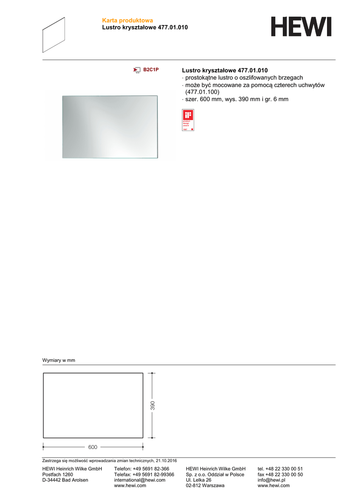 Karta produktowa Lustro kryształowe 477.01.010 B2C1P Lustro kryształowe 477.01.010 ⋅ prostokątne lustro o oszlifowanych brzegach ⋅ może być mocowane za pomocą czterech uchwytów (477.01.100) ⋅ szer. 600 mm, wys. 390 mm i gr. 6 mm Wymiary w mm Zastrzega się możliwość wprowadzania zmian technicznych, 21.10.2016 HEWI Heinrich Wilke GmbH Postfach 1260 D-34442 Bad Arolsen Telefon: +49 5691 82-366 Telefax: +49 5691 82-99366 [email protected] www.hewi.com HEWI Heinrich Wilke GmbH Sp. z o.o. Oddział w Polsce Ul. Lelka 26 02-812 Warszawa tel. +48 22 330 00 51 fax +48 22 330 00 50 [email protected] www.hewi.com