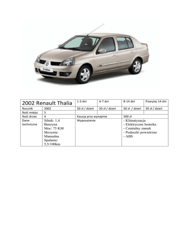 2002 Renault Thalia 1-3 dni 4-7 dni 8-14 dni Powyżej 14 dni Rocznik Ilość miejsc Ilość drzwi Dane techniczne 50 zł / dzień 50 zł / dzień 50 zł / dzień 50 zł / dzień 2002 5 4 Silnik: 1,4 Benzyna Moc: 75 KM Skrzynia: Manualna Spalanie: 5,5/100km Kaucja przy wynajmie Wyposażenie 500 zł - Klimatyzacja - Elektryczne lusterka - Centralny zamek - Poduszki powietrzne - ABS