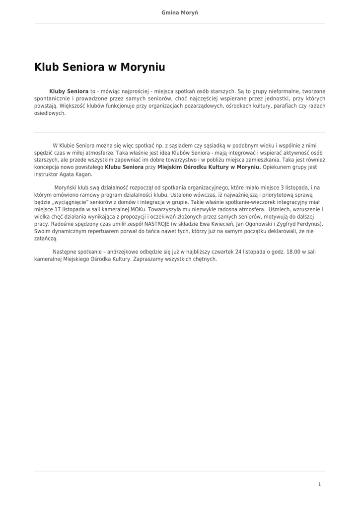 Gmina Moryń Klub Seniora w Moryniu Kluby Seniora to - mówiąc najprościej - miejsca spotkań osób starszych. Są to grupy nieformalne, tworzone spontanicznie i prowadzone przez samych seniorów, choć najczęściej wspierane przez jednostki, przy których powstają. Większość klubów funkcjonuje przy organizacjach pozarządowych, ośrodkach kultury, parafiach czy radach osiedlowych. W Klubie Seniora można się więc spotkać np. z sąsiadem czy sąsiadką w podobnym wieku i wspólnie z nimi spędzić czas w miłej atmosferze. Taka właśnie jest idea Klubów Seniora - mają integrować i wspierać aktywność osób starszych, ale przede wszystkim zapewniać im dobre towarzystwo i w pobliżu miejsca zamieszkania. Taka jest również koncepcja nowo powstałego Klubu Seniora przy Miejskim Ośrodku Kultury w Moryniu. Opiekunem grupy jest instruktor Agata Kagan. Moryński klub swą działalność rozpoczął od spotkania organizacyjnego, które miało miejsce 3 listopada, i na którym omówiono ramowy program działalności klubu. Ustalono wówczas, iż najważniejszą i priorytetową sprawą będzie „wyciągnięcie” seniorów z domów i integracja w grupie. Takie właśnie spotkanie-wieczorek integracyjny miał miejsce 17 listopada w sali kameralnej MOKu. Towarzyszyła mu niezwykle radosna atmosfera. Uśmiech, wzruszenie i wielka chęć działania wynikająca z propozycji i oczekiwań złożonych przez samych seniorów, motywują do dalszej pracy. Radośnie spędzony czas umilił zespół NASTROJE (w składzie Ewa Kwiecień, Jan Ogonowski i Zygfryd Ferdynus). Swoim dynamicznym repertuarem porwał do tańca nawet tych, którzy już na samym początku deklarowali, że nie zatańczą. Następne spotkanie – andrzejkowe odbędzie się już w najbliższy czwartek 24 listopada o godz. 18.00 w sali kameralnej Miejskiego Ośrodka Kultury. Zapraszamy wszystkich chętnych. 1