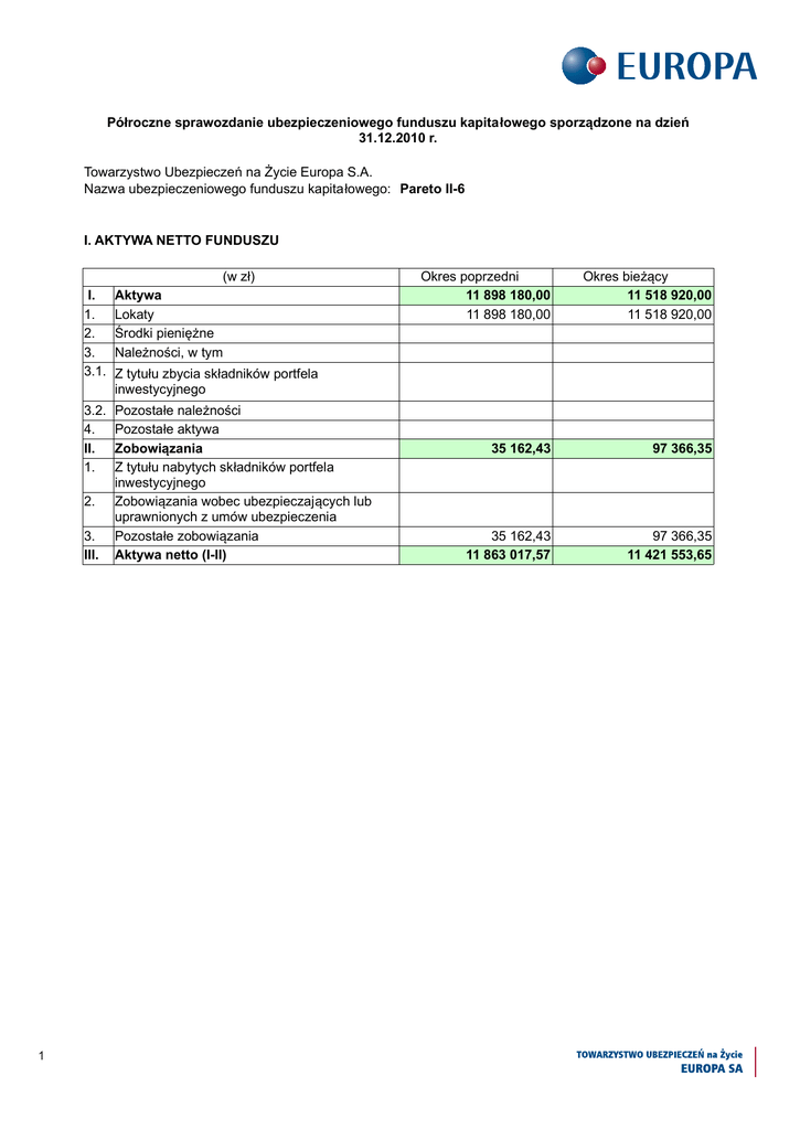 Półroczne sprawozdanie ubezpieczeniowego funduszu kapitałowego sporządzone na dzień 31.12.2010 r. Towarzystwo Ubezpieczeń na Życie Europa S.A. Nazwa ubezpieczeniowego funduszu kapitałowego: Pareto II-6 I. AKTYWA NETTO FUNDUSZU I. 1. 2. 3. 3.1. 3.2. 4. II. 1. 2. 3. III. 1 (w zł) Aktywa Lokaty Środki pieniężne Należności, w tym Okres poprzedni 11 898 180,00 11 898 180,00 Okres bieżący 11 518 920,00 11 518 920,00 35 162,43 97 366,35 35 162,43 11 863 017,57 97 366,35 11 421 553,65 Z tytułu zbycia składników portfela inwestycyjnego Pozostałe należności Pozostałe aktywa Zobowiązania Z tytułu nabytych składników portfela inwestycyjnego Zobowiązania wobec ubezpieczających lub uprawnionych z umów ubezpieczenia Pozostałe zobowiązania Aktywa netto (I-II) Sprawozdanie ubezpieczeniowego funduszu kapitałowego sporządzone na dzień 31.12.2010 r. Towarzystwo Ubezpieczeń na Życie Europa S.A. Nazwa ubezpieczeniowego funduszu kapita łowego: Pareto II-6 II. ZMIANY AKTYWÓW NETTO FUNDUSZU A. B. I. 1. 2. 3. II. 1. 2. 3. 4. 5. 6. 7. (w zł) Aktywa netto funduszu na początek okresu Stan netto z działalności operacyjnej (I-II) Zwiększenia funduszu Tytułem składek zwiększających wartość funduszu Tytułem udzielonych gwarancji Pozostałe zwiększenia Zmniejszenia funduszu Tytułem wykupu Tytułem wypłat pozostałych świadczeń ubezpieczeniowych Tytułem opłaty za ryzyko ubezpieczeniowe oraz innych opłat potrącanych z fuduszu Tytułem zwrotu składek ubezpieczeniowych Tytułem prowizji od składek Tytułem pozostałych prowizji 3. 4. 5. 6. 7. 8. 9. 18 779 335,17 18 792 850,01 Okres bieżący 11 863 017,57 2 267 217,82 2 333 950,44 18 792 850,01 2 333 950,44 13 514,84 13 514,84 66 732,62 66 732,62 -6 916 317,60 -2 708 681,74 -6 916 317,60 -2 708 681,74 0,00 0,00 0,00 0,00 11 863 017,57 11 421 553,65 Tytułem opłat za zarządzanie funduszem oraz innych opłat tytułem administrowania funduszem 8. Tytułem udzielonych gwarancji 9. Pozostałe zmniejszenia C. Przychody netto z działalności inwestycyjnej (po potrąceniu kosztów) 1. z papierów wartościowych emitowanych, poręczonych lub gwarantowanych przez skarb państwa lub organizacje międzynarodowe, których członkiem jest Rzeczpospolita Polska 2. Okres poprzedni z obligacji emitowanych lub por ęczonych przez jednostki samorządu terytorialnego lub związki jednostek samorządu terytorialnego z listów zastawnych z innych dłużnych papierów wartościowych o stałej stopie dochodu z innych dłużnych papierów wartościowych o zmiennej stopie dochodu z akcji z udziałów z jednostek uczestnictwa lub certyfikatów inwestycyjnych w funduszach inwestycyjnych z instrumentów pochodnych, o ile służą zmniejszeniu ryzyka związanego z innymi aktywami stanowiącymi pokrycie rezerw techniczno-ubezpieczeniowych 10. z innych papierów wartościowych o zmiennej stopie dochodu 11. z pożyczek 12. z nieruchomości 13. z depozytów bankowych 14. z lokat dokonanych za zezwoleniem organu nadzoru, zgodnie z art. 154 ust. 9 ustawy o działalności ubezpieczeniowej D. Pozostałe zwiększenia E. Pozostałe zmniejszenia F. Aktywa netto funduszu na koniec okresu sprawozdawczego 2 Sprawozdanie ubezpieczeniowego funduszu kapitałowego sporządzone na dzień 31.12.2010 r. Towarzystwo Ubezpieczeń na Życie Europa S.A. Nazwa ubezpieczeniowego funduszu kapita łowego: Pareto II-6 III KOSZTY FUNDUSZU 1. 2. 3. 4. 5. 6. 7. 3 (w zł) Koszty prowadzenia i obsługi rachunków bankowych Koszty nabycia jednostek rozrachunkowych Koszty przechowywania aktywów funduszu Koszty transakcyjne Koszty zarządzania i administrowania funduszem Pozostałe koszty RAZEM koszty funduszu (suma poz. 1-6): Okres poprzedni Okres bieżący 0,00 0,00 Sprawozdanie ubezpieczeniowego funduszu kapitałowego sporządzone na dzień 31.12.2010 r. Towarzystwo Ubezpieczeń na Życie Europa S.A. Nazwa ubezpieczeniowego funduszu kapitałowego: Pareto II-6 IV LICZBA I WARTOŚĆ JEDNOSTEK ROZRACHUNKOWYCH (w zł) 1. Liczba jednostek rozrachunkowych 1.1 Liczba jednostek rozrachunkowych na początek okresu sprawozdawczego 1.2 Liczba jednostek rozrachunkowych na koniec okresu sprawozdawczego 2. Wartość jednostki rozrachunkowej (w zł) : 2.1 wartość jednostki rozrachunkowej na początek okresu sprawozdawczego Okres poprzedni Okres bieżący 0,0000 96080,1617 96080,1617 116190,7798 0,00 123,47 122,04 96,34 200,00 144,12 123,47 98,30 2.2 minimalna wartość jednostki rozrachunkowej w okresie sprawozdawczym 2.3 maksymalna wartość jednostki rozrachunkowej w okresie sprawozdawczym 2.4 wartość jednostki rozliczeniowej na koniec okresu sprawozdawczego 4 Sprawozdanie ubezpieczeniowego funduszu kapita łowego sporządzone na dzień 31.12.2010 r. Towarzystwo Ubezpieczeń na Życie Europa S.A. Nazwa ubezpieczeniowego funduszu kapita łowego: Pareto II-6 V ZESTAWIENIE LOKAT FUNDUSZU - WARTOŚĆ (w zł) Papiery wartościowe emitowane, poręczone lub gwarantowane przez Skarb Państwa lub organizacje międzynarodowe, których członkiem jest Rzeczpospolita Polska : 1.1 Obligacje 1.2 Bony skarbowe 1.3 Inne Obligacje emitowane lub poręczone przez 2. jednostki samorządu terytorialnego lub związki jednostek samorządu terytorialnego 3. Listy zastawne 3.1 Dopuszczone do publicznego obrotu 3.1.1 Notowane na rynku regulowanym 3.1.2 Pozostałe 3.2 Niedopuszczone do publicznego obrotu Wartość bilansowa (w zł) Udział w aktywach funduszu (w %) 1. 0,00 0,00 0,00 0% 0% 0% 0% 0% 0% 0% 0% 0% 0% 4. Inne dłużne papiery wartościowe o stałej stopie dochodu 4.1 Notowane na rynku regulowanym 4.2 Pozostałe 5. Inne dłużne papiery wartościowe o zmiennej stopie dochodu 5.1 Dopuszczone do publicznego obrotu 5.1.1 Notowane na rynku regulowanym 5.1.2 Pozostałe 5.2 Niedopuszczone do publicznego obrotu 6. 6.1 6.1.1 6.1.2 6.2 Akcje Dopuszczone do publicznego obrotu Notowane na rynku regulowanym Pozostałe Niedopuszczone do publicznego obrotu 7. 8. Udziały Jednostki uczestnictwa lub certyfikaty inw