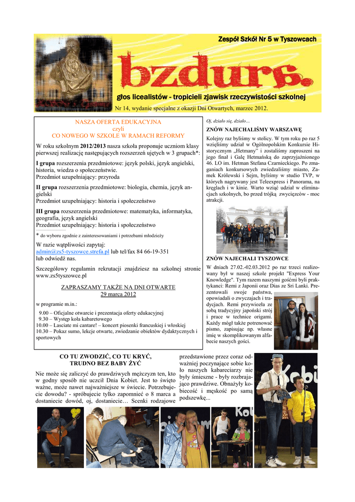 Zespół Szkół Nr 5 w Tyszowcach głos licealistów - tropicieli zjawisk rzeczywistości szkolnej Nr 14, wydanie specjalne z okazji Dni Otwartych, marzec 2012. NASZA OFERTA EDUKACYJNA czyli CO NOWEGO W SZKOLE W RAMACH REFORMY W roku szkolnym 2012/2013 nasza szkoła proponuje uczniom klasy pierwszej realizację następujących rozszerzeń ujętych w 3 grupach*: I grupa rozszerzenia przedmiotowe: język polski, język angielski, historia, wiedza o społeczeństwie. Przedmiot uzupełniający: przyroda II grupa rozszerzenia przedmiotowe: biologia, chemia, język angielski Przedmiot uzupełniający: historia i społeczeństwo Oj, działo się, działo… ZNÓW NAJECHALIŚMY WARSZAWĘ Kolejny raz byliśmy w stolicy. W tym roku po raz 5 wzięliśmy udział w Ogólnopolskim Konkursie Historycznym „Hetmany” i zostaliśmy zaproszeni na jego finał i Galę Hetmańską do zaprzyjaźnionego 46. LO im. Hetman Stefana Czarnieckiego. Po zmaganiach konkursowych zwiedzaliśmy miasto, Zamek Królewski i Sejm, byliśmy w studio TVP, w których nagrywany jest Teleexpress i Panorama, na kręglach i w kinie. Warto wziąć udział w eliminacjach szkolnych, bo przed trójką zwycięzców - moc atrakcji. III grupa rozszerzenia przedmiotowe: matematyka, informatyka, geografia, język angielski Przedmiot uzupełniający: historia i społeczeństwo —————————— * do wyboru zgodnie z zainteresowaniami i potrzebami młodzieŜy W razie wątpliwości zapytaj: [email protected] lub tel/fax 84 66-19-351 lub odwiedź nas. ZNÓW NAJECHALI TYSZOWCE Szczegółowy regulamin rekrutacji znajdziesz na szkolnej stronie W dniach 27.02.-02.03.2012 po raz trzeci realizowany był w naszej szkole projekt "Express Your www.zs5tyszowce.pl ZAPRASZAMY TAKśE NA DNI OTWARTE 29 marca 2012 w programie m.in.: 9.00 – Oficjalne otwarcie i prezentacja oferty edukacyjnej 9.30 – Występ koła kabaretowego 10.00 – Lasciate mi cantare! – koncert piosenki francuskiej i włoskiej 10.30 – Pokaz sumo, lekcje otwarte, zwiedzanie obiektów dydaktycznych i sportowych CO TU ZWODZIĆ, CO TU KRYĆ, TRUDNO BEZ BABY śYĆ Nie moŜe się zaliczyć do prawdziwych męŜczyzn ten, kto w godny sposób nie uczcił Dnia Kobiet. Jest to święto waŜne, moŜe nawet najwaŜniejsze w świecie. Potrzebujecie dowodu? - spróbujecie tylko zapomnieć o 8 marca a dostaniecie dowód, oj, dostaniecie… Scenki rodzajowe Knowledge". Tym razem naszymi gośćmi byli praktykanci: Remi z Japonii oraz Dias ze Sri Lanki. Prezentowali swoje państwa, opowiadali o zwyczajach i tradycjach. Remi przywiozła ze sobą tradycyjny japoński strój i prace w technice origami. KaŜdy mógł takŜe potrenować pismo, zapisując np. własne imię w skomplikowanym alfabecie naszych gości. przedstawione przez coraz odwaŜniej poczynające sobie koło naszych kabareciarzy nie były śmieszne - były rozbrajająco prawdziwe. ObnaŜyły kobiecość i męskość po samą podszewkę... DIALOGI SZKOLNE - Daj mi jabłka. - Ile? - 3! - Proszę. - Ale tu jest sześć! - Tyle chciałeś. - ??? - Mówiłeś - ''3!'' - a trzy silnia to sześć. *** CHCESZ ORYGINALNIE ZAPISAĆ SIĘ DO SZKOŁY? WYKORZYSTAJ NASZE PROPOZYCJE Jeśli w nowej szkole chciałbyś zyskać status oryginała i twardziela, juŜ pierwszego dnia daj się zapamiętać: 1. Wejdź odwaŜnie do sekretariatu z komórką przy uchu i powiedz, Ŝe na drugiej linii masz konkurencyjną szkołę i wybierzesz tę, która zaoferuje niŜszą cenę. 2. UŜywaj bardzo mądrych słów. (Np. Wyniki testu gimnazjalnego to są imponderabilia). 3. Zapytaj, kiedy wreszcie szkoła wprowadzi mundurki. 4. Powiedz składając papiery, Ŝe jesteś w depresji i po prostu chcesz z kimś pogadać. 5. Zacznij od słowa: Chciałbym..., później uderz się w policzek i powiedz: Nie chciałbyś! Wchodzi Śliski do biblioteki szkolnej a bibliotekarka: "Co, deszcz pada..?" 6. Zapytaj, czy wypoŜyczają świadectwa maturalne. 7. Zapytaj, czy moŜesz zatrzymać ulotkę reklamową z Targów Edukacyjnych w Tomaszowie. Kiedy usłyszysz, Ŝe tak - odetchnij z ulgą. 8. Powiedz, Ŝe za 2 tygodnie masz urodziny i Ŝe fajnie by było, gdyby Twój nowy wychowawca ukrył się w klasie, a kiedy wyjdziesz na lekcje, wyskoczył i krzyknął: Niespodzianka! KILKA SŁÓW O… ...NAUCZYCIELACH Jakie są trzy najstraszniejsze słowa, które moŜesz usłyszeć od nauczyciela? - Dzień dobry, sąsiedzie! ...FREKWENCJI Obecnie tylko jeden wychowawca w naszej szkole moŜe pochwalić się najwyŜszą frekwencją swoich podopiecznych. Pozostali potrafią poprawnie ją obliczyć. 9. Zamów zajęcia tylko we wtorki i czwartki. 10. Zapytaj, czy zaliczą Ci zajęcia z wuefu z gimnazjum. 11. Zacznij od słów: O tym jak rozpoczynałem naukę w szkole ponadgimnazjalnej. Ujęcie 1. Akcja! 12. Zapytaj o serwis, gwarancję i moŜliwość wymiany nauczyciela, gdyby nie spełnił Twoich oczekiwań. 13. Zacznij od pokazania świadectwa z gimnazjum, a potem powiedz ze smutkiem: To moŜe być moje ostatnie tak dobre świadectwo... 14. Wyjaśnij, Ŝe liczysz na to, Ŝe w nowej szkole będziesz tak samo szanowany i podziwiany jak w starej. 15. Jako pierwszy przedmiot rozszerzony podaj biologię, a na końcu rozmowy wyraźnie powiedz: Tylko proszę nie zapisywać mnie na profil biologiczny - mam uczulenie na wszystkie zwierzęta! I wyjdź. 16. Targuj się. 17. Spróbuj zamówić ubezpieczenie na Ŝycie. 18. Kiedy usłyszysz godzinę rozpoczęcia roku szkolnego 1 września, powiedz: Ojej! To brzmi strasznie skomplikowanie, a ja tak nie lubię matematyki... 19. Zakończ rozmowę rekrutacyjną mówiąc jak w filmie: Proszę pamiętać, nigdy nie było tej rozmowy... NA śYWO TEś JEST ŚMIESZNIE PORADY ABSOLWENTÓW Jak wszystkim wiadomo, przewodniczący naszej szkoły wziął ostatnio udział w nadzwyczajnej wycieczce do Warszawy. Jedną z wielu atrakcji, które go tam czekały, była wizyta na ostatnim piętrze Pałacu Kultury. Wchodzi facet do windy, patrzy, a tam stoi Wojtek. Facet 