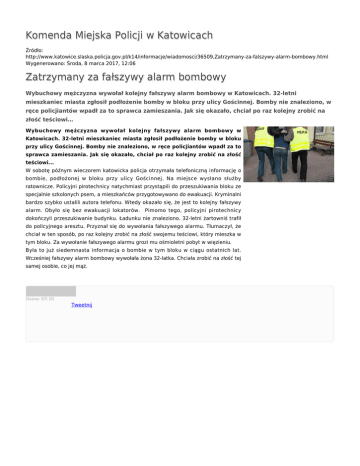 Komenda Miejska Policji w Katowicach Źródło: http://www.katowice.slaska.policja.gov.pl/k14/informacje/wiadomosci/36509,Zatrzymany-za-falszywy-alarm-bombowy.html Wygenerowano: Środa, 8 marca 2017, 12:06 Zatrzymany za fałszywy alarm bombowy Wybuchowy mężczyzna wywołał kolejny fałszywy alarm bombowy w Katowicach. 32-letni mieszkaniec miasta zgłosił podłożenie bomby w bloku przy ulicy Gościnnej. Bomby nie znaleziono, w ręce policjiantów wpadł za to sprawca zamieszania. Jak się okazało, chciał po raz kolejny zrobić na złość teściowi… Wybuchowy mężczyzna wywołał kolejny fałszywy alarm bombowy w Katowicach. 32-letni mieszkaniec miasta zgłosił podłożenie bomby w bloku przy ulicy Gościnnej. Bomby nie znaleziono, w ręce policjiantów wpadł za to sprawca zamieszania. Jak się okazało, chciał po raz kolejny zrobić na złość teściowi... W sobotę późnym wieczorem katowicka policja otrzymała telefoniczną informację o bombie, podłożonej w bloku przy ulicy Gościnnej. Na miejsce wysłano służby ratownicze. Policyjni pirotechnicy natychmiast przystąpili do przeszukiwania bloku ze specjalnie szkolonych psem, a mieszkańców przygotowywano do ewakuacji. Kryminalni bardzo szybko ustalili autora telefonu. Wtedy okazało się, że jest to kolejny fałszywy alarm. Obyło się bez ewakuacji lokatorów. Pimomo tego, policyjni pirotechnicy dokończyli przeszukiwanie budynku. Ładunku nie znaleziono. 32-letni żartowniś trafił do policyjnego aresztu. Przyznał się do wywołania fałszywego alarmu. Tłumaczył, że chciał w ten sposób, po raz kolejny zrobić na złość swojemu teściowi, który mieszka w tym bloku. Za wywołanie fałszywego alarmu grozi mu ośmioletni pobyt w więzieniu. Była to już siedemnasta informacja o bombie w tym bloku w ciągu ostatnich lat. Wcześniej fałszywy alarm bombowy wywołała żona 32-latka. Chciała zrobić na złość tej samej osobie, co jej mąż. Ocena: 0/5 (0) Tweetnij