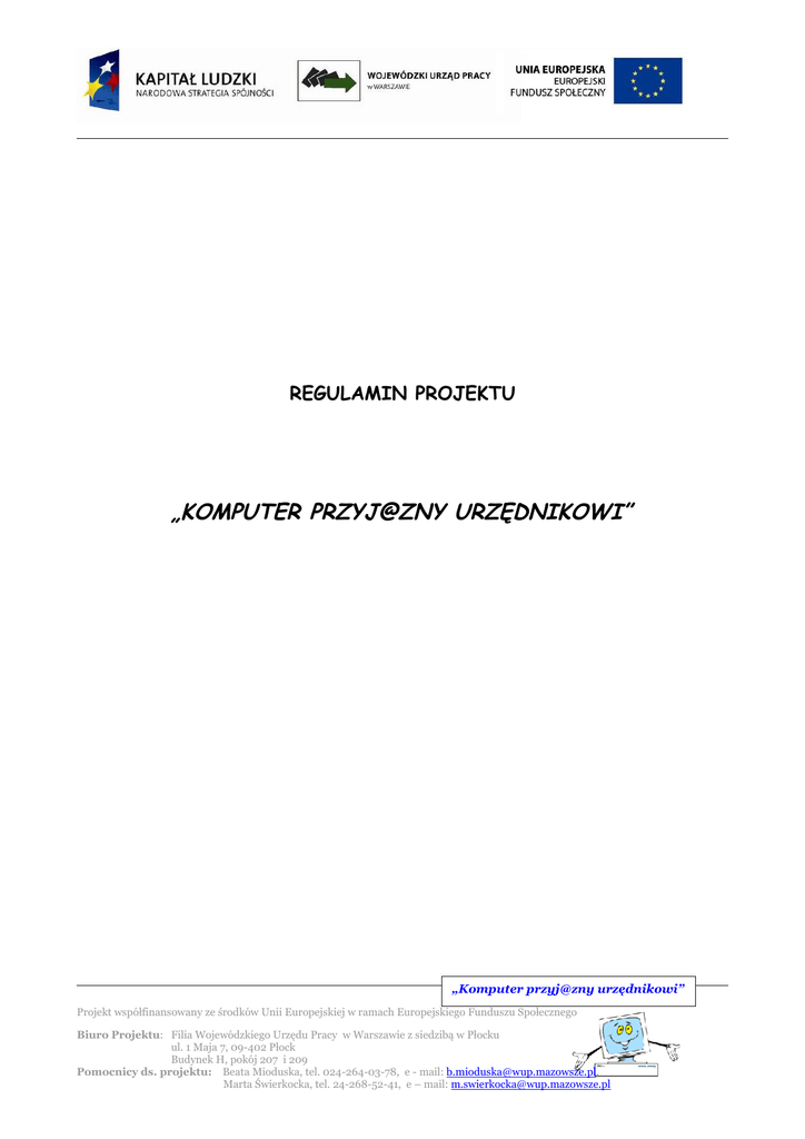 REGULAMIN PROJEKTU „KOMPUTER PRZYJ@ZNY URZĘDNIKOWI” „Komputer przyj@zny urzędnikowi” Projekt współfinansowany ze środków Unii Europejskiej w ramach Europejskiego Funduszu Społecznego Biuro Projektu: Filia Wojewódzkiego Urzędu Pracy w Warszawie z siedzibą w Płocku ul. 1 Maja 7, 09-402 Płock Budynek H, pokój 207 i 209 Pomocnicy ds. projektu: Beata Mioduska, tel. 024-264-03-78, e - mail: [email protected], Marta Świerkocka, tel. 24-268-52-41, e – mail: [email protected] §1 POSTANOWIENIA OGÓLNE 1. Niniejszy Regulamin określa warunki naboru, proces rekrutacji i udzielania wsparcia w ramach projektu: „Komputer przyj@zny urzędnikowi” . 2. Projekt „Komputer przyj@zny urzędnikowi” jest projektem systemowym Województwa Mazowieckiego/Wojewódzkiego Urzędu Pracy w Warszawie, realizowanym ze środków Europejskiego Funduszu Społecznego w ramach Programu Operacyjnego Kapitał Ludzki, Priorytet VI – „Rynek pracy otwarty dla wszystkich”, Działanie 6.1 – „Poprawa dostępu do zatrudnienia oraz wspieranie aktywności zawodowej w regionach”, Poddziałanie 6.1.2 – „Wsparcie powiatowych i wojewódzkich urzędów pracy w realizacji zadań na rzecz aktywizacji zawodowej osób bezrobotnych w regionie”. 3. Projekt realizowany jest od 01 kwietnia 2009 r. do 31 grudnia 2009 r. 4. Działania przewidziane projektem obejmą Beneficjentów Ostatecznych, wybranych zgodnie z zasadami opisanymi w § 5 . §2 SŁOWNIK POJĘĆ Użyte w niniejszym Regulaminie pojęcia oznaczają: Beneficjent - Wojewódzki Urząd Pracy w Warszawie Beneficjent Ostateczny/Uczestnik – osoba zakwalifikowana, zgodnie z zasadami określonymi w niniejszym Regulaminie, bezpośrednio korzystająca z wdrażanej pomocy; Biuro Projektu – siedziba płockiej Filii WUP – ul. 1 Maja 7, 09- 402 Płock; EFS – Europejski Fundusz Społeczny; MUP – miejski urząd pracy/miejskie urzędy pracy z obszaru województwa mazowieckiego PO KL – Program Operacyjny Kapitał Ludzki; Projekt – projekt pt. :„Komputer przyj@zny urzędnikowi”; PUP – powiatowy urząd pracy/powiatowe urzędy pracy z obszaru województwa mazowieckiego Strona internetowa Beneficjenta – www.wup.mazowsze.pl SzOP PO KL – Szczegółowy Opis Priorytetów Programu Operacyjnego Kapitał Ludzki; UE – Unia Europejska; WUP – Wojewódzki Urząd Pracy w Warszawie (w tym jego pięć Filii z siedzibą w Ciechanowie, Ostrołęce, Płocku, Radomiu i Siedlcach). 2 Zespół Zadaniowy – pracownicy Filii WUP w Płocku wykonujący zadania związane z obsługą projektu w ramach obowiązków służbowych. W skład Zespołu Zadaniowego wchodzą: Lider projektu, Koordynator oraz Pomocnicy ds. projektu. §3 ZASADY I ZAKRES WSPARCIA 1. Projekt przewiduje realizację szkoleń komputerowych oraz szkolenia z zakresu interpretacji znowelizowanej Ustawy o promocji zatrudnienia i instytucjach rynku pracy. 2. Przewidziane typy kierunków szkoleń: A/. Kurs ECDL Core Kurs komputerowy przygotowujący do uzyskania Europejskiego Certyfikatu Umiejętności Komputerowych (European Komputer Driving Licence) na poziomie podstawowym– międzynarodowego certyfikatu zatwierdzającego opanowanie podstawowych umiejętności obsługi komputerów osobistych i ich wykorzystania w codziennej pracy. W ramach szkolenia ECDL Core uczestnik weźmie udział w pięciu trzydniowych zjazdach szkoleniowych (w sumie 120 godz. szkolenia), obejmujących 7 podstawowych zakresów tematycznych tj.: - Podstawy technik informatycznych, - Użytkowanie komputerów, - Przetwarzanie tekstów (MS Word), - Arkusze kalkulacyjne (MS Excel), - Bazy danych (MS Access), - Grafika menedżerska i prezentacyjna (MS Power Point), - Usługi w sieciach informatycznych. Po każdym zjeździe szkoleniowym, zgodnie z wymogami programu ECDL, uczestnik przystąpi do egzaminu/-ów badającego/-ych poziom uzyskanej wiedzy (w sumie do 1 egzaminu teoretycznego i 6 egzaminów praktycznych), w tym celu uzyska Europejską Kartę Umiejętności Komputerowych (EKUK) – kartę egzaminacyjną konieczną dla przystąpienia do egzaminów i uzyskania certyfikatu ECDL. Zgodnie z obowiązującymi zasadami ECDL, dla uzyskania certyfikatu niezbędne jest zaliczenie przez uczestnika egzaminów ze wszystkich modułów wchodzących w skład programu. Koszt EKUK, przystąpienia do poszczególnych egzaminów oraz wydania certyfikatu ECDL Core pokrywa Beneficjent. B/. Szkolenie komputerowe z aplikacji biurowej - MS WORD (zaawansowany) – kurs przeznaczony jest dla osób, które posiadają już doświadczenie w pracy z tekstem mierzone stopniem opanowania elementarnych mechanizmów i operacji na tekście i grafice oferowanych przez edytor Word, stopniem znajomości menu, okien dialogowych itp. Uczestnik winien 3 swobodnie poruszać się w środowisku MS Word. Szkolenie zakłada w szczególności zaawansowane funkcje edytora tekstu od strony technicznej. W przypadku dużego zainteresowania możliwość realizacji szkolenia w ramach programu MS Word 2007. C/. Szkolenie komputerowe (średniozaawansowany) zaawansowanych technik - kurs z aplikacji obejmie użytkowania biurowej przedstawienie arkusza - MS uczestnikom kalkulacyjnego MS EXCEL nowych – Excel. Uczestnik szkolenia winien posiadać podstawowe informacje dotyczące swobodnego poruszania się po arkuszu kalkulacyjnym. W przypadku dużego zainteresowania możliwość realizacji szkolenia dla grupy na poziomie podstawowym. W przypadku dużego zainteresowania możliwość realizacji szkolenia w ramach programu MS Word 2007. D./ Szkolenie komputerowe z aplikacji biurowej - MS EXCEL (zaawansowany) – szkolenie przeznaczone wyłącznie dla uczestników posiadających wiedzę o programie MS Excel minimum na poziomie średniozaawansowanym, skierowane w szczególności do pracowników zajmujących się na co dzień księgowością, finansami, czy rozliczaniem projektów. Ostateczny zakres szkolenia dopasowany zostanie do poziomu wiedzy uczestników. W przypadku dużego zainte