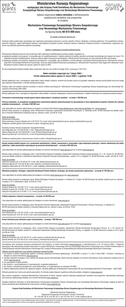 Ministerstwo Rozwoju Regionalnego występujące jako Krajowy Punkt Kontaktowy dla Mechanizmu Finansowego Europejskiego Obszaru Gospodarczego oraz Norweskiego Mechanizmu Finansowego ogłasza rozpoczęcie naboru wniosków o dofinansowanie pojedynczych projektów oraz programów ze środków Mechanizmu Finansowego Europejskiego Obszaru Gospodarczego oraz Norweskiego Mechanizmu Finansowego na łączną kwotę 60 615 000 euro. Do udziału w konkursie zaprasza się: instytucje sektora publicznego i prywatnego oraz organizacje pozarządowe utworzone w prawny sposób w Polsce i działające w interesie publicznym. W szczególności wnioskodawcami mogą być: organy administracji rządowej i samorządowej wszystkich szczebli, instytucje naukowe i badawcze, instytucje branżowe i środowiskowe, organizacje społeczne oraz podmioty partnerstwa publiczno-prywatnego. Zgodnie z następującymi zasadami dofinansowania: Wnioskowane dofinansowanie nie może przekraczać 60% całkowitych kwalifikowalnych kosztów projektu. Wyjątkami są1 a) pojedyncze projekty oraz programy, w przypadku gdy ich współfinansowanie z budżetu państwa lub budżetu jednostek samorządu terytorialnego jest większe lub równe 15% całkowitych kosztów kwalifikowalnych, wówczas wkład środków finansowych pochodzących z Mechanizmów Finansowych nie może przekraczać 85% tych kosztów, b) pojedyncze projekty oraz programy organizacji pozarządowych, w przypadku, gdy są składane w ramach jednego z priorytetów finansowanego łącznie z Mechanizmu Finansowego EOG i Norweskiego Mechanizmu Finansowego, wówczas wkład środków finansowych pochodzących z Mechanizmów Finansowych może sięgać 85% całkowitych kwalifikowalnych kosztów projektu lub powyżej, jednak nie więcej niż 90%. W celu przygotowania budżetu projektu należy zastosować stały kurs euro (EUR) do złotego (PLN), wynoszący 3,7247 PLN. Nabór wniosków rozpocznie się 1 lutego 2008 r. Termin zakończenia naboru upływa 31 marca 2008 r. o godzinie 15.00. Wnioski aplikacyjne wraz z wymaganymi załącznikami należy składać osobiście, kurierem lub przesłać pocztą (w przypadku nadesłania wniosku pocztą będzie brana pod uwagę data wpłynięcia dokumentów, a nie data stempla pocztowego). Niniejszy nabór jest ostatnim naborem wniosków w ramach środków pochodzących z Mechanizmu Finansowego Europejskiego Obszaru Gospodarczego oraz Norweskiego Mechanizmu Finansowego 2004-2009. Wnioski aplikacyjne wraz z wymaganymi załącznikami należy składać w zakresie następujących obszarów priorytetowych i środków finansowych do wskazanych poniżej instytucji Promowanie zrównoważonego rozwoju poprzez lepsze wykorzystanie i zarządzanie zasobami – na kwotę 7 400 000 euro Ochrona środowiska, ze szczególnym uwzględnieniem wzmocnienia zdolności administracyjnych do wprowadzania w życie odpowiednich przepisów istotnych dla realizacji projektów inwestycyjnych – na kwotę 4 660 000 euro Listy załączników do wniosku aplikacyjnego są dostępne na stronach internetowych www.nfosigw.gov.pl, www.mos.gov.pl/mfeog oraz www.eog.gov.pl Wnioski należy przesyłać na następujący adres: Ministerstwo Środowiska, Departament Instrumentów Finansowych, ul. Wawelska 52/54, 00-920 Warszawa lub składać osobiście w Kancelarii Ministerstwa Środowiska pod ww. adresem w godz. od 9.00 do 15.00. Osoby do kontaktu: Ministerstwo Środowiska: Marta Jankowska, Grażyna Sztandera (tel. 0 22 579 27 79, e-mail: [email protected], [email protected]), Dodatkowo wszelkie pytania można kierować na adres: [email protected]. Narodowy Fundusz Ochrony Środowiska i Gospodarki Wodnej: Irena Wągrodzka (tel. 0 22 459 02 86), e-mail: [email protected] Mariusz Wajszczak (tel. 0 22 459 04 00), e-mail: [email protected] Marek Szymański (tel. 0 22 459 06 37), e-mail: [email protected] Dodatkowo wszelkie pytania można kierować również na adres: [email protected] Rozwój zasobów ludzkich poprzez m.in. promowanie wykształcenia i szkoleń, wzmacnianie w samorządzie i jego instytucjach potencjału z zakresu administracji lub służby publicznej, a także wzmacnianie wspierających go procesów demokratycznych – na kwotę 8 885 000 euro Lista załączników do wniosku aplikacyjnego jest dostępna na stronach internetowych www.ukie.gov.pl oraz na stronie www.eog.gov.pl Wnioski należy przesyłać na następujący adres: Urząd Komitetu Integracji Europejskiej, Departament Programów Rozwoju Instytucjonalnego, Al. J. Ch. Szucha 23, 00-580 Warszawa lub składać osobiście w sekretariacie Departamentu Programów Rozwoju Instytucjonalnego – pokój nr 513, ul. Bagatela 14, 00-585 Warszawa, w godz. od 9.00 do 15.00. Osoby do kontaktu: Rafał Piotr Dziadosz (tel. 0 22 455 54 78, e-mail: [email protected]) Katarzyna Mączka (tel. 0 22 455 52 88, e-mail: [email protected]) Magdalena Zdanowska (tel. 0 22 455 52 31, e-mail: [email protected]). Wdrażanie przepisów z Schengen, wspieranie Narodowych Planów Działania z Schengen, jak również wzmacnianie sądownictwa – na kwotę 22 700 000 euro Lista załączników do wniosku aplikacyjnego jest dostępna na stronach www.mswia.gov.pl oraz www.eog.gov.pl Wnioski należy przesyłać na następujący adres: Władza Wdrażająca Programy Europejskie, ul. Wspólna 2/4, IV piętro, 00-926 Warszawa lub składać osobiście pod ww. adresem w pokoju nr 4117 (Sekretariat) w godz. od 9.00 do 15.00. Osoby do kontaktu: Grzegorz Assbury (tel. 0 22 601 15 21, e-mail: [email protected]), Radosław Frączek (tel. 0 22 601 15 21, e-mail: [email protected]), Katarzyna Pruszyńska (tel. 0 22 601 17 72, e-mail: [email protected]). Polityka regionalna i działania transgraniczne – na kwotę 15 280 000 euro Lista załączników do wniosku aplikacyjnego jest dostępna na stronie internetowej www.eog.gov.pl Wnioski należy przesyłać na następujący adres: Ministerstwo Rozwoju Regionalnego, Departament Programów Pomocowych i Pomocy Technicznej, ul