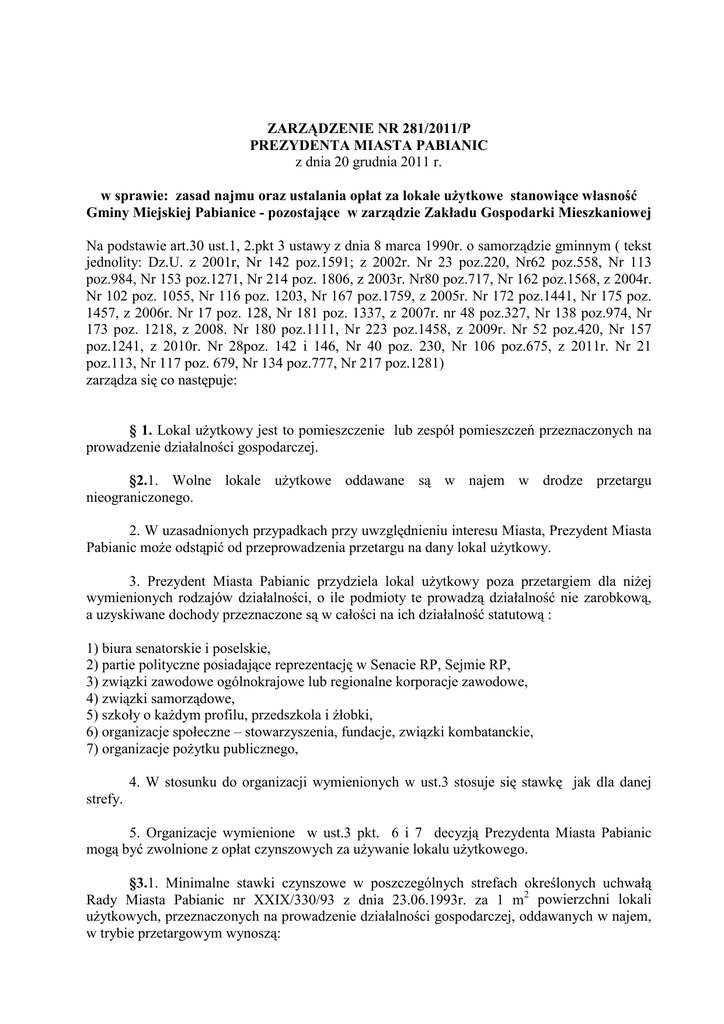 ZARZĄDZENIE NR 281/2011/P PREZYDENTA MIASTA PABIANIC z