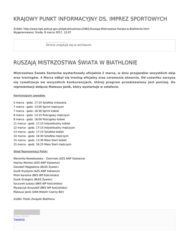 KRAJOWY PUNKT INFORMACYJNY DS. IMPREZ SPORTOWYCH Źródło: http://www.kpk.policja.gov.pl/kpk/aktualnosci/2963,Ruszaja-Mistrzostwa-Swiata-w-Biathlonie.html Wygenerowano: Środa, 8 marca 2017, 12:07 Strona znajduje się w archiwum. RUSZAJĄ MISTRZOSTWA ŚWIATA W BIATHLONIE Mistrzostwa Świata Seniorów wystartowały oficjalnie 2 marca, w dniu przyjazdów wszystkich ekip oraz treningów. 4 Marca odbył się trening oficjalny oraz ceremonia otwarcia. Od czwartku zaczyna się rywalizacja we wszystkich konkurencjach, której program przedstawiony jest poniżej. Do reprezentacji dołącza Mateusz Janik, który wystartuje w sztafecie. Harmonogram zawodów: 5 marca - godz. 17:15 Sztafeta mieszana 7 marca - godz. 13:00 Sprint mężczyzn 7 marca - godz. 16:30 Sprint kobiet 8 marca - godz. 13:15 Pościgowy mężczyzn 8 marca - godz. 16:00 Pościgowy kobiet 11 marca - godz. 17:15 Indywidualny kobiet 12 marca - godz. 17:15 Indywidualny mężczyzn 13 marca - godz. 17:15 Sztafeta kobiet 14 marca - godz. 16:30 Sztafeta mężczyzn 15 marca - godz. 13:30 Mass Start kobiet 15 marca - godz. 16:15 Mass Start mężczyzn Skład Reprezentacji Polski: Weronika Nowakowska – Ziemniak (AZS AWF Katowice) Hojnisz Monika (AZS AWF Katowice) Gwizdoń Magdalena (BLKS Żywiec) Guzik Krystyna (AZS AWF Katowice) Pitoń Karolina (BKS WP Kościelisko) Guzik Grzegorz (BLKS Żywiec) Szczurek Łukasz (BKS WP Kościelisko) Pływaczyk Krzysztof (BKS WP Kościelisko) Mateusz Janik (UKN Melafir Czarny Bór) źródło: Polski Związek Biathlonu Ocena: 0/5 (0) Tweetnij