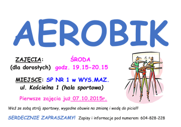 AEROBIK ZAJĘCIA: ŚRODA (dla dorosłych) godz. 19.15-20.15 MIEJSCE: SP NR 1 w WYS.MAZ. ul. Kościelna 1 (hala sportowa) Pierwsze zajęcia już 07.10.2015r. Weź ze sobą strój sportowy, wygodne obuwie na zmianę i wodę do picia!!! SERDECZNIE ZAPRASZAMY! Zapisy i informacje pod numerem: 604-828-228 YOGA+PILATES ŚRODA (dla dorosłych) godz. 18.00-19.00 ZAJĘCIA: MIEJSCE: SP NR 1 w WYS.MAZ. ul. Kościelna 1 (mała sala gimnastyczna) Pierwsze zajęcia już 07.10.2015r. SERDECZNIE ZAPRASZAMY! Zapisy i informacje pod numerem: 604-828-228
