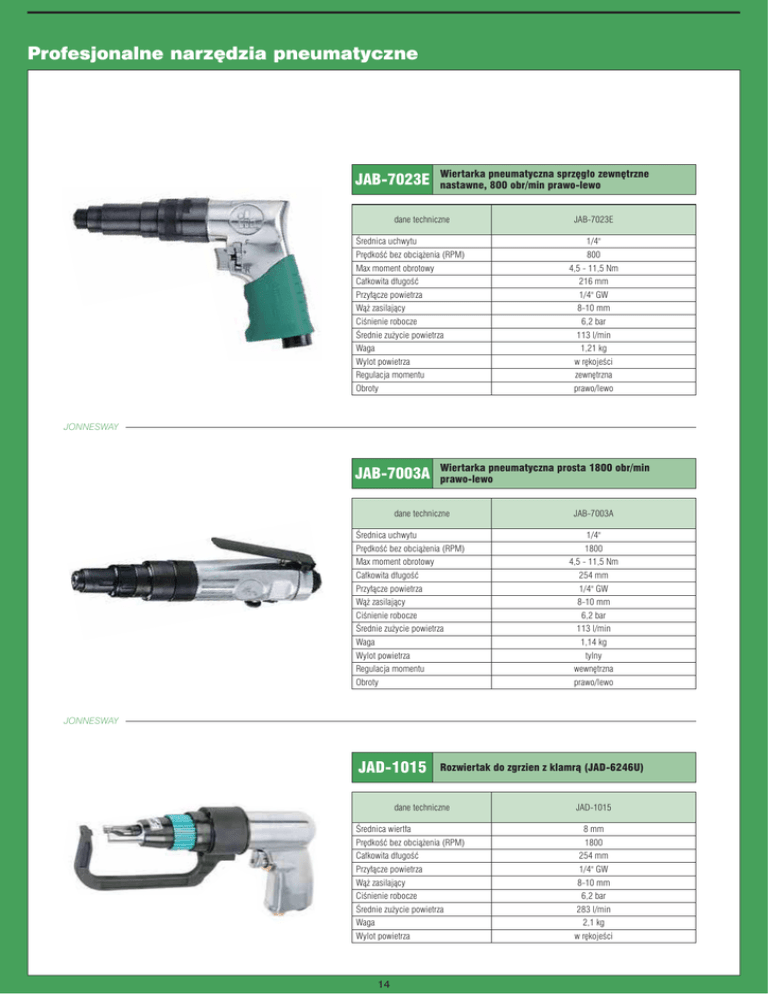 Profesjonalne narzędzia pneumatyczne JAB-7023E Wiertarka pneumatyczna sprzęgło zewnętrzne nastawne, 800 obr/min prawo-lewo dane techniczne Średnica uchwytu JAB-7023E 1/4" Prędkość bez obciążenia (RPM) Max moment obrotowy 800 4,5 - 11,5 Nm Całkowita długość 216 mm Przyłącze powietrza 1/4" GW Wąż zasilający 8-10 mm Ciśnienie robocze 6,2 bar Średnie zużycie powietrza Waga 113 l/min 1,21 kg Wylot powietrza w rękojeści Regulacja momentu zewnętrzna Obroty prawo/lewo JONNESWAY JAB-7003A Wiertarka pneumatyczna prosta 1800 obr/min prawo-lewo dane techniczne JAB-7003A Średnica uchwytu 1/4" Prędkość bez obciążenia (RPM) 1800 Max moment obrotowy 4,5 - 11,5 Nm Całkowita długość 254 mm Przyłącze powietrza 1/4" GW Wąż zasilający 8-10 mm Ciśnienie robocze 6,2 bar Średnie zużycie powietrza Waga 113 l/min 1,14 kg Wylot powietrza tylny Regulacja momentu wewnętrzna Obroty prawo/lewo JONNESWAY JAD-1015 Rozwiertak do zgrzien z klamrą (JAD-6246U) dane techniczne Średnica wiertła Prędkość bez obciążenia (RPM) Całkowita długość JAD-1015 8 mm 1800 254 mm Przyłącze powietrza 1/4" GW Wąż zasilający 8-10 mm Ciśnienie robocze Średnie zużycie powietrza Waga 6,2 bar 283 l/min 2,1 kg Wylot powietrza 14 w rękojeści