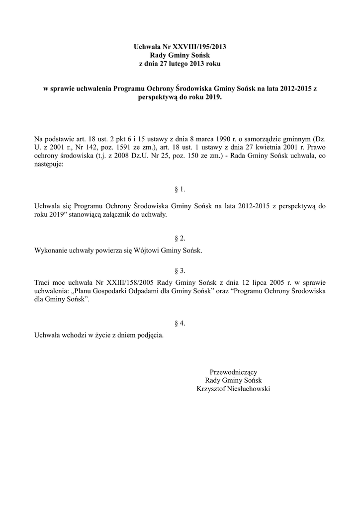 Uchwała Nr XXVIII/195/2013 Rady Gminy Sońsk z dnia 27 lutego 2013 roku w sprawie uchwalenia Programu Ochrony Środowiska Gminy Sońsk na lata 2012-2015 z perspektywą do roku 2019. Na podstawie art. 18 ust. 2 pkt 6 i 15 ustawy z dnia 8 marca 1990 r. o samorządzie gminnym (Dz. U. z 2001 r., Nr 142, poz. 1591 ze zm.), art. 18 ust. 1 ustawy z dnia 27 kwietnia 2001 r. Prawo ochrony środowiska (t.j. z 2008 Dz.U. Nr 25, poz. 150 ze zm.) - Rada Gminy Sońsk uchwala, co następuje: § 1. Uchwala się Programu Ochrony Środowiska Gminy Sońsk na lata 2012-2015 z perspektywą do roku 2019” stanowiącą załącznik do uchwały. § 2. Wykonanie uchwały powierza się Wójtowi Gminy Sońsk. § 3. Traci moc uchwała Nr XXIII/158/2005 Rady Gminy Sońsk z dnia 12 lipca 2005 r. w sprawie uchwalenia: „Planu Gospodarki Odpadami dla Gminy Sońsk” oraz “Programu Ochrony Środowiska dla Gminy Sońsk”. § 4. Uchwała wchodzi w życie z dniem podjęcia. Przewodniczący Rady Gminy Sońsk Krzysztof Niesłuchowski Uzasadnienie do uchwały Nr XXVIII/195/2013 Rady Gminy Sońsk z dnia 27 lutego 2013 roku w sprawie uchwalenia Programu Ochrony Środowiska Gminy Sońsk na lata 2012-2015 z perspektywą do roku 2019”. Projekt Programu „Ochrony Środowiska Gminy Sońsk na lata 2012-2015 z perspektywą do roku 2019” został sporządzony przez Wójta Gminy Sońsk, w celu realizacji polityki ekologicznej państwa, zgodnie z powszechnie obowiązującymi przepisami prawa. Niniejszy Program ochrony środowiska jest aktualizacją dokumentu, przyjętego uchwałą Nr XXIII/158/2005 Rady Gminy Sońsk z dnia 12 lipca 2005 r. w sprawie uchwalenia: „Planu Gospodarki Odpadami dla Gminy Sońsk”oraz “Programu Ochrony Środowiska dla Gminy Sońsk”. Zgodnie z art. 54 ust. 2 i ust. 3 ustawy z dnia 3 października 2008 r. o udostępnieniu informacji o środowisku i jego ochronie, udziale społeczeństwa w ochronie środowiska oraz ocenach oddziaływania na środowisko (Dz. U. Nr 199, poz. 1227 ze zm.), w związku z art. 17 ust. 4 ustawy z dnia 27 kwietnia 2001 r. Prawo ochrony środowiska (t.j. z 2008 Dz.U. Nr 25, poz. 150 ze zm.) zapewniono możliwość udziału społeczeństwa, na zasadach i w trybie określonych w ww. ustawach, w postępowaniu, którego przedmiotem było sporządzenie niniejszego Programu Ochrony Środowiska Gminy Sońsk na lata 2012-2015 z perspektywą do roku 2019. Wójt Gminy Sońsk Obwieszczeniem z dnia 5 grudnia 2012 r. zawiadomił społeczeństwo o możliwości zapoznania się z projektem dokumentu. Obwieszczenie zostało zamieszczone: 1) na stronie internetowej www.sonsk.biuletyn.net oraz www.sonsk.pl 2) na tablicy ogłoszeń tut. Urzędu 3) w Tygodniku Ciechanowskim nr 50 z dnia 11 grudnia 2012 r. Uwagi i wnioski do projektu Programu można było składać do 2 stycznia 2013 r., tj. w ciągu 21 dni. Projekt Programu uzyskał pozytywną opinie znak WOOŚ-I.410.640.2012.ARM z dnia 26 listopada 2012 r. Regionalnego Dyrektora Ochrony Środowiska w Warszawie w sprawie odstąpienia od przeprowadzenia strategicznej oceny oddziaływania na środowisko dla ww. projektu Programu. Ponadto projekt Programu został zaopiniowany pozytywnie uchwałą nr 9/2013 Zarządu Powiatu Ciechanowskiego z dnia 30 stycznia 2013 r. Uzyskane opinie i stanowiska organów uwzględniono przy konstruowaniu ostatecznej wersji Dokumentów. W świetle powyższego podjęcie przedmiotowej uchwały jest uzasadnione.