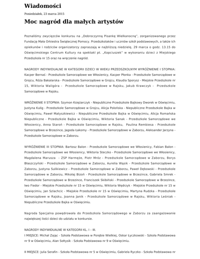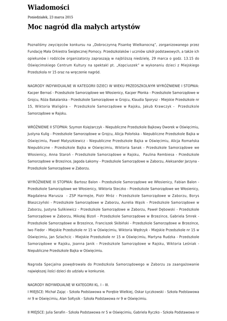 Wiadomości Poniedziałek, 23 marca 2015 Moc nagród dla małych artystów Poznaliśmy zwycięzców konkursu na „Dobroczynną Pisankę Wielkanocną”, zorganizowanego przez Fundację Mała Orkiestra Świątecznej Pomocy. Przedszkolaków i uczniów szkół podstawowych, a także ich opiekunów i rodziców organizatorzy zapraszają w najbliższą niedzielę, 29 marca o godz. 13.15 do Oświęcimskiego Centrum Kultury na spektakl pt. „Kopciuszek” w wykonaniu dzieci z Miejskiego Przedszkola nr 15 oraz na wręczenie nagród. NAGRODY INDYWIDUALNE W KATEGORII DZIECI W WIEKU PRZEDSZKOLNYM WYRÓŻNIENIE I STOPNIA: Kacper Bernaś - Przedszkole Samorządowe we Włosienicy, Kacper Płonka - Przedszkole Samorządowe w Grojcu, Róża Bakalarska - Przedszkole Samorządowe w Grojcu, Klaudia Sporysz - Miejskie Przedszkole nr 15, Wiktoria Waligóra - Przedszkole Samorządowe w Rajsku, Jakub Krawczyk - Przedszkole Samorządowe w Rajsku. WRÓŻNIENIE II STOPNIA: Szymon Księżarczyk - Niepubliczne Przedszkole Bajkowy Dworek w Oświęcimiu, Justyna Kulig - Przedszkole Samorządowe w Grojcu, Alicja Polońska - Niepubliczne Przedszkole Bajka w Oświęcimiu, Paweł Matyszkiewicz - Niepubliczne Przedszkole Bajka w Oświęcimiu, Alicja Romańska Niepubliczne - Przedszkole Bajka w Oświęcimiu, Wiktoria Sanak - Przedszkole Samorządowe we Włosienicy, Anna Staroń - Przedszkole Samorządowe w Rajsku, Paulina Rembiesa - Przedszkole Samorządowe w Brzezince, Jagoda Łakomy - Przedszkole Samorządowe w Zaborzu, Aleksander Jarzyna Przedszkole Samorządowe w Zaborzu. WYRÓŻNIENIE III STOPNIA: Bartosz Balon - Przedszkole Samorządowe we Włosienicy, Fabian Balon Przedszkole Samorządowe we Włosienicy, Wiktoria Steczko - Przedszkole Samorządowe we Włosienicy, Magdalena Marusza - ZSP Harmęże, Piotr Mróz - Przedszkole Samorządowe w Zaborzu, Borys Błaszczyński - Przedszkole Samorządowe w Zaborzu, Aurelia Wąsik - Przedszkole Samorządowe w Zaborzu, Justyna Sulikiewicz - Przedszkole Samorządowe w Zaborzu, Paweł Dębowski - Przedszkole Samorządowe w Zaborzu, Mikołaj Bizoń - Przedszkole Samorządowe w Brzezince, Gabriela Smrek Przedszkole Samorządowe w Brzezince, Franciszek Skibiński - Przedszkole Samorządowe w Brzezince, Iwo Fiedor - Miejskie Przedszkole nr 15 w Oświęcimiu, Wiktoria Wędrzyk - Miejskie Przedszkole nr 15 w Oświęcimiu, Jan Szlachcic - Miejskie Przedszkole nr 15 w Oświęcimiu, Martyna Rudzka - Przedszkole Samorządowe w Rajsku, Joanna Janik - Przedszkole Samorządowe w Rajsku, Wiktoria Leśniak Niepubliczne Przedszkole Bajka w Oświęcimiu. Nagroda Specjalna powędrowała do Przedszkola Samorządowego w Zaborzu za zaangażowanie największej ilości dzieci do udziału w konkursie. NAGRODY INDYWIDUALNE W KATEGORII KL. I – III. I MIEJSCE: Michał Zając - Szkoła Podstawowa w Porębie Wielkiej, Oskar Łyczkowski - Szkoła Podstawowa nr 9 w Oświęcimiu, Alan Sołtysik - Szkoła Podstawowa nr 9 w Oświęcimiu. II MIEJSCE: Julia Serafin - Szkoła Podstawowa nr 5 w Oświęcimiu, Gabriela Ryczko - Szkoła Podstawowa nr 9 w Oświęcimiu, Kordian Kulig - Szkoła Podstawowa w Porębie Wielkiej. III MIEJSCE: Amelia Papciak - Szkoła Podstawowa nr 5 w Oświęcimiu, Natalia Puchajda - Szkoła Podstawowa nr 5 w Oświęcimiu, Anna Ferenc - Szkoła Podstawowa nr 9 w Oświęcimiu, Magdalena Wąsik - Szkoła Podstawowa nr 9 w Oświęcimiu, Jan Drabczyk - Szkoła Podstawowa nr 9 w Oświęcimiu, Paulina Wawro - Szkoła Podstawowa nr 9 w Oświęcimiu.
