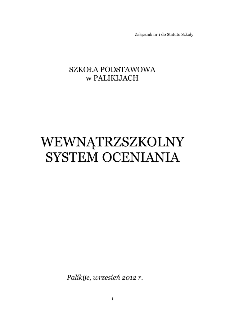 Załącznik nr 1 do Statutu Szkoły SZKOŁA PODSTAWOWA w PALIKIJACH WEWNĄTRZSZKOLNY SYSTEM OCENIANIA Palikije, wrzesień 2012 r. 1 SPIS TREŚCI ROZDZIAŁ I POSTANOWIENIA OGÓLNE ROZDZIAŁ II OCENIANIE UCZNIÓW ROZDZIAŁ III KLASYFIKACJA UCZNIÓW ROZDZIAŁ IV PROMOCJA UCZNIÓW ROZDZIAŁ V POSTĘPOWANIE W PRZYPADKU ZASTRZEŻEŃ ODNOSZĄCYCH SIĘ DO TRYBU USTALANIA ROCZNEJ KLASYFIKACYJNEJ OCENY Z OBOWIĄZKOWYCH ZAJĘĆ EDUKACYJNYCH I ROCZNEJ KLASYFIKACYJNEJ OCENY ZACHOWANIA ROZDZIAŁ VI SPRAWDZIAN UCZNIÓW KLAS SZÓSTYCH KOŃCZĄCYCH SZKOŁĘ PODSTAWOWĄ ROZDZIAŁ VII POSTANOWIENIA KOŃCOWE 2 WEWNĄTRZSZKOLNY SYSTEM OCENIANIA SZKOŁY PODSTAWOWEJ w Palikijach Wewnątrzszkolny System Oceniania został opracowany przez nauczycieli, przy współudziale rodziców, na podstawie: 1. Rozporządzenia Ministra Edukacji Narodowej z dnia 30 kwietnia 2007 r. w sprawie warunków i sposobu oceniania, klasyfikowania i promowania uczniów i słuchaczy oraz przeprowadzania sprawdzianów i egzaminów w szkołach publicznych (Dz.U. z 2007 r. Nr 83, poz. 562 z późn. zm.).* 2. Rozporządzenia Ministra Edukacji Narodowej z dnia 26 lutego 2002 r. w sprawie podstawy programowej wychowania przedszkolnego oraz kształcenia ogólnego w poszczególnych typach szkół (Dz.U. z 2002 r. Nr 51, poz. 458 z późn. zmianami).** * Dz.U. z 2007 r. Nr 83 poz. 562; Dz.U. z 2007 r. Nr 130 poz. 906 ** Dz.U. z 2003 r. Nr 210, poz.2041; Dz.U. z 2005 r. Nr 19, poz.165; Dz.U. z 2006 r. Nr 228, poz.1669; ROZDZIAŁ I POSTANOWIENIA OGÓLNE §1 Wewnątrzszkolny system oceniania określa warunki i sposób oceniania, klasyfikowania i promowania uczniów oraz przeprowadzania sprawdzianu w ostatnim roku nauki w szkole podstawowej. §2 1. Ocenianiu podlegają: a) osiągnięcia edukacyjne ucznia, b) zachowanie ucznia. §3 1. Ocenianie wewnątrzszkolne ma na celu: a) informowanie ucznia o poziomie jego osiągnięć edukacyjnych i jego zachowaniu oraz o postępach w tym zakresie, 3 b) kształtowanie przekonania ucznia o własnych możliwościach i postępach, budowanie obrazu samego siebie i poczucia własnej wartości, c) motywowanie ucznia do dalszych postępów w nauce i zachowaniu, d) dostarczanie rodzicom (prawnym opiekunom) i nauczycielom informacji o postępach, trudnościach w nauce, zachowaniu oraz specjalnych uzdolnieniach ucznia, e) sprawdzenie skuteczności metod i form pracy nauczyciela oraz umożliwienie nauczycielom doskonalenia w tym zakresie. §4 1. Nauczyciel przedmiotu na początku każdego roku szkolnego informuje uczniów oraz rodziców (prawnych opiekunów) o: a) wymaganiach edukacyjnych niezbędnych do uzyskania poszczególnych śródrocznych i rocznych ocen klasyfikacyjnych z obowiązkowych i dodatkowych zajęć edukacyjnych, wynikających z realizowanego przez siebie programu nauczania, b) sposobach sprawdzania osiągnięć edukacyjnych uczniów, c) warunkach i trybie uzyskiwania wyższej niż przewidywana rocznej oceny klasyfikacyjnej z obowiązkowych i dodatkowych zajęć edukacyjnych. 2. Informacje, o których mowa w § 4 ust. 1, pkt a - c winny być zapisane przez nauczyciela w dzienniku lekcyjnym, przez ucznia w zeszycie przedmiotowym. 3. Wychowawca klasy na początku każdego roku szkolnego informuje uczniów i rodziców (prawnych opiekunów) o warunkach i sposobie oraz kryteriach oceniania zachowania oraz warunkach i trybie uzyskiwania wyższej niż przewidywana rocznej oceny klasyfikacyjnej zachowania oraz skutkach ustalenia uczniowi nagannej rocznej oceny klasyfikacyjnej zachowania. Wychowawca zobowiązany jest odnotować ten fakt w dzienniku lekcyjnym. 4. Wychowawca klasy zobowiązany jest na pierwszym w roku szkolnym zebraniu z rodzicami (prawnymi opiekunami) przedstawić ramowy harmonogram zebrań na bieżący rok szkolny oraz poinformować rodziców o obowiązku uczestniczenia w tych zebraniach. 5. Ramowy harmonogram zebrań z rodzicami przewiduje: a) pierwsze zebranie - w pierwszym miesiącu roku szkolnego, b) drugie zebranie - na miesiąc przed planowanym terminem klasyfikacji śródrocznej, c) po zakończeniu pierwszego semestru, d) w semestrze drugim - jedno zebranie – na miesiąc przed planowanym terminem klasyfikacji rocznej. 6. O planowanych ocenach ucznia semestralnych i rocznych rodzice mogą zostać zawiadomieni w kontaktach bezpośrednich i pośrednich z nauczycielem uczącym danego przedmiotu lub z wychowawcą ucznia. 4 a) Kontakt bezpośredni nauczyciela z rodzicem odbywa się poprzez: organizowane przez wychowawcę konsultacje pedagogiczne w ramach spotkań z rodzicami wszystkich uczniów, indywidualne rozmowy z rodzicami ucznia zorganizowane z inicjatywy nauczyciela lub rodziców (indywidualne spotkania z rodzicami ucznia odbywają się poza czasem zajęć dydaktyczno - wychowawczych nauczyciela), zebrania ogólnoszkolne, zebrania klasowe, obecność rodzica na zajęciach szkolnych. b) Kontakt pośredni obejmuje: rozmowę telefoniczną, kontakt korespondencyjny (informacja skierowana do Rodziców za pośrednictwem poczty), zapis w „Dzienniczku Ucznia”, zapis w zeszycie przedmiotowym ucznia. 7. Rodzice ucznia zobowiązani są do stałego interesowania się jego postępami w nauce i zachowaniu. W razie rażących zaniedbań rodziców (lub prawnych opiekunów ucznia) w sprawach ww., szkoła powiadamia sąd dla nieletnich. §5 Wymagania edukacyjne dla poszczególnych przedmiotów opracowane przez nauczycieli, stanowiące integralną część wewnątrzszkolnego systemu oceniania są wydzielonym dokumentem i znajdują się w wewnątrzszkolnej dokumentacji przebiegu nauczania. §6 1. Nauczyciel jest zobowiązany, na podstawie opinii publicznej (niepublicznej) poradni psychologiczno – pedagogicznej, w tym publicznej (niepublicznej) poradni specjalistycznej dostosować wymagania edukacyjne do indywidualnych potrzeb psychofizycznych i edukacyjnych ucznia, u którego stwierdzono zaburzenia i odchylenia rozwojowe lub specyficzne trudności w uczeniu się, uniemożliwiające sprostanie określony