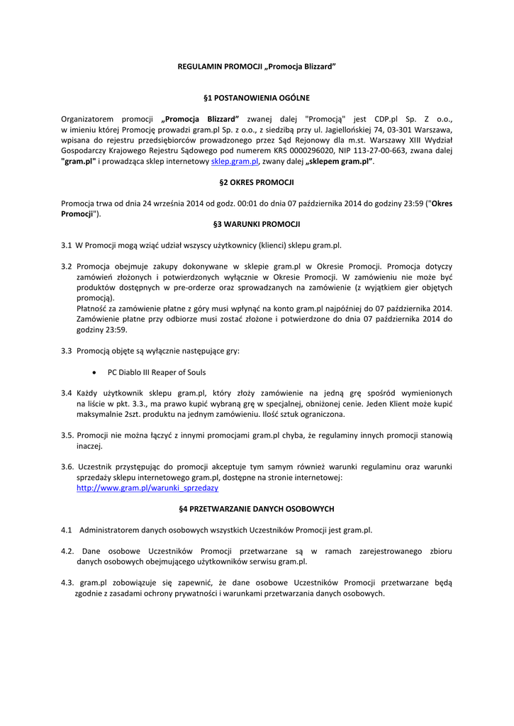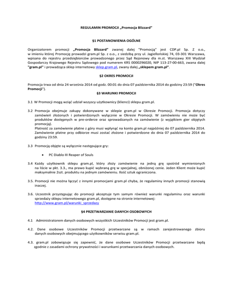 REGULAMIN PROMOCJI „Promocja Blizzard”