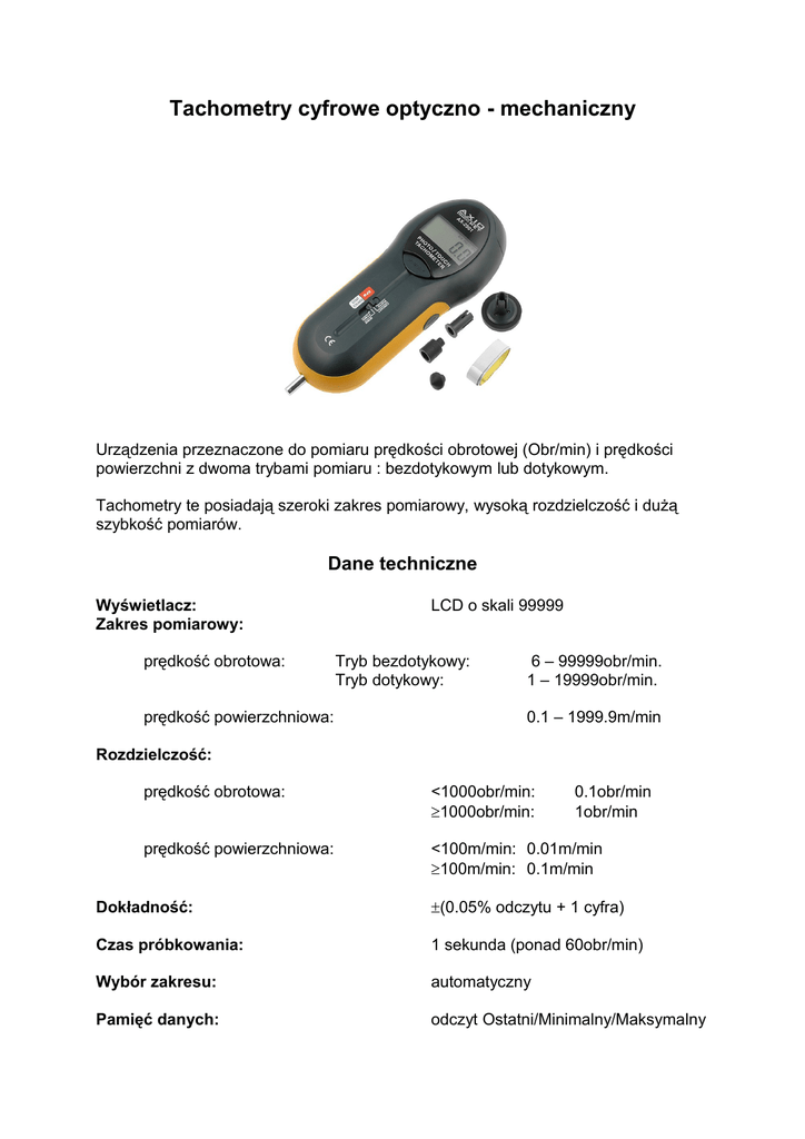 Tachometry cyfrowe optyczno - mechaniczny Urządzenia przeznaczone do pomiaru prędkości obrotowej (Obr/min) i prędkości powierzchni z dwoma trybami pomiaru : bezdotykowym lub dotykowym. Tachometry te posiadają szeroki zakres pomiarowy, wysoką rozdzielczość i dużą szybkość pomiarów. Dane techniczne Wyświetlacz: Zakres pomiarowy: prędkość obrotowa: prędkość powierzchniowa: LCD o skali 99999 Tryb bezdotykowy: Tryb dotykowy: 6 – 99999obr/min. 1 – 19999obr/min. 0.1 – 1999.9m/min Rozdzielczość: prędkość obrotowa: <1000obr/min: ≥1000obr/min: 0.1obr/min 1obr/min prędkość powierzchniowa: <100m/min: 0.01m/min ≥100m/min: 0.1m/min Dokładność: ±(0.05% odczytu + 1 cyfra) Czas próbkowania: 1 sekunda (ponad 60obr/min) Wybór zakresu: automatyczny Pamięć danych: odczyt Ostatni/Minimalny/Maksymalny Odległość pomiarowa w trybie bezdotykowym: 5cm – 20cm (w zależności od oświetlenia) Zasilanie: a. Baterie: 1.5V, AA (R6), 4 sztuki b. Zasilacz: napięcie wyjściowe DC6V (Uwaga: Możesz wybrać rodzaj zasilania) Temperatura pracy: 0 - 40°C, <85% wilgotności względnej Temperatura przechowywania: -10 - 50°C, <85% wilgotności względnej Wymiary: 217 x 84 x 43mm (tylko główne urządzenie) Waga: około 265g (wraz z bateriami)