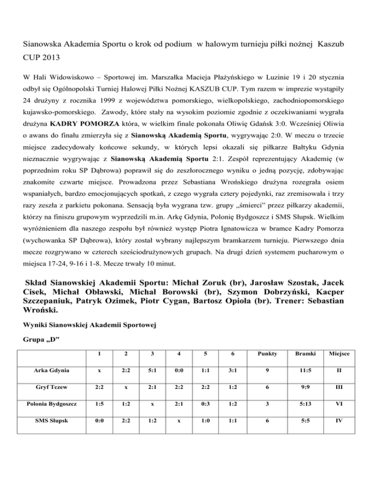 Sianowska Akademia Sportu o krok od podium w halowym turnieju piłki nożnej Kaszub CUP 2013 W Hali Widowiskowo – Sportowej im. Marszałka Macieja Płażyńskiego w Luzinie 19 i 20 stycznia odbył się Ogólnopolski Turniej Halowej Piłki Nożnej KASZUB CUP. Tym razem w imprezie wystąpiły 24 drużyny z rocznika 1999 z województwa pomorskiego, wielkopolskiego, zachodniopomorskiego kujawsko-pomorskiego. Zawody, które stały na wysokim poziomie zgodnie z oczekiwaniami wygrała drużyna KADRY POMORZA która, w wielkim finale pokonała Oliwię Gdańsk 3:0. Wcześniej Oliwia o awans do finału zmierzyła się z Sianowską Akademią Sportu, wygrywając 2:0. W meczu o trzecie miejsce zadecydowały końcowe sekundy, w których lepsi okazali się piłkarze Bałtyku Gdynia nieznacznie wygrywając z Sianowską Akademią Sportu 2:1. Zespół reprezentujący Akademię (w poprzednim roku SP Dąbrowa) poprawił się do zeszłorocznego wyniku o jedną pozycję, zdobywając znakomite czwarte miejsce. Prowadzona przez Sebastiana Wrońskiego drużyna rozegrała osiem wspaniałych, bardzo emocjonujących spotkań, z czego wygrała cztery pojedynki, raz zremisowała i trzy razy zeszła z parkietu pokonana. Sensacją była wygrana tzw. grupy „śmierci” przez piłkarzy akademii, którzy na finiszu grupowym wyprzedzili m.in. Arkę Gdynia, Polonię Bydgoszcz i SMS Słupsk. Wielkim wyróżnieniem dla naszego zespołu był również występ Piotra Ignatowicza w bramce Kadry Pomorza (wychowanka SP Dąbrowa), który został wybrany najlepszym bramkarzem turnieju. Pierwszego dnia mecze rozgrywano w czterech sześciodrużynowych grupach. Na drugi dzień systemem pucharowym o miejsca 17-24, 9-16 i 1-8. Mecze trwały 10 minut. Skład Sianowskiej Akademii Sportu: Michał Zoruk (br), Jarosław Szostak, Jacek Cisek, Michał Obławski, Michał Borowski (br), Szymon Dobrzyński, Kacper Szczepaniuk, Patryk Ozimek, Piotr Cygan, Bartosz Opioła (br). Trener: Sebastian Wroński. Wyniki Sianowskiej Akademii Sportowej Grupa „D” 1 2 3 4 5 6 Punkty Bramki Miejsce Arka Gdynia x 2:2 5:1 0:0 1:1 3:1 9 11:5 II Gryf Tczew 2:2 x 2:1 2:2 2:2 1:2 6 9:9 III Polonia Bydgoszcz 1:5 1:2 x 2:1 0:3 1:2 3 5:13 VI SMS Słupsk 0:0 2:2 1:2 x 1:0 1:1 6 5:5 IV Santos Gdańsk 1:1 2:2 3:0 0:1 X 0:1 5 6:5 VI Sianowska 1:3 2:1 2:1 1:1 1:0 X 10 7:6 I Akademia Sportu W ćwierćfinale zmagań zespół Sianowskiej Akademii Sportu pokonał UKS Cisowa Gdynia 2:0 Końcowa kolejność: 1. Kadra Pomorza 2. Oliwia Gdansk 3. Bałtyk Gdynia 4. Sianowska Akademia Sportu 5. Pruszcz Gdański 6. Anioły Garczegorze 7. Arka Gdynia 8. UKS Cisowa Gdynia 9. Gryf Wejherowo 10. Gryf Słupsk 11. GOSRIT Luzino 12. SMS Słupsk 13. Gryf Tczew 14. Wikęd Luzino 15. Oliwia II Gdańsk 16. GKS Sierakowice 17. Polonia Bydgoszcz 18. Santos Gdańsk 19. KTS-K LEW Lębork 20. GOSRIT 2000 Luzino 21. Bałtyk Gdynia II 22.Błękitni Gonne Małe 23.GOSRIT Girls Luzino 24.GKS Linia Zespół Akademii stanął na wysokości zadania, rozegrał kapitalne zawody, znakomicie w obronie, świetnie w ataku. Akcje były konstruowane bardzo mądrze z konsekwencją zachowań na każdym metrze boiska. Znakomita gra w turnieju naszych zawodników wzbudziła duże zainteresowanie wśród trenerów kadry Pomorskiego ZPN, oraz Arki Gdynia. Wielkie podziękowania składamy tym, dzięki którym mogliśmy spędzić dwa niezapomniane dni na ogólnopolskim turnieju: Firmie Dega, właścicielom: Stanisławowi Obławskiemu, Andrzejowi Borowskiemu i Krzysztofowi Modlińskiemu i prezesowi Sianowskiej Akademii Sportu Sebastanowi Boberowi oraz rodzicom poszczególnych dzieci. Tekst i zdjęcia: Sebastian Wroński