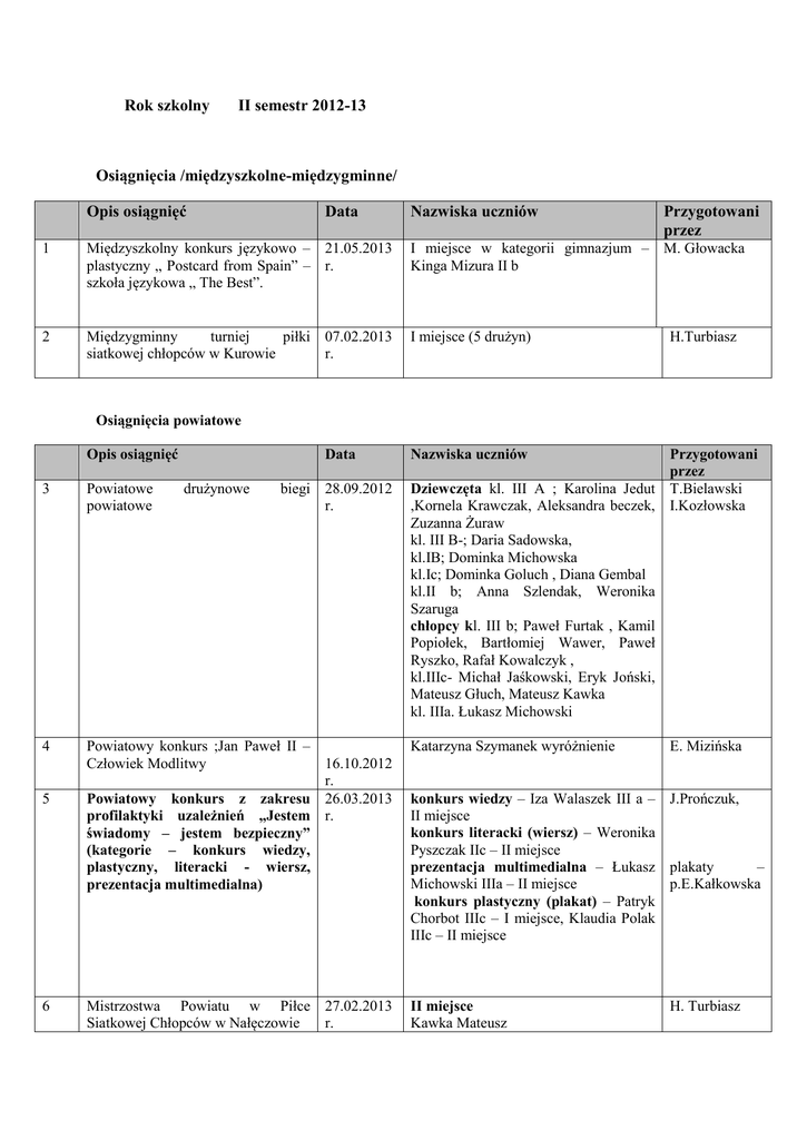 Rok szkolny II semestr 2012-13 Osiągnięcia /międzyszkolne-międzygminne/ Opis osiągnięć Data Nazwiska uczniów Przygotowani przez 1 Międzyszkolny konkurs językowo – 21.05.2013 plastyczny „ Postcard from Spain” – r. szkoła językowa „ The Best”. I miejsce w kategorii gimnazjum – M. Głowacka Kinga Mizura II b 2 Międzygminny turniej piłki 07.02.2013 siatkowej chłopców w Kurowie r. I miejsce (5 drużyn) H.Turbiasz Osiągnięcia powiatowe Opis osiągnięć Data Powiatowe powiatowe 4 Powiatowy konkurs ;Jan Paweł II – Człowiek Modlitwy 16.10.2012 r. Powiatowy konkurs z zakresu 26.03.2013 profilaktyki uzależnień „Jestem r. świadomy – jestem bezpieczny” (kategorie – konkurs wiedzy, plastyczny, literacki - wiersz, prezentacja multimedialna) Katarzyna Szymanek wyróżnienie Mistrzostwa Powiatu w Piłce 27.02.2013 Siatkowej Chłopców w Nałęczowie r. II miejsce Kawka Mateusz 6 biegi 28.09.2012 r. Przygotowani przez Dziewczęta kl. III A ; Karolina Jedut T.Bielawski ,Kornela Krawczak, Aleksandra beczek, I.Kozłowska Zuzanna Żuraw kl. III B-; Daria Sadowska, kl.IB; Dominka Michowska kl.Ic; Dominka Goluch , Diana Gembal kl.II b; Anna Szlendak, Weronika Szaruga chłopcy kl. III b; Paweł Furtak , Kamil Popiołek, Bartłomiej Wawer, Paweł Ryszko, Rafał Kowalczyk , kl.IIIc- Michał Jaśkowski, Eryk Joński, Mateusz Głuch, Mateusz Kawka kl. IIIa. Łukasz Michowski 3 5 drużynowe Nazwiska uczniów E. Mizińska konkurs wiedzy – Iza Walaszek III a – J.Prończuk, II miejsce konkurs literacki (wiersz) – Weronika Pyszczak IIc – II miejsce prezentacja multimedialna – Łukasz plakaty – Michowski IIIa – II miejsce p.E.Kałkowska konkurs plastyczny (plakat) – Patryk Chorbot IIIc – I miejsce, Klaudia Polak IIIc – II miejsce H. Turbiasz 7 Powiatowe zawody lekkoatletyczne 08.05.2013 sztafeta 4x100 r. 8 Powiatowy Konkurs Poezji „Poezja ks. Jana Twardowskiego” Góra Puławska Powiatowe zawody lekkoatletyczne w Puławach (indywidualne) 9 14.05.2013 r. 23.05.2013 r. Jaśkowski Michał Michowski Łukasz Joński Eryk Chorbot Eryk Jóźwicki Cezary Kowalczyk Kamil Beczek Jakub Kułaga Krystian Kozak Karol III miejsce dziewcząt: Daria Sadowska 3b , Aleksandra Beczek 3a ,Anna Szlendak 2b , Magdalena Szlendak 3c II miejsce chłopców : Eryk Joński 3c , Karol Kozak 1b , Jaśkowski Michał 3c , Jóźwicki Cezary 3a Grand Prix- Eryk Mikos kl.Ia Wyróżnienie – Magdalena Kozak kl.IIb T. Bielawski I.Kozłowska B. Matyjanka Leńczowska Popiołek Kamil, Kozak Karol, Zawisza T.Bielawski Paweł , Ziarek Tomasz , Jóźwiak I.Kozłowska Grzegorz , Joński Eryk (I miejsce na 300m) , Furtak Paweł , Kawka Mateusz , Jaśkowski Michał (3 miejsce w rzucie oszczepem) , Michowski Łukasz ( I miejsce na 1000m) , Jóźwicki Cezary, Kuta Jakub ( 3 miejsce w pchnięciu kulą) , Popiołek Kamil , Kowalczyk Rafał , Ryszko Paweł , Wawer Bartłomiej , Mikos Emila , Beczek Aleksandra , Osiak Anna , Żuraw Zuzanna , Jedut Karolina , Krawczak Kornelia , Szlendak Anna , Szlendak Magdalena Sztafeta 4x100m –Joński Eryk , Paweł Furtak , Jaśkowski Michał , Jóźwicki Cezary II miejsce Osiągnięcia rejonowe Opis osiągnięć 10 Data Powiatowe zawody lekkoatletyczne 23.05.2013r. w Puławach (indywidualne) Nazwiska uczniów Przygotowani przez Popiołek Kamil, Kozak Karol, T.Bielawski Zawisza Paweł , Ziarek Tomasz , I.Kozłowska Jóźwiak Grzegorz , Joński Eryk (I miejsce na 300m) , Furtak Paweł , Kawka Mateusz , Jaśkowski Michał (3 miejsce w rzucie oszczepem) , Michowski Łukasz ( I miejsce na 1000m) , Jóźwicki Cezary, Kuta Jakub ( 3 miejsce w pchnięciu kulą) , Popiołek Kamil , Kowalczyk Rafał , Ryszko Paweł , Wawer Bartłomiej , Mikos Emila , Beczek Aleksandra , Osiak Anna , Żuraw Zuzanna , Jedut Karolina , Krawczak Kornelia , Szlendak Anna , Szlendak Magdalena Sztafeta 4x100m –Joński Eryk , Paweł Furtak , Jaśkowski Michał , Jóźwicki Cezary II miejsce Osiągnięcia wojewódzkie Opis osiągnięć 11 12 13 14 15 16 Konkurs wojewódzki ,,Moje Narodzenie” Wojewódzki festiwal kolęd Data Boże Nazwiska uczniów Katarzyna Szymanek- wyróżnienie 17.12.2012r. 24.I.2013r. Wojewódzki konkurs Poezji Jana 8.04.2013r. Pawła II Wojewódzki konkurs plastyczny 8 .04.2013r. inspirowany wierszami Jana Pawła II Wojewódzki konkurs plastyczny i 26.04.2013r. fotograficzny w Słupsku Wojewódzkie zawody 04.06.2013r. lekkoatletyczne w Puławach (indywidualne) II nagroda- D. Kula III nagroda- J. Brocławik Klaudia Rułka I miejsce Eryk Mikos III miejsce II miejsce Anna Kędziora –III b, II miejsce Kinga -Grzegorzak kl.I a wyróżnienie Gabriela Jankowska –kl. Ia Wyróżnienie J.Kolbus Przygotowani przez E. Mizińska E. Kałkowska B.Madoń B.Matyjanka E. Kałkowska R.Biskup 7miejsce -Michowski Łukasz , I. Kozłowska Jaśkowski Michał , Joński Eryk , T. Bielawski Paweł Furtak (sztafeta „szwedzka”) 11miejsce –Joński Eryk (300m) 7miejsce – Michowski Łukasz (1000m) Osiągnięcia ogólnopolskie Opis osiągnięć Data Nazwiska uczniów Przygotowani przez 17 Ogólnopolskie biegi „O błękitną 03.05.2013r. wstęgę Wisły” z okazji 3 maja I miejsce Weronika Szaruga 2b miejsce Adrianna Szaruga 1a , miejsce Magdalena Zając 1a , miejsce Karolina Jedut 3a , miejsce Łukasz Michowski 3a 18 Ogólnopolski konkurs wiedzy o Janie Pawle II – 15.05.2013r. 19 45 Ogólnopolskie Puławskie Spotkania Lalkarzy- konkurs na lalkę 21 .05.2013r. 20 Ogólnopolski konkurs z j. polskiego Olimpus 7.03.2013 21 Ogólnopolski konkurs z chemii i 8.03.2013r. fizyki Olimpus Ośmiu uczestników otrzymało tytuł laureata. (8 miejsce)Paweł Wałach i Mateusz Błachnio z kl. Ia (12 miejsce) Kinga Mizura kl. IIb (13 miejsce) Paulina Jedut i Aleksandra Kamola z kl. IIc (13 miejsce) Daniel Kułaga kl. Ia (13 miejsce) Marta Borek kl. IIb (14 miejsce) Magdalena Kozak kl.IIb W konkursie wzięło udział 4966 uczestników z całej Polski Aleksandra Kwit Laureat I nagroda w kategorii młodzież gi