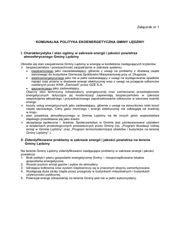 Załącznik nr 1 KOMUNALNA POLITYKA EKOENERGETYCZNA GMINY LĘDZINY I. Charakterystyka i stan ogólny w zakresie energii i jakości powietrza atmosferycznego Gminy Lędziny Określa się stan zaopatrzenia Gminy Lędziny w energię w kontekście następujących kryteriów: bezpieczeństwo i powszechność zaopatrzenia w zakresie systemu: • ciepłowniczego jako niezadawalający, głównie z uwagi na problemy z dostawą ciepła sieciowego do budynków Górniczej Spółdzielni Mieszkaniowej przy ul. Długosza. • elektroenergetycznego jako nie w pełni zadowalający z uwagi na występowanie spadków napięć oraz przerw w dostawie energii elektrycznej oraz z uwagi na przejęcie odbiorców zasilanych przez KWK „Ziemowit” przez GZE S.A. • gazowniczego jako zadawalający. Obecny stan techniczny infrastruktury energetycznej oraz zamierzenia przedsiębiorstw energetycznych dotyczące jej modernizacji zapewniają bezpieczeństwo w zakresie zaspokojenia aktualnego i przyszłościowego zapotrzebowania odbiorców w sieciowe nośniki energii. koszty usług energetycznych jako zadawalający, głównie z uwagi na stosunkowo niski koszt ciepła sieciowego. Ceny gazu ziemnego i energii elektrycznej nie odbiegają od średniej w kraju. stan powietrza atmosferycznego w Gminie Lędziny na tle innych gmin województwa śląskiego przedstawia się jako średni. akceptacja społeczna – średnia. Społeczeństwo w Gminie jest zainteresowane udziałem w działaniach proekologicznych prowadzonych przez Gminę (np. „Program likwidacji niskiej emisji w Gminie Lędziny” oraz „Program termomodernizacji obiektów i budynków na terenie Gminy Lędziny” ). II. Zidentyfikowane problemy w zakresie energii i jakości powietrza na terenie Gminy Lędziny Na terenie Gminy Lędziny zidentyfikowano następujące problemy w zakresie energii i jakości powietrza: 1. Brak polityki i planu gospodarki energetycznej Gminy – nieuporządkowana lokalna gospodarka energetyczna. 2. Wysoki poziom emisji gazów i pyłów do atmosfery. 3. Istniejąca kotłownia oraz system ciepłowniczy są w znacznym stopniu zamortyzowane. 4. Występują duŜe straty ciepła przez przegrody w budynkach mieszkalnych i budynkach uŜyteczności publicznej. 5. Potencjał energii odnawialnej na terenie Gminy jest nie w pełni wykorzystany. III. Gmina deklaruje podjęcie następujących działań w zakresie komunalnej polityki ekoenergetycznej: 1. Opracowanie i realizacja „Kompleksowego programu działań w zakresie energii i poprawy jakości powietrza w Gminie Lędziny”, na który składa się opracowanie i realizacja następujących zadań: 1.1 „ZałoŜenia do Planu …” i „Plan zaopatrzenia w ciepło, energię elektryczną i paliwa gazowe Gminy Lędziny” z uwzględnieniem zasad ochrony środowiska; 1.2 „Operacyjny plan polepszenia jakości powietrza w Gminie Lędziny”; 1.3 „Program likwidacji niskiej emisji w Gminie Lędziny”; 1.4 „Program likwidacji emisji pyłowo – gazowej w Gminie Lędziny”; 1.5 „Program termomodernizacji obiektów i budynków w Gminie Lędziny, powiązanej z modernizacją systemów ogrzewania – wynikającą z audytów energetycznych i planów etapizacji kompleksowej modernizacji energetycznej obiektów”; 1.6 „Program rozwoju lokalnej gospodarki energetycznej z wykorzystaniem odnawialnych źródeł energii na wybranych obszarach w Gminie Lędziny”; 1.7 „System Zarządzania Energią i Środowiskiem w Gminie Lędziny”. 2. Opracowanie i wdroŜenie programu ograniczenia emisji liniowej poprzez: • Realizację planu rozbudowy i modernizacji dróg istniejących, • Realizację planu budowy nowych dróg gminnych klasy „L” i „D”, • Uporządkowanie ruchu komunikacyjnego. 3. Opracowanie i realizacja programu edukacji ekologicznej w zakresie efektywnego uŜytkowania energii i ochrony powietrza w celu podniesienia świadomości ekologicznej mieszkańców. 4. Uporządkowanie i rozwój lokalnej gospodarki energetycznej z uwzględnieniem wykorzystania odnawialnych źródeł energii. 5. Sukcesywne zmniejszanie emisji zanieczyszczeń do atmosfery. 6. Rekultywacja powierzchni poprzemysłowych. zdegradowanych i rewitalizacja terenów 7. Prowadzenie działań w celu zapobiegania degradacji środowiska. 8. Prowadzenie działań mających na celu promocję oraz wspieranie w sposób pośredni lub bezpośredni przedsięwzięć przyjaznych środowisku, podejmowanych przez podmioty gospodarcze oraz mieszkańców np.: modernizacja lokalnych systemów grzewczych, stosowanie paliw ekologicznych, segregacja odpadów, zakładanie zieleni urządzonej itp.