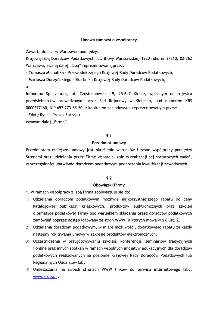Umowa ramowa o współpracy Zawarta dnia... w Warszawie pomiędzy: Krajową Izbą Doradców Podatkowych, ul. Bitwy Warszawskiej 1920 roku nr 3/310, 02-362 Warszawa, zwaną dalej „Izbą” reprezentowaną przez: - Tomasza Michalika - Przewodniczącego Krajowej Rady Doradców Podatkowych, - Mariusza Durzyńskiego - Skarbnika Krajowej Rady Doradców Podatkowych, a Infonetax Sp. z o.o., ul. Częstochowska 19, 25-647 Kielce, wpisanym do rejestru przedsiębiorców prowadzonym przez Sąd Rejonowy w Kielcach, pod numerem KRS 0000277160, NIP 657-273-65-50, z kapitałem zakładowym, reprezentowanym przez: - Edytę Rynk – Prezes Zarządu zwanym dalej „Firmą”. §1 Przedmiot umowy Przedmiotem niniejszej umowy jest określenie warunków i zasad współpracy pomiędzy Stronami oraz udzielania przez Firmę wsparcia Izbie w realizacji jej statutowych zadań, w szczególności ułatwianie doradcom podatkowym podnoszenia kwalifikacji zawodowych. §2 Obowiązki Firmy 1. W ramach współpracy z Izbą Firma zobowiązuje się do: 1) Udzielania doradcom podatkowym możliwie najkorzystniejszego rabatu od ceny katalogowej publikacji książkowych, produktów elektronicznych oraz szkoleń o tematyce podatkowej Firmy pod warunkiem składania przez doradców podatkowych zamówień poprzez dostęp logowany ze stron WWW, o których mowa w § 6 ust. 2. 2) Udzielania doradcom podatkowym, w miarę możliwości, dodatkowego rabatu za każdy następny rok trwania umowy w zakresie produktów elektronicznych. 3) Uczestniczenia w przygotowywaniu szkoleń, konferencji, seminariów tradycyjnych i online oraz innych spotkań w ramach wspólnych inicjatyw edukacyjnych dla doradców podatkowych realizowanych na poziomie Krajowej Rady Doradców Podatkowych lub Regionalnych Oddziałów Izby. 4) Umieszczania na swoich stronach WWW linków do serwisu internetowego Izby: www.krdp.pl . 2. Zasady współpracy, o których mowa w ust. 1, będą przedmiotem odrębnych umów między Stronami. §3 Obowiązki Izby 1. W ramach współpracy z Firmą Izba zobowiązuje się do: 1) w przypadku współpracy w ramach wspólnych inicjatyw Firmy z Krajową Radą Doradców Podatkowych lub Firmy z Regionalnymi Oddziałami Izby, umożliwić Firmie prezentację swoich produktów, 2) odpłatnego udostępnienia Firmie powierzchni reklamowej w Biuletynie Izby wydawanym w formie papierowej i elektronicznej na zasadach określonych w aktualnym Informatorze dla Reklamodawców Biuletynu Izby, 3) Izba umieści na swoich stronach WWW linki do serwisów internetowych Firmy: • www.infonetax.pl • www.doradcypodatkowi.ue • www.doradcapodatkowy.pl 2. Zasady współpracy, o których mowa w ust. 1, będą przedmiotem odrębnych umów między Stronami. 3. Izba poprzez mDoradcę poinformuje doradców podatkowych o szczegółach zawartej umowy z Firmą. §4 Reprezentanci Izby Szczegółowe zasady współpracy w zakresie: - konferencji, szkoleń, seminariów i innych spotkań doradców podatkowych oraz pozostałych wspólnych inicjatyw organizowanych przez Krajową Radę Doradców Podatkowych, będą ustalane pomiędzy Firmą a Prezydium KRDP reprezentowanym przez dwóch członków Prezydium KRDP, wskazanych w uchwale Krajowej Rady Doradców Podatkowych; - konferencji, szkoleń, seminariów i innych spotkań doradców podatkowych oraz pozostałych wspólnych inicjatyw organizowanych przez Regionalne Oddziały Izby będą ustalane pomiędzy Firmą a Zarządami Regionalnych Oddziałów Izby reprezentowanych przez ich Przewodniczących i Skarbników, (wzór ramowej umowy o współpracy stanowi załącznik do niniejszej umowy); - reklamy w biuletynach Izby będą ustalane pomiędzy Firmą a Przewodniczącym Kolegium Redakcyjnego Wydawnictw Izby. §5 1. Strony oświadczają, iż możliwa jest współpraca Stron w ramach innych niż wskazane powyżej inicjatywy, o ile nie będą one sprzeczne z celem zawarcia niniejszej umowy, jak również przepisami prawa wewnątrzkorporacyjnego i powszechnie obowiązującego. 2. Zasady współpracy, o której mowa w ust. 1 będą przedmiotem odrębnych umów pomiędzy Stronami. 3. Postanowienia niniejszej umowy (wraz z jej załącznikiem) w żaden sposób nie wiążą i nie ograniczają możliwości dokonania przez Zarządy Regionalnych Oddziałów Izby odmiennych uzgodnień w umowach o współpracy z Firmą, o ile tylko jej postanowienia nie będą sprzeczne z celem niniejszej umowy, określonym w §1, jak również przepisami prawa wewnątrzkorporacyjnego i prawa powszechnie obowiązującego. §6 Postanowienia końcowe 1. Umowa zostaje zawarta na czas nieokreślony z możliwością rozwiązania przez każdą ze stron z zachowaniem 3-miesięcznego okresu wypowiedzenia. 2. Strony ustalają komunikację między Firmą a doradcami podatkowymi wyłącznie poprzez dostęp logowany do internetowego systemu wspomagającego doradców podatkowych w kontaktach z Izbą mDoradca, https://mdoradca.krdp.pl/login.php . 3. Strony zobowiązują się do udziału w corocznych spotkaniach, mających na celu podsumowanie współpracy oraz omówienie pojawiających się problemów związanych z realizacją niniejszej umowy, a także ewentualne uzgodnienie form współpracy, o której mowa w § 5. 4. Wszelkie zmiany niniejszej umowy wymagają formy pisemnego aneksu pod rygorem nieważności. 5. Wszelkie oświadczenia, zawiadomienia i informacje przekazywane przez jedną ze stron drugiej stronie, winny być dokonywane w formie pisemnej lub elektronicznej na następujące adresy: Firma: Infonetax Sp. z o.o., ul. Częstochowska 19, 25-647 Kielce, [email protected] Izba: Krajową Izbą Doradców Podatkowych, ul. Bitwy Warszawskiej 1920 roku nr 3/310, 02-362 Warszawa, [email protected] . 6. W sprawach nieuregulowanych niniejszą umową będą miały zastosowanie przepisy Kodeksu Cywilnego. 7. Strony deklarują wolę polubownego rozwiązywania sporów, które mogą wyniknąć pomiędzy nimi w związku z wykonaniem umowy. W przypadku nie rozwiązania sporu na