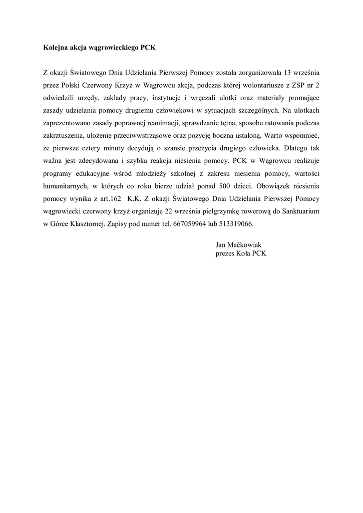 Kolejna akcja wągrowieckiego PCK Z okazji Światowego Dnia Udzielania Pierwszej Pomocy została zorganizowała 13 września przez Polski Czerwony Krzyż w Wągrowcu akcja, podczas której wolontariusze z ZSP nr 2 odwiedzili urzędy, zakłady pracy, instytucje i wręczali ulotki oraz materiały promujące zasady udzielania pomocy drugiemu człowiekowi w sytuacjach szczególnych. Na ulotkach zaprezentowano zasady poprawnej reanimacji, sprawdzanie tętna, sposobu ratowania podczas zakrztuszenia, ułożenie przeciwwstrząsowe oraz pozycję boczna ustaloną. Warto wspomnieć, że pierwsze cztery minuty decydują o szansie przeżycia drugiego człowieka. Dlatego tak ważna jest zdecydowana i szybka reakcja niesienia pomocy. PCK w Wągrowcu realizuje programy edukacyjne wśród młodzieży szkolnej z zakresu niesienia pomocy, wartości humanitarnych, w których co roku bierze udział ponad 500 dzieci. Obowiązek niesienia pomocy wynika z art.162 K.K. Z okazji Światowego Dnia Udzielania Pierwszej Pomocy wągrowiecki czerwony krzyż organizuje 22 września pielgrzymkę rowerową do Sanktuarium w Górce Klasztornej. Zapisy pod numer tel. 667059964 lub 513319066. Jan Maćkowiak prezes Koła PCK