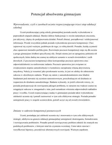 Potencjał absolwenta gimnazjum Wprowadzenie, czyli o zasobach ucznia rozpoczynającego trzeci etap edukacji szkolnej Uczeń przekraczający próg szkoły gimnazjalnej posiada zasoby wykształcone w poprzednich etapach edukacji. Bardzo dobrze funkcjonuje w swoim naturalnym otoczeniu, jest aktywny, chętny do podejmowania działań. Potrafi zbierać, porządkować i selekcjonować informacje. Przede wszystkim jednak posiada wykształcone poczucie kompetencji. Chce zajmować się czymś ważnym, podobnym do tego, co robią dorośli. Ponadto, każdą czynność chce opanować niemalże perfekcyjnie. Rozwinięte poczucie kompetencji staje się dla ucznia u progu gimnazjum źródłem specyficznej siły. Dzięki niemu jest on spragniony pełnienia ról społecznych, które dadzą mu szansę na zdobycie uznania w oczach rówieśników i osób dorosłych. Z poczuciem kompetencji silnie koresponduje poczucie sprawstwa oraz odpowiedzialności za realizowane zadania. Poczucie sprawstwa jest związane ze zwiększeniem stopnia samodzielności w kontekście zarządzania własną aktywnością umysłową. Należy je rozumieć jako przekonanie ucznia, że jest on zdolny do odniesienia sukcesu w określonym zadaniu. Wiąże się zatem z samodoskonaleniem oraz kładzie fundament pod stawanie się uczniem samosterownym, przechodzącym od działania ze wsparciem do działania samodzielnego. Badania wykazały, że jeżeli człowiek wierzy, że posiada predyspozycje do rozwiązania jakiegoś problemu, to zarazem ma większe szanse na osiągnięcie sukcesu w zmaganiach z nim, pod warunkiem włożenia odpowiednich nakładów pracy i wysiłku. Uczeń rozpoczynający naukę w gimnazjum posiada także wykształcone zdolności uczenia się i potrafi zastosować w tym celu efektywne strategie. Posiada ponadto umiejętność pracy w zespole uczniowskim, potrafi uczyć się od swoich rówieśników. Zmiany w zakresie kompetencji poznawczych Uczeń, posiadając już zdolność uczenia się i stosowania w tym celu efektywnych strategii, zdobywa na gruncie edukacji gimnazjalnej umiejętność dostrzegania, formułowania i rozwiązywania problemów. Ponadto potrafi rozwiązywany problem odnieść do znanych mu podobnych problemów, z którymi miał do czynienia wcześniej. Umie także stawiać i weryfikować hipotezy, poszukiwać alternatywnych rozwiązań. Ważnym aspektem dokonującej się zmiany poznawczej jest pojawienie się w zestawie umiejętności nastolatka logiki dedukcyjnej. Nowe zdolności poznawcze zmieniają także podejście nastolatków do podejmowania decyzji. Warto w doborze ofert edukacyjnych przewidzieć wystarczającą liczbę zróżnicowanych zadań rozwijających te nowe zdolności i możliwości nastolatków. Zmiany w zakresie kompetencji społecznych Uczeń w trakcie nauki w gimnazjum nabywa umiejętność podejmowania nowych ról społecznych oraz rozszerzania zakresu znanych mu już wcześniej. Zdobywa także społeczne kompetencje kluczowe oraz przygotowuje się do aktywnego życia w demokratycznym społeczeństwie. W okresie dorastania znacznie pogłębia się depresja u uczniów, na którą, jak wskazują badania, dziewczęta są bardziej podatne niż chłopcy. Przyczyn obniżenia nastroju upatruje się w braku akceptacji ze strony rówieśników, niskim poczuciu własnej wartości, wysokim poziomie życiowych zmian i stresu. Lęk egzaminacyjny gimnazjalisty i wyuczona bezradność to zagrożenia w tym okresie rozwoju i edukacji. Zmiany w zakresie kompetencji samoorganizacji Nauka w szkole gimnazjalnej jest dla ucznia drogą od pracy pod kierunkiem nauczyciela do samoregulacji. Poznaje on specyfikę działania metodą projektu, a więc uczy się organizowania własnej pracy i planowania jej w dłuższej perspektywie czasowej. Ponadto umie samodzielnie stawiać pytania i identyfikować problemy, a także wyciągać wnioski z własnych ewentualnych niepowodzeń. Zasoby ucznia kończącego trzeci etap edukacji Uczeń kończący gimnazjum posiada umiejętność dostrzegania i formułowania problemów. Potrafi napotkany problem odnieść do podobnych, już mu znanych, przeprowadzić jego analizę, postawić oraz zweryfikować hipotezę. Umie także poszukać alternatywnych rozwiązań, jeżeli obrany sposób okaże się niewłaściwy. Poznał specyfikę pracy metodą projektów, rozwinął umiejętności w kierunku samoregulacji. Uwzględnia perspektywę czasową, w niej samodzielnie planuje sobie zadania, z których zobowiązuje się wywiązać. Uczeń kończący trzeci etap edukacji potrafi także sam stawiać pytania i dochodzić do konkluzji, interpretując swoje ewentualne błędy i wyciągając z nich wnioski. Podsumowując, uczeń opuszczający gimnazjum posiada rozwinięte myślenie naukowe, które dotyczy w szczególności: wytwarzania pomysłów, zbierania i przetwarzania informacji, sprawdzania przyjętych założeń w badaniu. Kończąc szkołę gimnazjalną, młody człowiek posiada umiejętność podejmowania rozmaitych ról społecznych. Wyposażony jest także w kompetencje kluczowe, takie jak: porozumiewanie się w języku ojczystym, porozumiewanie się w językach obcych, kompetencje matematyczne i podstawowe kompetencje naukowotechniczne, kompetencje informatyczne, umiejętność uczenia się, kompetencje społeczne i obywatelskie, inicjatywność i przedsiębiorczość, świadomość i ekspresja kulturalna. Zmiany kompetencji społecznych nastolatka w ciągu trzeciego etapu edukacji (w gimnazjum) Kompetencje społeczne ucznia rozpoczynającego trzeci etap edukacji Umiejętność rozwiązywania problemów samodzielnie i we współpracy nie potrafi w pełni samodzielnie dostrzegać i formułować problemów, nie umie przeprowadzać analizy problemu drogą logiki dedukcyjnej, nie jest gotowy do stosowania operacji podstawowych w stosunku do przedmiotów rzeczywistych, nie potrafi umiejscawiać problemów wśród innych, nie potrafi stawiać i weryfikować hipotez, formułować wni