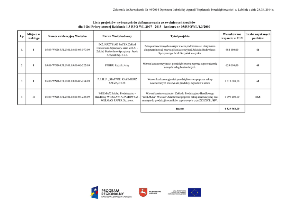 Załącznik do Zarządzenia Nr 40/2014 Dyrektora Lubelskiej Agencji Wspierania Przedsiębiorczości w Lublinie z dnia 28.03. 2014 r. Lista projektów wybranych do dofinansowania ze zwolnionych środków dla I Osi Priorytetowej Działania 1.3 RPO WL 2007 - 2013 - konkurs nr 05/RPOWL/1.3/2009 Lp Miejsce w rankingu Wnioskowane Liczba uzyskanych wsparcie w PLN punktów Numer ewidencyjny Wniosku Nazwa Wnioskodawcy Tytuł projektu Zakup nowoczesnych maszyn w celu podniesienia i utrzymania długoterminowej przewagi konkurencyjnej Zakładu BudowlanoSprzętowego Jacek Krzysiak na rynku. 684 150,00 61 1. I 05.09-WND-RPLU.01.03.00-06-070/09 INŻ. KRZYSIAK JACEK Zakład Budowlano-Sprzętowy skrót Z.B.S. Zakład Budowlano-Sprzętowy Jacek Krzysiak Sp. z o.o. 2 I 05.09-WND-RPLU.01.03.00-06-222/09 FPBHU Redzik Jerzy Wzrost konkurencyjności przedsiębiorstwa poprzez wprowadzenie nowych usług budowlanych. 633 010,00 61 3 I 05.09-WND-RPLU.01.03.00-06-254/09 P.P.H.U. ,,SIATPOL' KAZIMIERZ SZCZĄCHOR Wzrost konkurencyjności przedsiębiorstwa poprzez zakup nowoczesnych maszyn do produkcji wyrobów z drutu 1 513 608,00 61 4 II 05.09-WND-RPLU.01.03.00-06-226/09 1 999 200,00 59,5 WELMAX Zakład Produkcyjno Wzrost konkurencyjności Zakładu Produkcyjno-Handlowego Handlowy WIESŁAW ADAMOWICZ - "WELMAX" Wiesław Adamowicz poprzez zakup innowacyjnej linii WELMAX PAPER Sp. z o.o. maszyn do produkcji ręczników papierowych typu ZZ EXCLUSIV. Razem 4 829 968,00