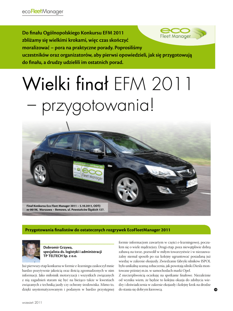 eco FleetManager Do finału Ogólnopolskiego Konkursu EFM 2011 zbliżamy się wielkimi krokami, więc czas skończyć moralizować – pora na praktyczne porady. Poprosiliśmy uczestników oraz organizatorów, aby pierwsi opowiedzieli, jak się przygotowują do finału, a drudzy udzielili im ostatnich porad. Wielki finał EFM 2011 – przygotowania! Finał Konkursu Eco Fleet Manager 2011 – 5.10.2011, ODTJ nr 001W, Warszawa – Bemowo, ul. Powstańców Śląskich 127. Przygotowania finalistów do ostatecznych rozgrywek EcoFleetManager 2011 Dobromir Grzywa, specjalista ds. logistyki i administracji TP TELTECH Sp. z o.o. Już pierwszy etap konkursu w formie e-learningu zaskoczył mnie bardzo pozytywnie jakością oraz ilością zgromadzonych w nim informacji. Jako miłośnik motoryzacji i wszystkich związanych z nią zagadnień staram się być na bieżąco także w kwestiach związanych z techniką jazdy czy ochrony środowiska. Mimo to, dzięki usystematyzowanym i podanym w bardzo przystępnej wrzesień 2011 formie informacjom zawartym w części e-learningowej, poczułem się o wiele mądrzejszy. Drugi etap, poza niewątpliwie dobrą zabawą na torze, pozwolił w miłym towarzystwie i w niezauważalny niemal sposób po raz kolejny ugruntować posiadaną już wiedzę w zakresie ekojazdy. Zwiedzanie fabryki silników ISPOL było unikalną szansą zobaczenia, jak powstają silniki Diesla montowane później m.in. w samochodach marki Opel. Z niecierpliwością oczekuję na spotkanie finałowe. Niezależnie od wyniku wiem, że będzie to kolejna okazja do zdobycia wiedzy i doświadczenia w zakresie ekojazdy i kolejny krok na drodze do stania się dobrym kierowcą. eco FleetManager Sebastian Zalewski, specjalista ds. floty samochodowej British American Tobacco Polska Trading Sp. z o.o. Pierwszy etap konkursu Eco Fleet Manager 2011 traktowałem jako dobrą zabawę. Udało się przejść egzamin pozytywnie i zakwalifikować do II etapu. Tu już nie było mowy o zabawie. Szczególnie jeśli chodzi o test z zakresu prawa o ruchu drogowym, który przysporzył mi nieco trudności. Konkurs na torze testowym był już czystą rywalizacją, a to lubię najbardziej. Z niecierpliwością czekam na finał i liczę na podium. Michał Piotrowski, specjalista ds. rozliczeń Intertransports Odkąd wziąłem udział w konkursie, staram się jeździć eko, cały czas ćwiczę, uczę się, koryguję swoje błędy, tak więc specjalnie nie przygotowuję się do finału. Co do pierwszych dwóch etapów, zarówno e-learning, jak i spotkanie półfinałowe w Tychach, oceniam je bardzo wysoko pod względem przygotowania przez organizatorów, przekazanej wiedzy teoretycznej i praktycznej, którą przyswoiłem, jak i konkurentów na wysokim poziomie eko. Jacek Kołakowski, naczelnik Wydziału Administracji w Banku Ochrony Środowiska S.A Jest mi niezmiernie miło, że znalazłem się w gronie finalistów konkursu Eco Fleet Manager 2011, jest to dla mnie niezwykle motywujące wyróżnienie. Konkurs daje możliwość weryfikacji własnych umiejętności z zakresu ekologicznej eksploatacji pojazdów, a przede wszystkim poznania wybitnych flotowców z całej Polski oraz świetnych fachowców z branży motoryzacyjnej wchodzących w skład grona sędziowskiego i organizacyjnego. Na szczególną uwagę zasługuje bardzo ciekawa formuła przedsięwzięcia – na początek platforma szkoleniowa i moje pierwsze dość krytyczne podejście: „no, bo cóż ja, stary wyjadacz, mogę się nowego dowiedzieć”. Jednak już po kilku pytaniach zmieniłem zdanie, wiele niezwykle ciekawych informacji przekazywanych w bardzo przystępnej formie przyczyniło się do dobrego wyniku testu, który kończył I etap konkursu, dla mnie zaś był przepustką do kolejnego etapu przyjemnych zmagań. Po kilku dniach miła wiadomość – zaproszenie na półfinał w Tychach. A tam spotkanie z koleżankami i kolegami po fachu, jurorami i organizatorami konkursu, wszyscy zrelaksowani, uśmiechnięci, żadnej atmosfery rywalizacji. Najpierw krótka prezentacja gospodarza półfinału – fabryki silników wysokoprężnych, nowoczesnej, innowacyjnej firmy, następnie omówienie spraw organizacyjnych, zajęcia z psychologii ekojazdy, zakończone kolejnym testem, następnie zwiedzanie fabryki silników, a potem praktyczne wykorzystanie umiejętności ekologicznej jazdy na torze testowym. Jurorzy skrzętnie zapisują wyniki, ale chętnie też udzielają praktycznych wskazówek, niestety, już po jeździe. Tutaj też nie odczuwa się atmosfery rywalizacji, raczej dobrej zabawy. Krótkie podsumowanie i do zobaczenia (miejmy nadzieję) w finale. Po pewnym czasie jeszcze milsza wiadomość – informacja zawierająca listę finalistów, na której wśród 15 nazwisk znalazło się i moje. Teraz pozostaje mi przygotować się do finałowego spotkania. Ciekawe tylko, czym teraz zaskoczą nas organizatorzy? Dlatego też trudno jest powiedzieć o specjalnej formie przygotowań z mojej strony, na pewno jest to szlifowanie nawyków ekologicznej jazdy w codziennej eksploatacji, z korzyścią dla portfela, jak i komfortu jazdy własnej i pasażerów i nie zapominając o ochronie środowiska naturalnego. Gdyby jeszcze nie te korki. Krzysztof Koszewski, administration manager ORIX Polska SA Osobiście przedsięwzięcie oceniam bardzo wysoko i cenię sobie nowe doświadczenia zdobyte podczas dwóch pierwszych etapów konkursu. Do tej pory spotykałem się z różnymi teoriami ekonomii oraz ekologii w transporcie drogowym. Zdobyta tu wiedza pozwoliła mi spojrzeć na temat z zupełnie innej strony. Zauważyłem, że jazda eko może być przyjemna i to nie tylko dla portfela, a kluczem do sukcesu w tej materii jest fachowa wiedza oraz samodyscyplina. Tomasz Szlęzak, Urząd Miasta Stołecznego Warszawy, Biuro AdministracyjnoGospodarcze Wydział Obsługi Transportowej Według mnie i kolegów z branży, z którymi rozmawiałem, uważam ten konkurs za duży krok w aktywn