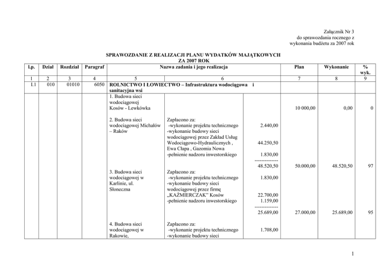 Załącznik Nr 3 do sprawozdania rocznego z wykonania budŜetu za 2007 rok l.p. Dział Rozdział 1 I.1 2 010 3 01010 SPRAWOZDANIE Z REALIZACJI PLANU WYDATKÓW MAJĄTKOWYCH ZA 2007 ROK Paragraf Nazwa zadania i jego realizacja 4 5 6 6050 ROLNICTWO I ŁOWIECTWO – Infrastruktura wodociągowa i sanitacyjna wsi 1. Budowa sieci wodociągowej Kosów - Lewkówka 2. Budowa sieci wodociągowej Michałów – Raków 3. Budowa sieci wodociągowej w Karlinie, ul. Słoneczna 4. Budowa sieci wodociągowej w Rakowie, Zapłacono za: -wykonanie projektu technicznego -wykonanie budowy sieci wodociągowej przez Zakład Usług Wodociągowo-Hydraulicznych , Ewa Cłapa , Gazomia Nowa -pełnienie nadzoru inwestorskiego Zapłacono za: -wykonanie projektu technicznego -wykonanie budowy sieci wodociągowej przez firmę „KAŹMIERCZAK” Kosów -pełnienie nadzoru inwestorskiego Zapłacono za: -wykonanie projektu technicznego -wykonanie budowy sieci Plan Wykonanie 7 8 % wyk. 9 10 000,00 0,00 0 50.000,00 48.520,50 97 27.000,00 25.689,00 95 2.440,00 44.250,50 1.830,00 -------------48.520,50 1.830,00 22.700,00 1.159,00 -------------25.689,00 1.708,00 1 ul. Moszczenicka wodociągowej przez Zakład Usług Wodociągowo-Hydraulicznych , Ewa Cłapa , Gazomia Nowa - pełnienie nadzoru inwestorskiego 5.Budowa sieci wodociągowej z przyłączem do budynku szatni GLKS Moszczenica Zapłacono za: -wykonanie budowy sieci wodociągowej przez Zakład Usług Wodociągowo-Hydraulicznych , Ewa Cłapa , Gazomia Nowa -pełnienie nadzoru inwestorskiego 6.Rozbudowa i modernizacja ujęcia wody w Jarostach Zapłacono za: -wykonanie map sytuacyjnowysokościowych -zakup, dostawa oraz wymiana złoŜa katalicznego 7. Budowa sieci wodociągowej w Srocku 8.Rozbudowa istniejącej oczyszczalni ścieków w Moszczenicy 9.Budowa sieci kanalizacji sanitarnej w Kosowie, ul. Leśna, ul. Batorówka, 16.630,00 1.220,00 ----------19.558,00 19.558,00 19.558,00 100 29.363,39 1.464,00 -----------30.827,39 31.000,00 30.827,39 99 17.436,00 17.436,00 100 30.000,00 2.928,00 10 33.000,00 32.964,00 100 976,00 16.460,00 -------------17.436,00 Zapłacono za: -wykonanie map sytuacyjnowysokościowych Zapłacono za: -wykonanie projektu technicznego -wypis z rejestru gruntu -opracowanie Studium Wykonalności Inwestycji Zapłacono za: -za uŜyczenie działek pod budowę sieci od J. Przybyła - wykonanie map d/c projektowych 29.280,00 24,00 3.660,00 -----------32.964,00 3.000,00 1.024,80 2 etap II -aktualizacja projektu zasilania przepompowni PN-3 i LP-1 -uzgodnienia ZUD -wykonanie sieci kanalizacji przez „BOLTOM” P-ków Tryb -odsetki od poŜyczki z WFOŚiGW w Łodzi - pełnienie nadzoru inwestorskiego -zakup tabliczek informacyjnych zgodnie z zapisami umowy z WFOŚiGW w Łodzi 10.Budowa sieci kanalizacji sanitarnej w Babach i Kiełczówce, etap II Przeniesiono środki na subkonto wydatków niewygasających z terminem wykonania wydatków do 30.06.2008r. w/g uchwały Nr XX/119/07 Rady Gminy Moszczenica z dnia 28.12.2007r. 11. Budowa sieci kanalizacji sanitarnej w Moszczenicy, ul. Dworcowa wraz z budową przyłącza kan. san. do budynku szatni GLKS Moszczenica Zapłacono za: -wykonanie analizy planowania efektu ekologicznego -uzgodnienia ZUD -wykonanie sieci kanalizacji sanitarnej przez firmę „DROGINś.” Piotrków Tryb -odsetki od poŜyczki z WFOŚiGW w Łodzi - pełnienie nadzoru inwestorskiego -zakup tabliczek informacyjnych zgodnie z zapisami umowy z WFOŚiGW w Łodzi 12. Budowa sieci kanalizacji 732,00 80,00 658.600,00 6.179,18 9.760,00 36,60 ----------679.412,58 680.000,00 679.412,58 100 148.000,00 145.180,00 98 202.000,00 194.686,79 96 305,00 80,00 192.199,10 1.578,09 488,00 36,60 -----------194.686,79 Zapłacono za: 3 sanitarnej w Kosowie, ul. Północna, etap III I.2 II.1 1. II.2 II.3 010 600 600 600 01010 60013 60014 60016 -wykonanie analizy planowanego efektu ekologicznego -uzgodnienia ZUD -wykonanie projektu technicznego Razem: 6060 1.Zakup gotowych dóbr – Zapłacono za: sieci wodociągowej w -sieć wodociągową w Babach, ul. Sieradzka Babach, ul. Sieradzka Razem: OGÓŁEM DZIAŁ:010 6050 TRANSPORT I ŁĄCZNOŚĆ-Drogi wojewódzkie Przebudowa drogi Zapłacono za: wojewódzkiej Nr716, ul. -wykonanie map sytuacyjnoPiotrkowska w wysokościowych Moszczenicy -wykonanie koncepcji przebudowy drogi Razem: 6800 Drogi powiatowe Rezerwa na inwestycjeprzebudowa dróg powiatowych Razem: 6050 Drogi publiczne gminne 1.Budowa drogi w Jarostach, ul. Miła Zapłacono za: -czynności notarialne (sporządzanie aktów notarialnych, odpisów, opłaty sądowe, wypisy) od nabycia gruntów pod drogę -opłata roczna za trwałe wyłączenie gruntów z produkcji rolniczej 305,00 110,00 11.031,00 -------------11.446,00 205.000,00 1.452.994,00 11.446,00 1.208.648,26 6 83 3.100,00 3.100 1.456.094,00 3.050,00 3.050,00 1.211.698,26 98 98 83 50.000,00 50.000,00 41.968,00 41.968,00 84 84 30.000,00 30.000,00 0,00 0,00 0 0 29.768,00 12.200,00 ----------41.968,00 35.932,91 4.603,40 4 -wypisy z rejestru gruntów do wniosku FOGR -wykonanie budowy drogi „PEUK” S.A. Piotrków Tryb. -usunięcie kolizji z istniejącymi ogrodzeniami -cegłę do usunięcia kolizji z istniejącymi ogrodzeniami -materiały budowlane do usunięcia kolizji z istniejącymi ogrodzeniami -piach do usunięcia kolizji z istniejącymi ogrodzeniami -wynajem koparko-ładowarki do usunięcia kolizji z istniejącymi ogrodzeniami -pełnienie nadzoru inwestorskiego -pełnienie nadzoru archeologicznego 2.Budowa drogi Białkowice – Gazomia Nowa Zapłacono za: -wypisy + wyrys z rejestru gruntów -wykonanie projektu technicznego -wykonanie budowy drogi „DRODINś.” Piotrków Tryb, etap I -prowizja od kredytu BOŚ S.A. Łódź -spłata odsetek od kredytu 3.Budowa drogi w Babach, ul. Sieradzka Zapłacono za -wykonanie projektu technicznego 4.Budowa drogi w Babach, ul. Wąska Zapłacono za: -wypisy z rejestru gruntów 168,00 1.849.520,00 48.500,38 4.563,96 4.509,12 585,60 4.565,85 6.100,00 5.000,00 ------------1.964.049,22 1