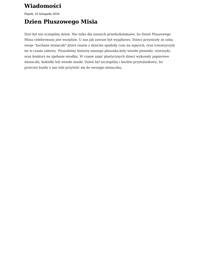 Wiadomości Piątek, 25 listopada 2016 Dzien Pluszowego Misia Dziś był ten sczególny dzień. Nie tylko dla naszych przedszkolakaów, bo Dzień Pluszowego Misia celebrowany jest wszędzie. U nas jak zawsze był wyjątkowo. Dzieci przyniosły ze sobą swoje "kochane misiaczki",które razem z dziećmi spędziły czas na zajęcich, oraz towarzyszyły im w czasie zabawy. Poznaliśmy historię naszego pluszaka,były wesołe piosenki, wierszyki, oraz konkurs na zjadanie miodku. W czasie zajęć plastycznych dzieci wykonały papierowe misiaczki, kukiełki lub wesołe maski. Dzień był szczególny i bardzo przytulankowy, bo przecież każdy z nas lubi przytulić się do swoejgo misiaczka,.
