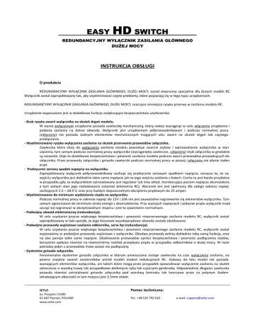 EASY HD SWITCH REDUNDANCYJNY WYŁĄCZNIK ZASILANIA GŁÓWNEGO DUŻEJ MOCY INSTRUKCJA OBSŁUGI O produkcie REDUNDANCYJNY WYŁĄCZNIK ZASILANIA GŁÓWNEGO, DUŻEJ MOCY, został stworzony specjalnie dla dużych modeli RC. Wyłącznik został zaprojektowany tak, aby wyeliminować częste problemy, które pojawiają się w tego typu urządzeniach. REDUNDANCYJNY WYŁĄCZNIK ZASILANIA GŁÓWNEGO, DUŻEJ MOCY, znacząco zmniejsza ryzyko przerwy w zasilaniu modelu RC. Urządzenie wyposażone jest w dodatkowe funkcje zwiększające bezpieczeństwo użytkownika: - Brak ryzyka awarii wyłącznika na skutek drgań modelu. W stanie wyłączonym urządzenie posiada zawleczkę mechaniczną, którą należy wyciągnąć w celu włączenia urządzenia i podania zasilania na dalsze obwody. Wyłącznik jest urządzeniem półprzewodnikowym i podczas normalnej pracy (załączony) nie posiada żadnych elementów mechanicznych mogących ulec awarii na skutek drgań lub częstego przełączania. - Wyeliminowano ryzyko wyłączenia zasilania na skutek przerwania przewodów załącznika. Zawleczka która służy do wyłączania zasilania modelu powoduje zwarcie styków i wprowadzenie wyłącznika w stan uśpienia, tym samym podczas normalnej pracy wyłącznika (wyciągniętej zawleczce, załączony) styki załącznika w gnieździe są rozwarte. Daje to dodatkowe bezpieczeństwo i pewność zasilania modelu podczas awarii przewodów prowadzących do załącznika. Przez przewody załącznika i gniazdo zawleczki podczas normalnej pracy w pozycji załączony nie płynie żaden prąd. - Praktycznie zerowy spadek napięcia na wyłączniku. Zaprojektowany wyłącznik półprzewodnikowy cechuje się praktycznie zerowym spadkiem napięcia, oznacza to, że na wyjściu wyłącznika jest dokładnie takie samo napięcie jak na jego wejściu zasilania z baterii. Cecha ta jest bardo przydatna w przypadku gdy za wyłącznikiem zainstalowany jest regulator lub inny układ, monitorujący poziom napięcia akumulatora a tym samym stan jego rozładowania (również telemetria RC). Warunek ten jest spełniony dla całego zakresu napięć zasilających 2.5 – 28.0 V, oraz przy każdym dopuszczalnym obciążeniu prądowym do 25 amper. - Wyeliminowano do minimum wydzielanie ciepła na wyłączniku. Podczas normalnej pracy w zakresie napięć do 12V i 10A nie jest zauważalne nagrzewanie się elementów wyłącznika. Tym samym ograniczono do minimum straty energii z akumulatorów. Przy wyższych napięciach i poborze prądu wyłącznik może zacząć się nagrzewać w akceptowalnym stopniu i jest to zjawiskiem normalnym. - Podwójny obwód elektroniczny (redundancja). W celu uzyskania jeszcze większego bezpieczeństwa i pewności nieprzerwanego zasilania modelu RC, wyłącznik został zaprojektowany w taki sposób, że jego kluczowe wysokoprądowe obwody zostały zdublowane. - Podwójne przewody wyjściowe zasilania odbiornika, serw itp (redundancja). W celu uzyskania jeszcze większego bezpieczeństwa i pewności nieprzerwanego zasilania modelu RC, wyłącznik został wyposażony w podwójne przewody wyjściowe z wyłącznika. Obydwa przewody pełnią dokładnie taką samą funkcję, oraz na obu panuje takie samo napięcie. Zdublowanie przewodów oprócz bezpieczeństwa i pewności podłączenia styków, korzystnie wpływa również na równomierny rozkład przepływu prądu w przypadku odbiorników o dużej mocy. W razie potrzeby jeden z przewodów może zostać nie podłączony. - Dyskretne gniazdo załącznika. Fenomenalne dyskretne gniazdo załącznika w którym umieszczana zostaje zawleczka na czas wyłączenia zasilania, na pewno znajdzie swoich zwolenników wśród modeli makiet redukcyjnych RC. Gotowy do lotu model nie posiada wystających elementów wyłącznika, ani takich które mogą przez przypadek spowodować wyłączenie zasilania na skutek zahaczenia o wysoką trawę lub przypadkowe dotknięcie ręką lub częściami garderoby. Odpowiedniej długości zawleczka pozwala również zainstalować gniazdo załącznika pod warstwą laminatu lub tworzywa przez co jedynym śladem zdradzającym obecność w tym miejscu jest 3.5mm otwór. SETLO os. Przyjaźni 13/80 61-687 Poznań, POLAND www.setlo.com Pomoc techniczna: Tel.: +48 535 792 010 e-mail: [email protected] - Dioda LED sygnalizująca stan pracy Wyraźnie widoczna i jednocześnie dyskretna (3.0 mm średnicy) dioda sygnalizuje kiedy układ zasilania jest załączony. Dioda wyposażona jest w klips ułatwiający jej instalacje w poszyciu modelu. - Wysokiej jakości przewody zasilania Przewody wejściowe zasilania po stronie baterii są wysokiej klasy przewodami w izolacji silikonowej. Przewody te mają przekrój żyły 1.0 mm2 (17AWG). Natomiast przewody zasilające odbiornik po stronie wyjściowej wyłącznika są wysokiej klasy przewodami w izolacji PVC o przekroju żyły 0.75 mm2 (18AWG). - Szeroki zakres napięć zasilania Urządzenie działa poprawnie w zakresie 2.5 – 28.0 V. Maksymalny dozwolony prąd to 25.0 Amper. Przy skrajnych wartościach wyłącznik jest w stanie przenieść moc równa 700W! - Nie ma potrzeby rozłączania baterii od wyłącznika Prąd upływnościowy baterii podczas wyłączonego urządzenia wynosi tylko! 23uA (mikro Amper) przy 6.0V. Oraz 104uA przy 28V. Oznacza to że przy baterii 3000mAh, 6V bateria rozładowała by się całkowicie po ponad 14latach! Jest to wielokrotnie mniejszą wartością niż samorozładowanie się baterii podczas przechowywania. W przypadku zastosowania baterii z odczepem przewodów do ładowania, również nie ma potrzeby rozłączania baterii i wyłącznika na czas ładowania, istotne jest wtedy aby wyłącznik był w stanie wyłączonym (zawleczka umieszczona w gnieździe). Dane techniczne - wymiary: 35.0 mm x 18.0 mm x 5.0 mm - masa: 10.0 gram - RX złacze wyj.: Futaba/JR żeński 2x18AWG (0.75mm2) przewód 150 mm PVC - BAT złącze wej.: 17AWG (1.0 mm2) przewód 150 mm silikonowy - pracuje z: Ni-Cd, Ni-Mh, Li-P