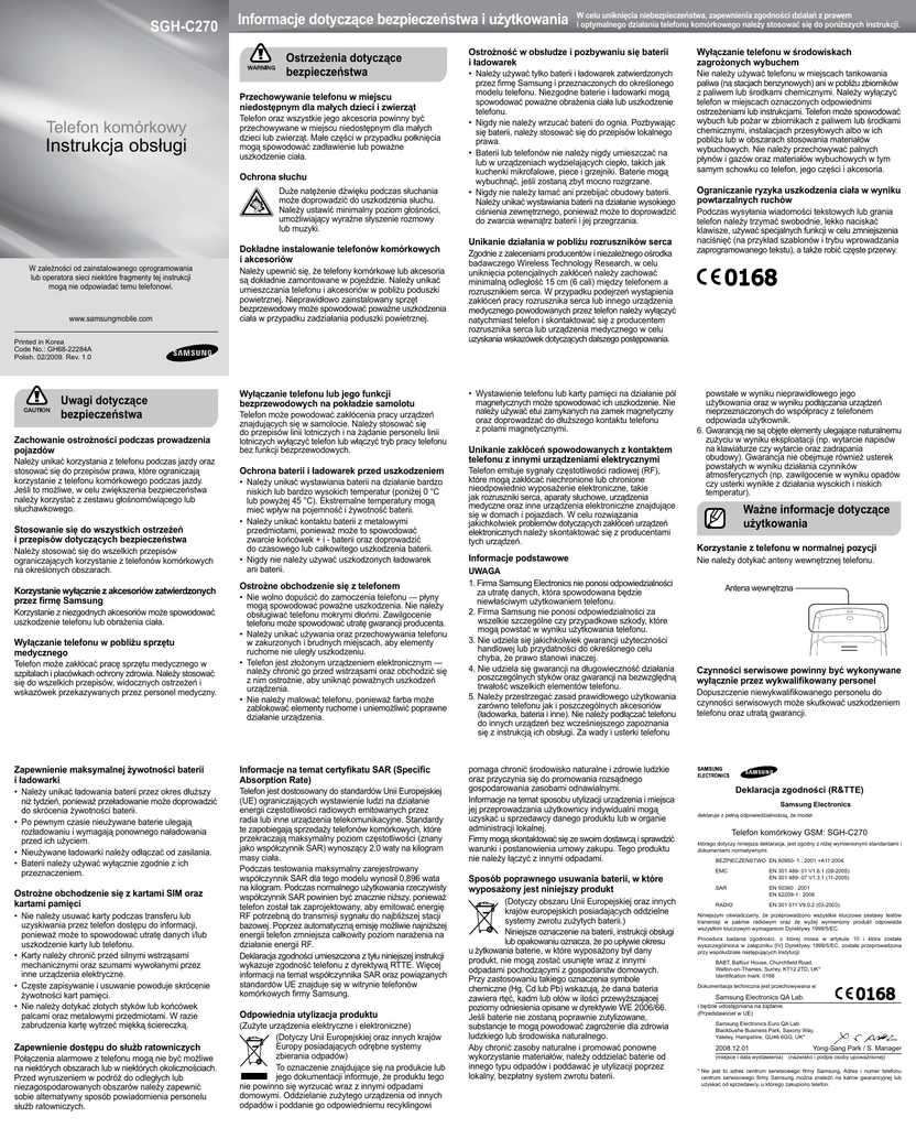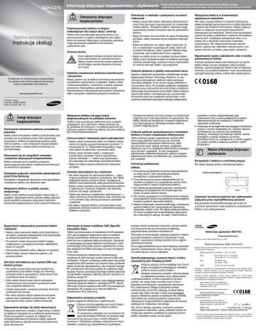 SGH-C270 Informacje dotyczące bezpieczeństwa i użytkowania Ostrzeżenia dotyczące bezpieczeństwa Przechowywanie telefonu w miejscu niedostępnym dla małych dzieci i zwierząt Telefon komórkowy Instrukcja obsługi Telefon oraz wszystkie jego akcesoria powinny być przechowywane w miejscu niedostępnym dla małych dzieci lub zwierząt. Małe części w przypadku połknięcia mogą spowodować zadławienie lub poważne uszkodzenie ciała. Ochrona słuchu Duże natężenie dźwięku podczas słuchania może doprowadzić do uszkodzenia słuchu. Należy ustawić minimalny poziom głośności, umożliwiający wyraźne słyszenie rozmowy lub muzyki. W zależności od zainstalowanego oprogramowania lub operatora sieci niektóre fragmenty tej instrukcji mogą nie odpowiadać temu telefonowi. www.samsungmobile.com Dokładne instalowanie telefonów komórkowych i akcesoriów Należy upewnić się, że telefony komórkowe lub akcesoria są dokładnie zamontowane w pojeździe. Należy unikać umieszczania telefonu i akcesoriów w pobliżu poduszki powietrznej. Nieprawidłowo zainstalowany sprzęt bezprzewodowy może spowodować poważne uszkodzenia ciała w przypadku zadziałania poduszki powietrznej. Printed in Korea Code No.: GH68-22284A Polish. 02/2009. Rev. 1.0 Uwagi dotyczące bezpieczeństwa Zachowanie ostrożności podczas prowadzenia pojazdów Należy unikać korzystania z telefonu podczas jazdy oraz stosować się do przepisów prawa, które ograniczają korzystanie z telefonu komórkowego podczas jazdy. Jeśli to możliwe, w celu zwiększenia bezpieczeństwa należy korzystać z zestawu głośnomówiącego lub słuchawkowego. Stosowanie się do wszystkich ostrzeżeń i przepisów dotyczących bezpieczeństwa Należy stosować się do wszelkich przepisów ograniczających korzystanie z telefonów komórkowych na określonych obszarach. Korzystanie wyłącznie z akcesoriów zatwierdzonych przez firmę Samsung Korzystanie z niezgodnych akcesoriów może spowodować uszkodzenie telefonu lub obrażenia ciała. Wyłączanie telefonu w pobliżu sprzętu medycznego Telefon może zakłócać pracę sprzętu medycznego w szpitalach i placówkach ochrony zdrowia. Należy stosować się do wszelkich przepisów, widocznych ostrzeżeń i wskazówek przekazywanych przez personel medyczny. Zapewnienie maksymalnej żywotności baterii i ładowarki • Należy unikać ładowania baterii przez okres dłuższy niż tydzień, ponieważ przeładowanie może doprowadzić do skrócenia żywotności baterii. • Po pewnym czasie nieużywane baterie ulegają rozładowaniu i wymagają ponownego naładowania przed ich użyciem. • Nieużywane ładowarki należy odłączać od zasilania. • Baterii należy używać wyłącznie zgodnie z ich przeznaczeniem. Ostrożne obchodzenie się z kartami SIM oraz kartami pamięci • Nie należy usuwać karty podczas transferu lub uzyskiwania przez telefon dostępu do informacji, ponieważ może to spowodować utratę danych i/lub uszkodzenie karty lub telefonu. • Karty należy chronić przed silnymi wstrząsami mechanicznymi oraz szumami wywołanymi przez inne urządzenia elektryczne. • Częste zapisywanie i usuwanie powoduje skrócenie żywotności kart pamięci. • Nie należy dotykać złotych styków lub końcówek palcami oraz metalowymi przedmiotami. W razie zabrudzenia kartę wytrzeć miękką ściereczką. Zapewnienie dostępu do służb ratowniczych Połączenia alarmowe z telefonu mogą nie być możliwe na niektórych obszarach lub w niektórych okolicznościach. Przed wyruszeniem w podróż do odległych lub niezagospodarowanych obszarów należy zapewnić sobie alternatywny sposób powiadomienia personelu służb ratowniczych. Wyłączanie telefonu lub jego funkcji bezprzewodowych na pokładzie samolotu Telefon może powodować zakłócenia pracy urządzeń znajdujących się w samolocie. Należy stosować się do przepisów linii lotniczych i na żądanie personelu linii lotniczych wyłączyć telefon lub włączyć tryb pracy telefonu bez funkcji bezprzewodowych. Ochrona baterii i ładowarek przed uszkodzeniem • Należy unikać wystawiania baterii na działanie bardzo niskich lub bardzo wysokich temperatur (poniżej 0 °C lub powyżej 45 °C). Ekstremalne temperatury mogą mieć wpływ na pojemność i żywotność baterii. • Należy unikać kontaktu baterii z metalowymi przedmiotami, ponieważ może to spowodować zwarcie końcówek + i - baterii oraz doprowadzić do czasowego lub całkowitego uszkodzenia baterii. • Nigdy nie należy używać uszkodzonych ładowarek ani baterii. Ostrożne obchodzenie się z telefonem • Nie wolno dopuścić do zamoczenia telefonu — płyny mogą spowodować poważne uszkodzenia. Nie należy obsługiwać telefonu mokrymi dłońmi. Zawilgocenie telefonu może spowodować utratę gwarancji producenta. • Należy unikać używania oraz przechowywania telefonu w zakurzonych i brudnych miejscach, aby elementy ruchome nie uległy uszkodzeniu. • Telefon jest złożonym urządzeniem elektronicznym — należy chronić go przed wstrząsami oraz obchodzić się z nim ostrożnie, aby uniknąć poważnych uszkodzeń urządzenia. • Nie należy malować telefonu, ponieważ farba może zablokować elementy ruchome i uniemożliwić poprawne działanie urządzenia. Informacje na temat certyfikatu SAR (Specific Absorption Rate) Telefon jest dostosowany do standardów Unii Europejskiej (UE) ograniczających wystawienie ludzi na działanie energii częstotliwości radiowych emitowanych przez radia lub inne urządzenia telekomunikacyjne. Standardy te zapobiegają sprzedaży telefonów komórkowych, które przekraczają maksymalny poziom częstotliwości (znany jako współczynnik SAR) wynoszący 2,0 waty na kilogram masy ciała. Podczas testowania maksymalny zarejestrowany współczynnik SAR dla tego modelu wynosił 0,896 wata na kilogram. Podczas normalnego użytkowania rzeczywisty współczynnik SAR powinien być znacznie ni