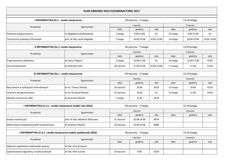 PLAN ZIMOWEJ SESJI EGZAMINACYJNEJ 2017 I INFORMATYKA (lic.) - studia stacjonarne Przedmiot Egzaminator 30 stycznia - 7 lutego 13-19 lutego I termin II termin data godzina sala data godzina sala Podstawy programowania dr Magdalena Andrzejewska 1 lutego 9.00-12.00 A1 15 lutego 9.00-12.00 A1 Teoretyczne podstawy informatyki prof. dr hab. Jacek Migdałek 7 lutego 10.00-14.00 412N, 413N 14 lutego 10.00-14.00 412N, 413N II INFORMATYKA (lic.)- studia stacjonarne Przedmiot Egzaminator 30 stycznia - 7 lutego 13-19 lutego I termin II termin data godzina sala data godzina sala Programowanie obiektowe dr Łukasz Stępień 2 lutego 12.00-17.00 A1 14 lutego 13.00-17.00 421N Sieci komputerowe dr Wojciech Folta 30 stycznia 11.00-14.00 412N, 413N 17 lutego 11.00 412N III INFORMATYKA (lic.) - studia stacjonarne Przedmiot Egzaminator 30 stycznia - 7 lutego 13-19 lutego I termin II termin data godzina sala data godzina sala Bazy danych w aplikacjach internetowych dr inż. Tomasz Hachaj 30 stycznia 10.00 421N 13 lutego 10.00 421N Inżynieria oprogramowania dr inż. Krzysztof Mazela 31 stycznia 10.30 A1 15 lutego 11.00 421N Metody numeryczne (ASI) dr Kazimierz Rajchel 1 lutego 11.00 421N I INFORMATYKA (2 st.) - studia stacjonarne (nabór luty 2016) Przedmiot Egzaminator 30 stycznia - 7 lutego 13-19 lutego I termin II termin data godzina sala Analiza numeryczna prof. dr hab. Władimir Mitiuszew 31 stycznia 10.00-14.00 407N Matematyczne podstawy grafiki komputerowej dr Kazimierz Rajchel 30 stycznia 10.00-14.00 408N I INFORMATYKA (2 st.) - studia stacjonarne (nabór październik 2016) Przedmiot Egzaminator Wybrane zagadnienia matematyki wyższej dr hab. Jerzy Szczęsny Zaawansowane algorytmy i struktury danych dr hab. Piotr Czerski data godzina 30 stycznia - 7 lutego 13-19 lutego I termin II termin data godzina sala 26 stycznia 9.00 421N data godzina sala sala